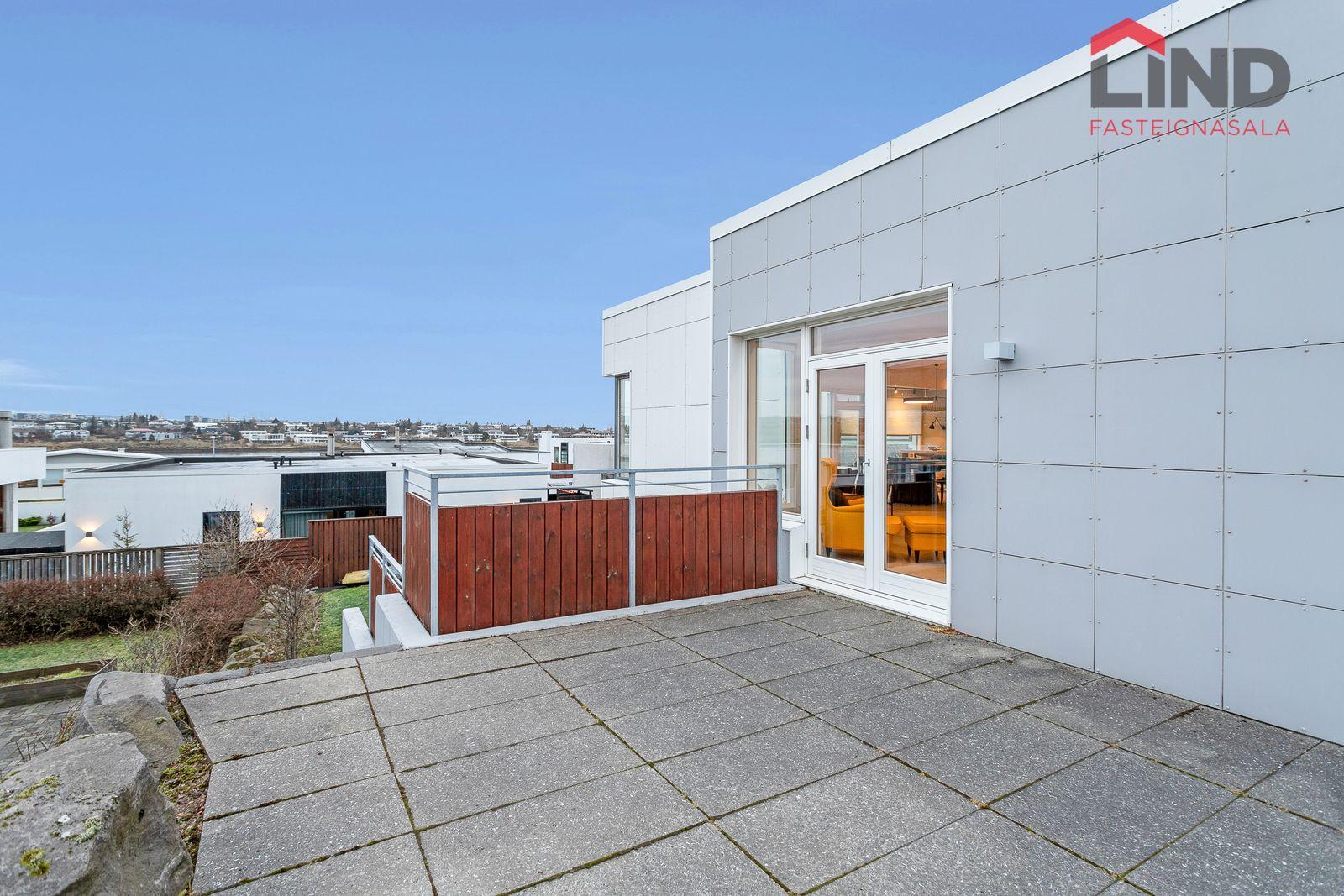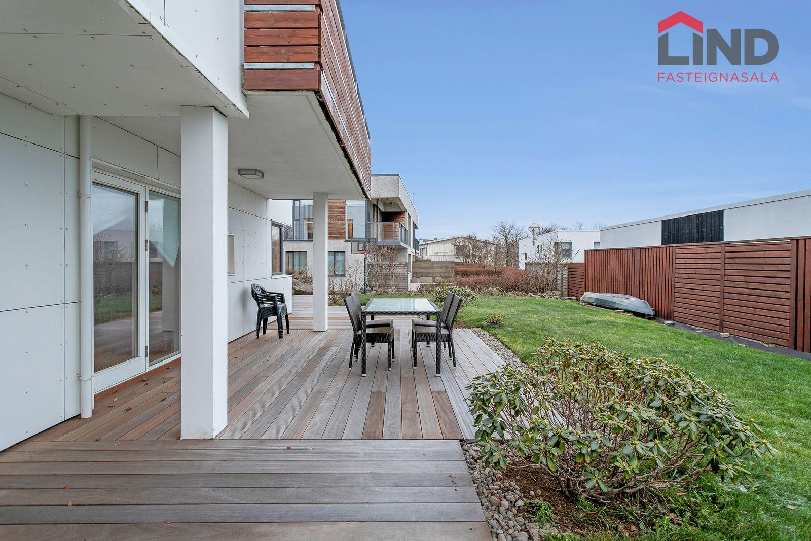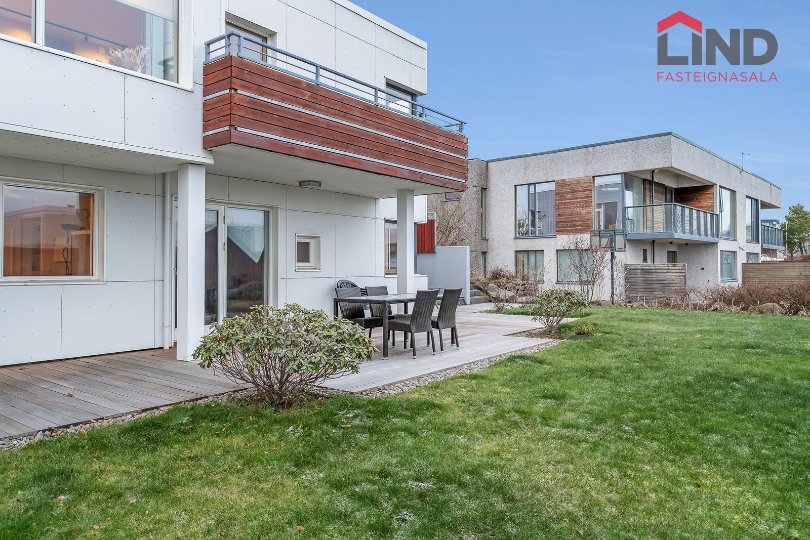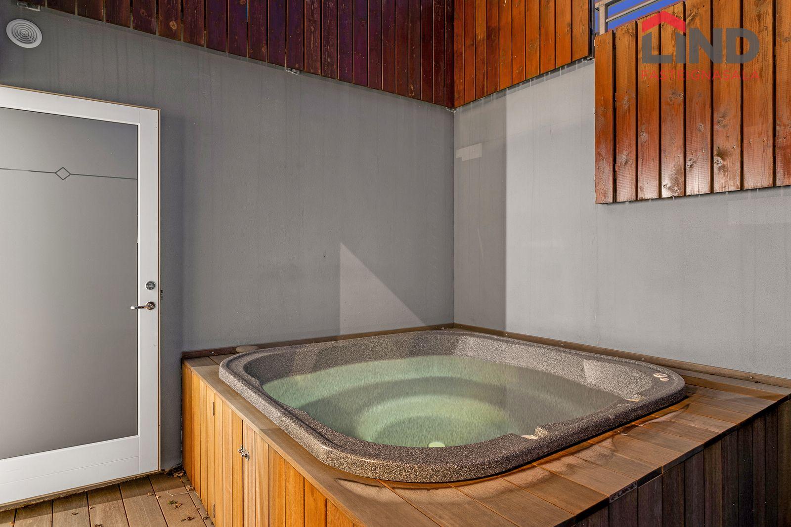 Lóð: Stæði hellulagt með hitalögn. Harðviðarpallur með heitum potti og grasflöt.