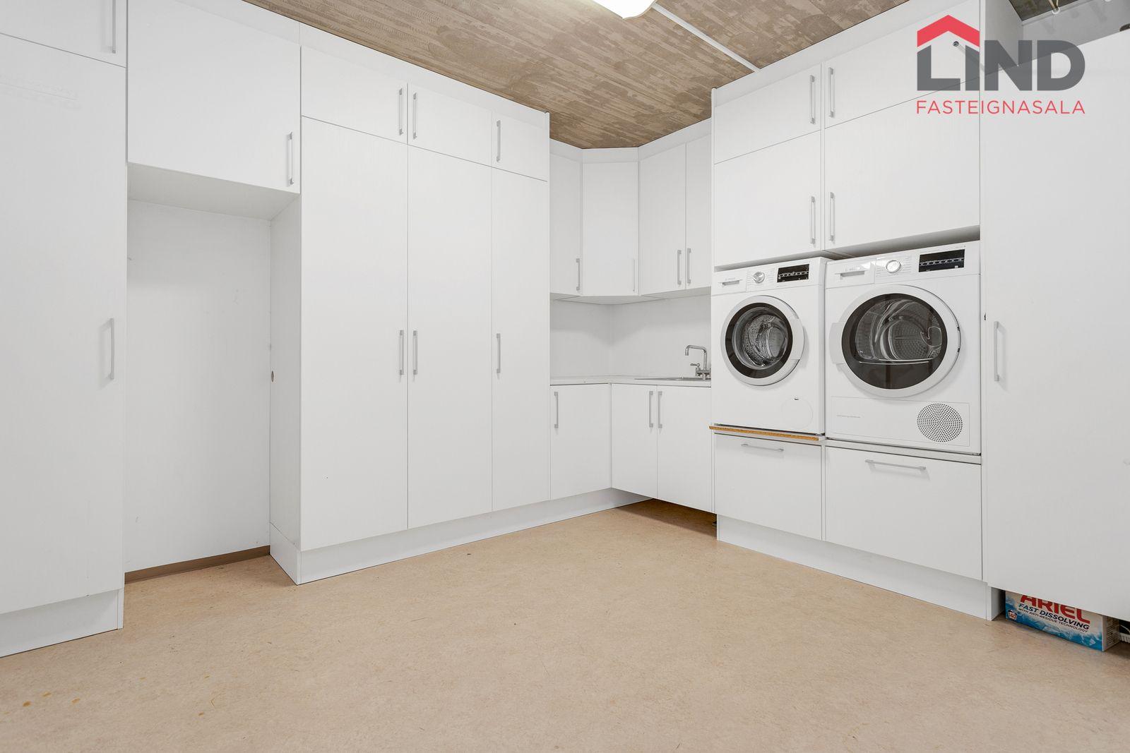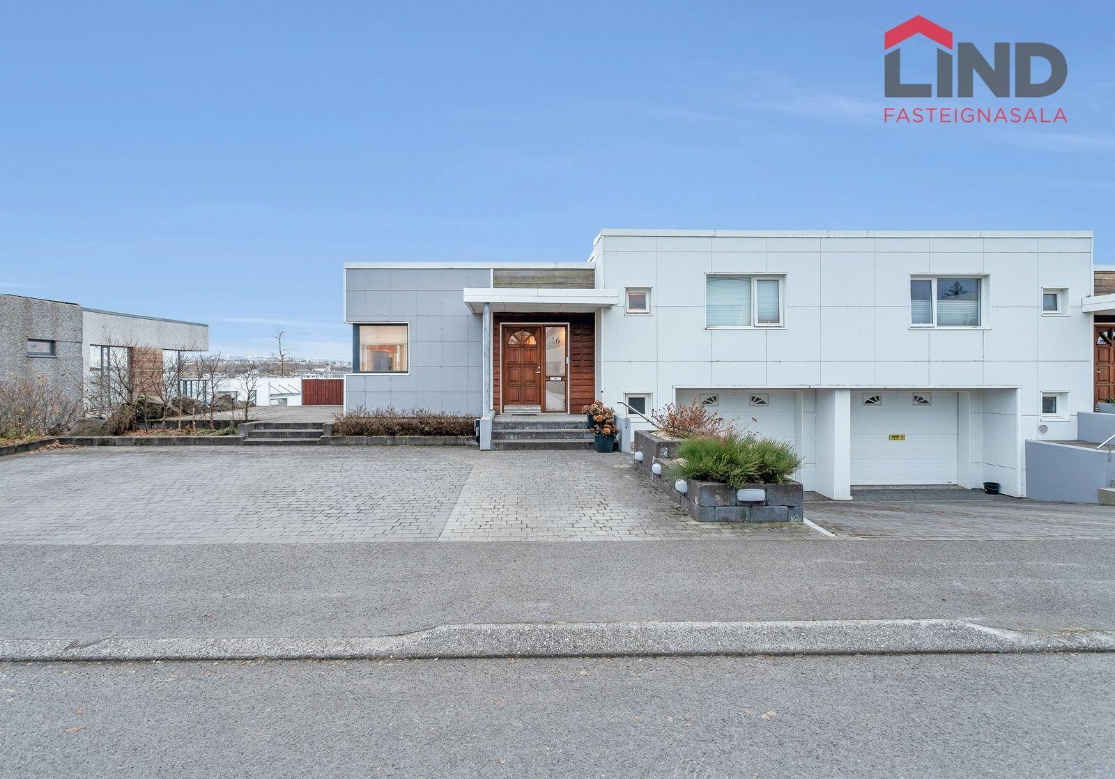 Lýsing: Stofa/borðstofa: Flísalögð með fallegum arni, opin inn í eldhús. Eldhús: Flísalagt með glæsilegri sérsmíðaðri innréttingu, stein borðplötu og útgengi á svalir. Sjónvarpsstofa: Flísalögð með sérsmíðuðum innréttingum og útgengi á pall. Forstofa: Flísalögð með sérsmíðuðum skápum. Gestasalerni: Flísalagt með salerni og vaski, er innaf forstofu. Hjónaherbergi: Rúmgott, með fataherbergi innaf. Baðherbergi (við hlið hjónaherbergis): Með sturtu, baðkari, salerni og innréttingu. Bílskúr: Með bílskúrshurðaopnara. Geymsla I: Gengið í gegnum geymslu inn í bílskúr. Svefnherbergi II: Rúmgott með parketi á gólfi. Svefnherbergi III: Rúmgott með parketi á gólfi og útgengi á pall. Svefnherbergi IV: Rúmgott með parketi á gólfi. Baðherbergi II: Með sturtu, salerni og innréttingu, útgengi á pall. Hol: Tilvalið sem heimaskrifstofa. Þvottahús: Mjög rúmgott með góðri innréttingu og skolpvaski. Geymsla II: Mjög rúmgóð, er innaf þvottahúsi.