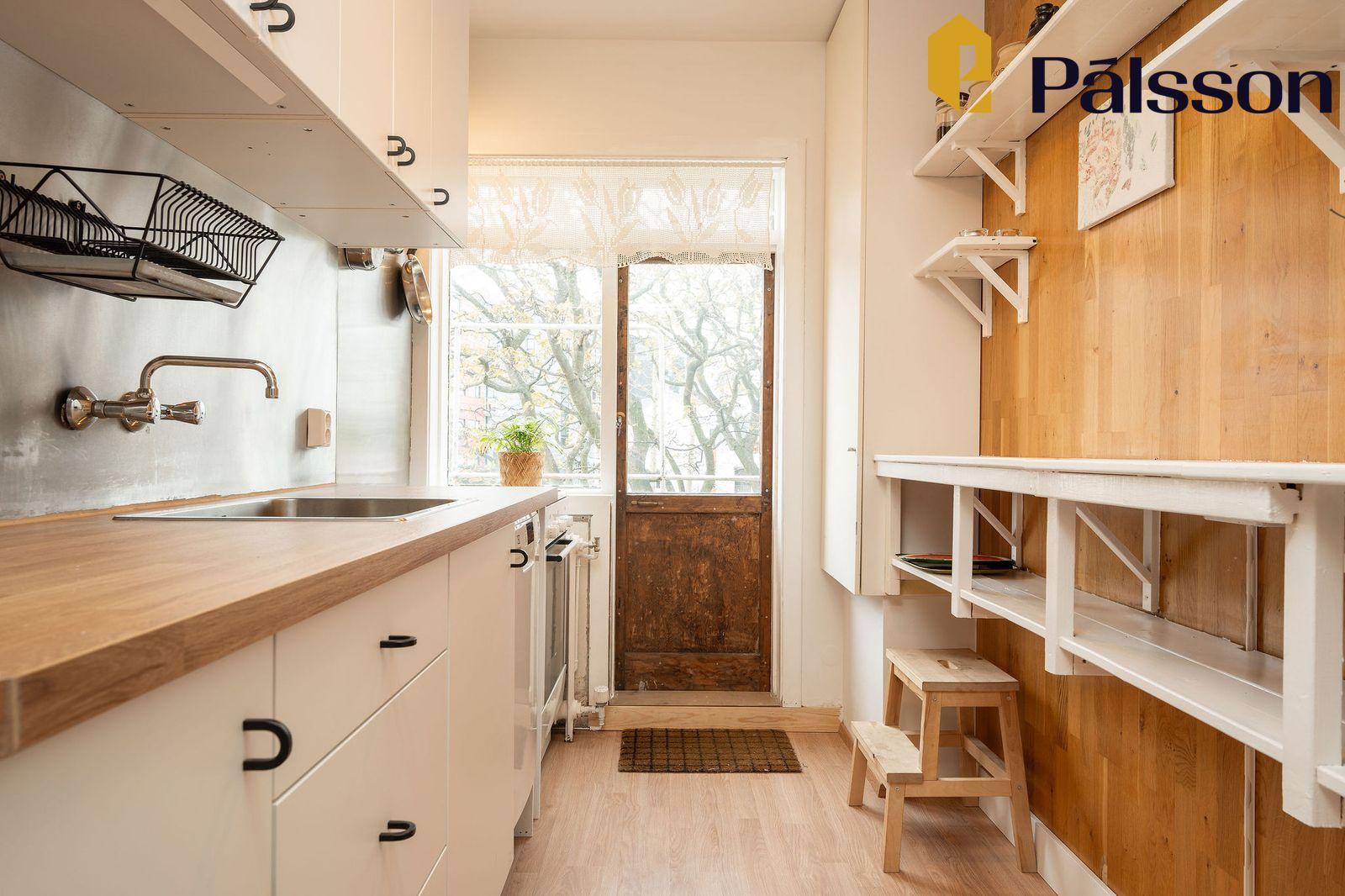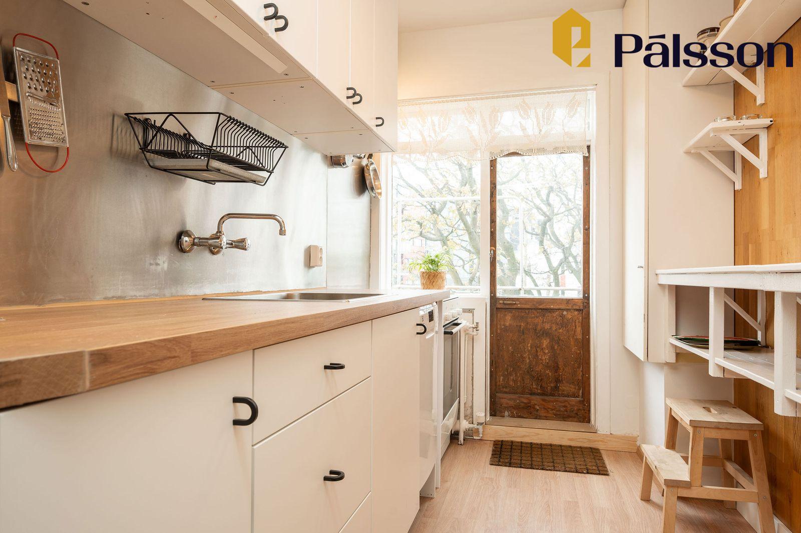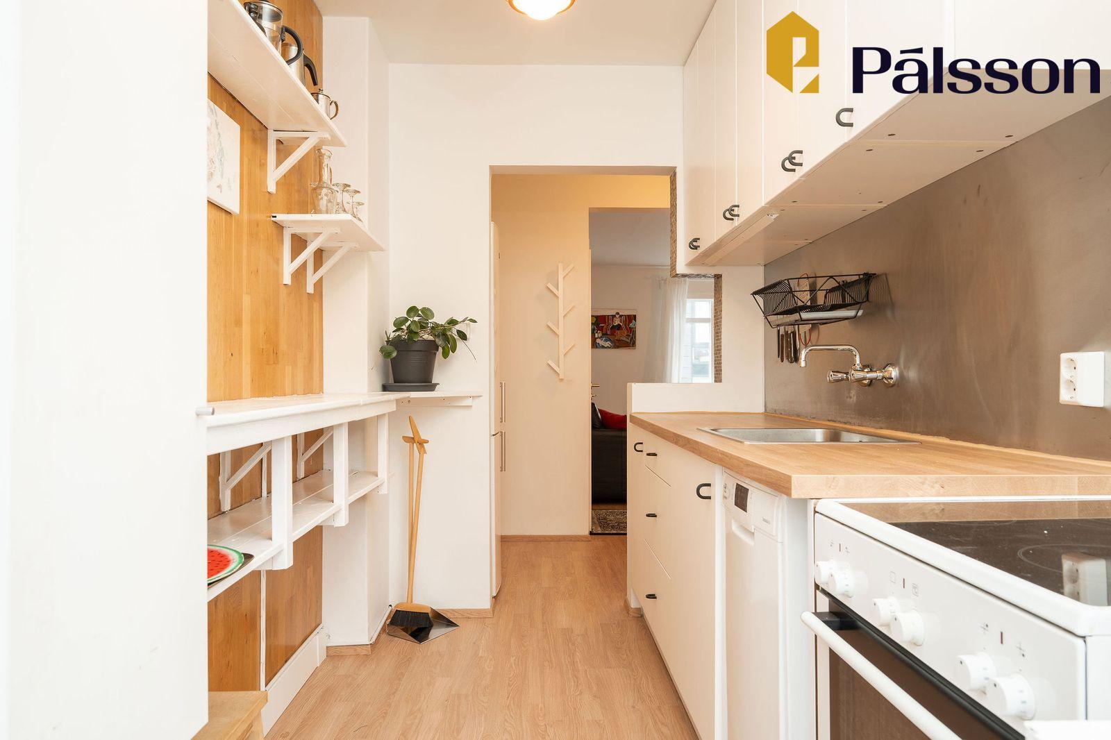 Eldhús er með sjarmerandi hvítri innréttingu, sambyggðri eldavél með ofni og helluborði og stæði fyrir uppþvottavél. Útgengi á litlar svalir. Parket á gólfi.