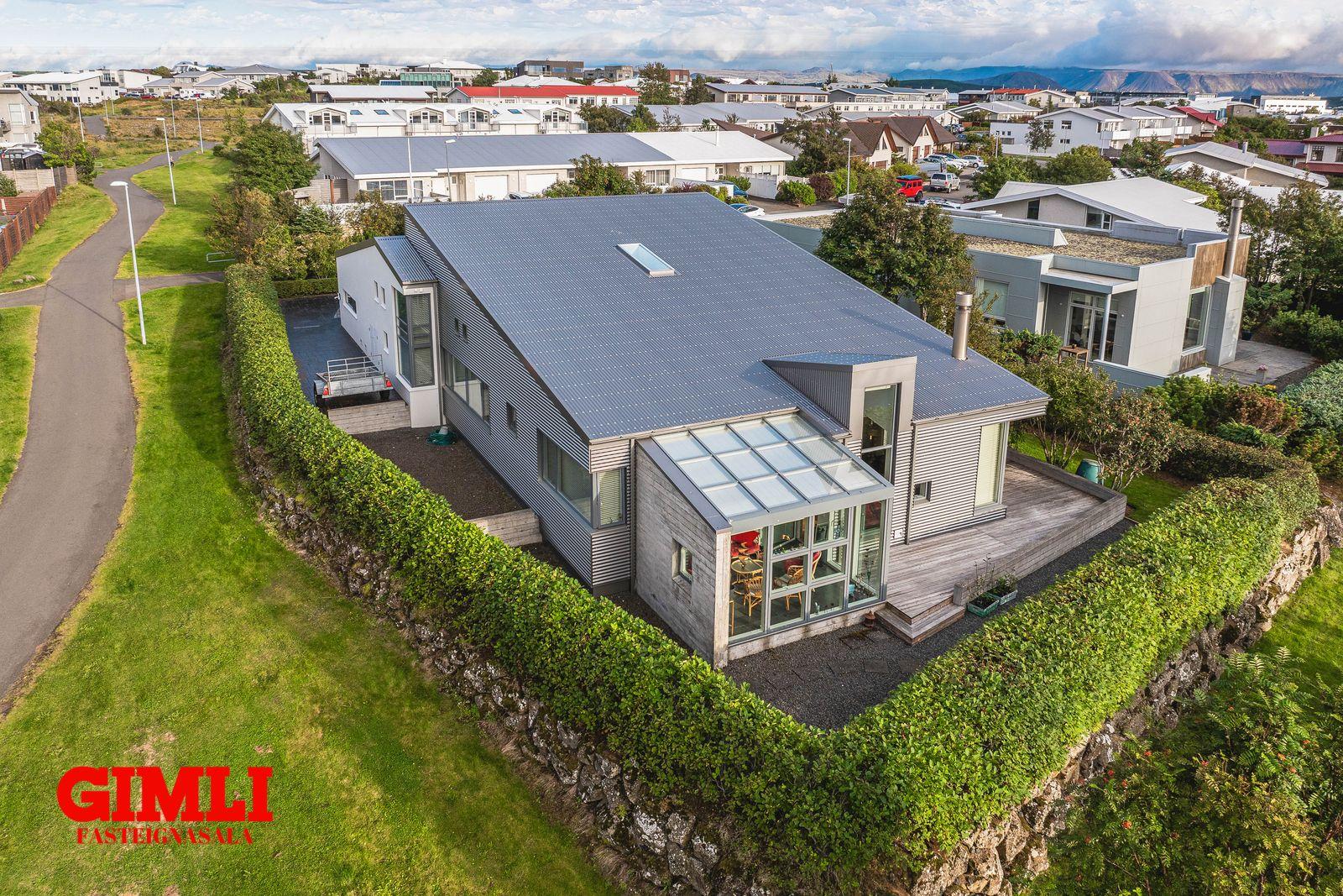 Niðurlag: Fallega hannað arkitektateiknað hús sem er vel byggt með vönduðum innréttingum og þar sem birtan fær að njóta sín með fallegri gluggasetningu. Garður og hús sérlega viðhaldslétt. Frábær staðsetning í fallegu grónu hverfi. Húsið verður aðeins sýnt í einkaskoðun. Nánari upplýsingar veitir: Bárður H Tryggvason sölustjóri, í síma 8965221, tölvupóstur bardur@gimli.is eða gimli@gimli.is