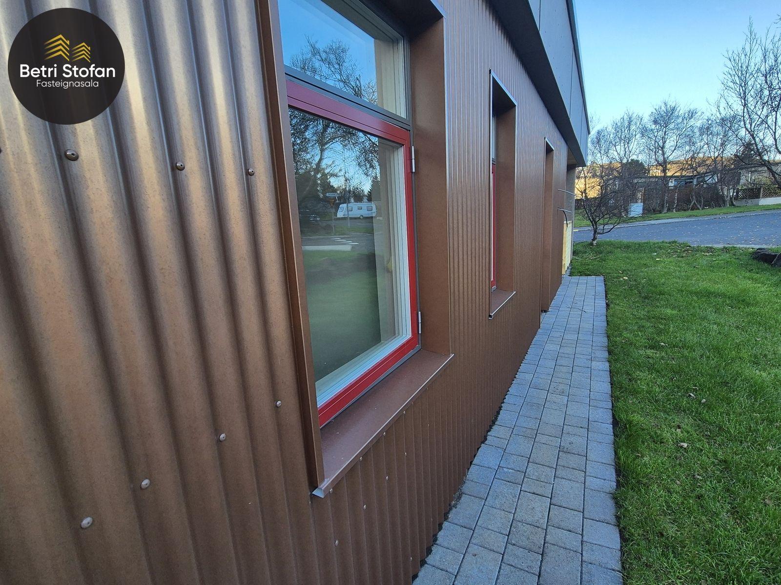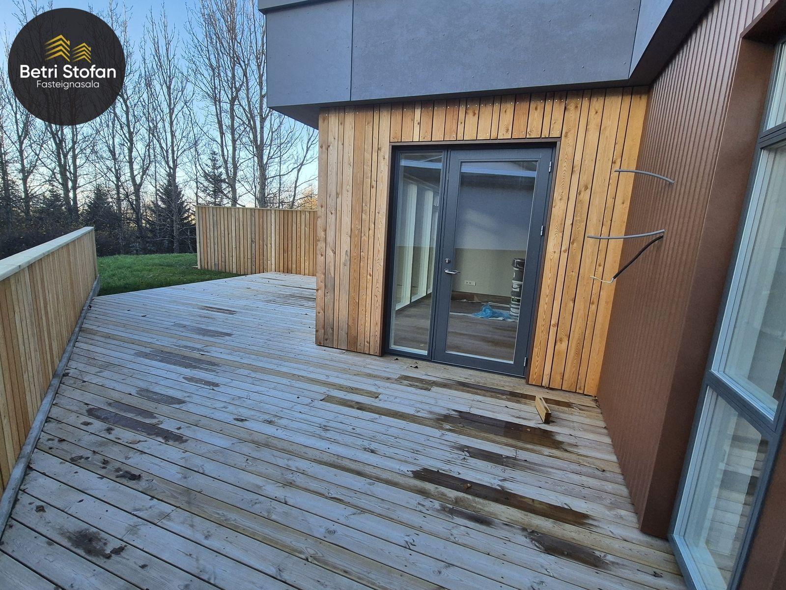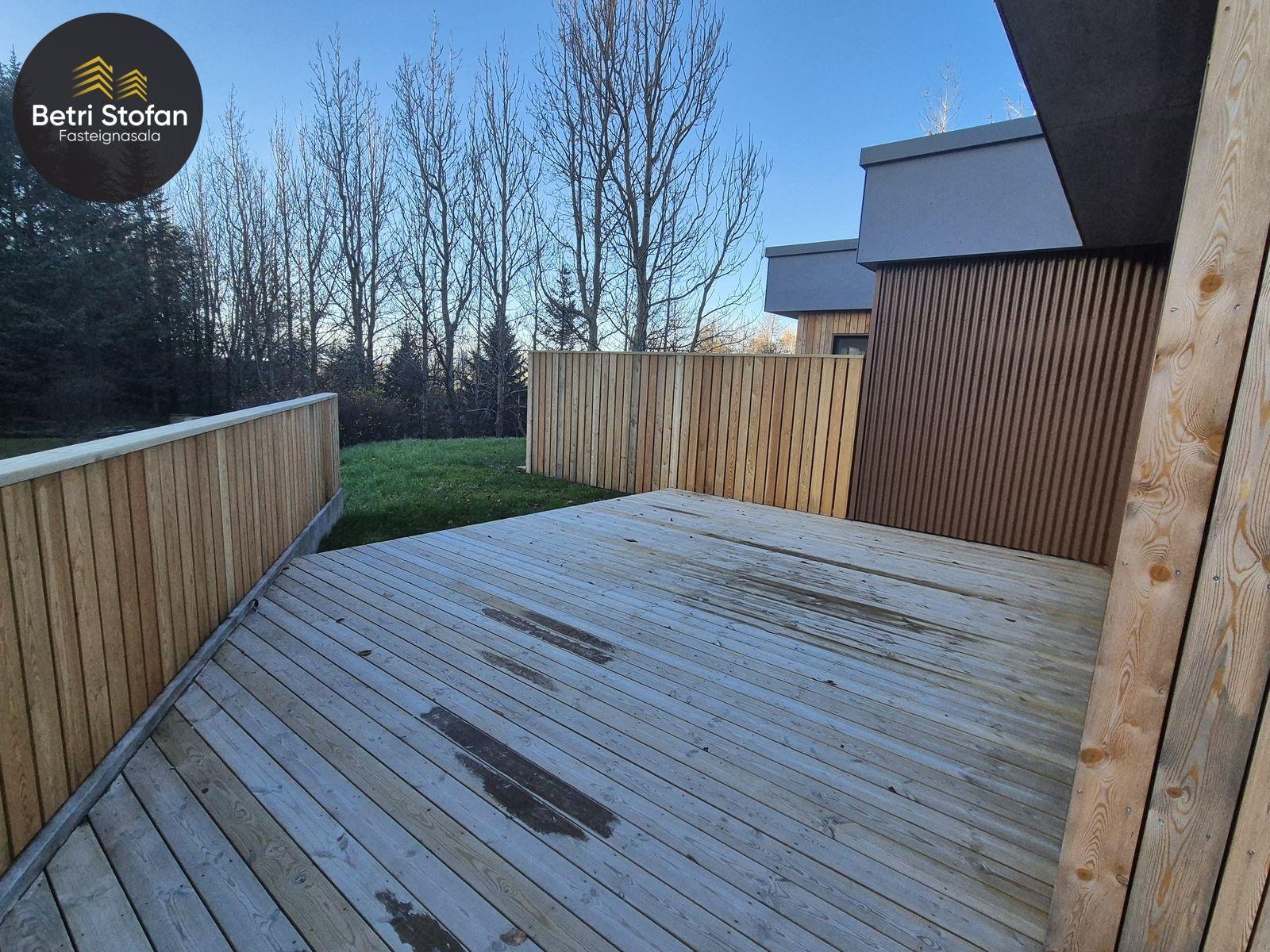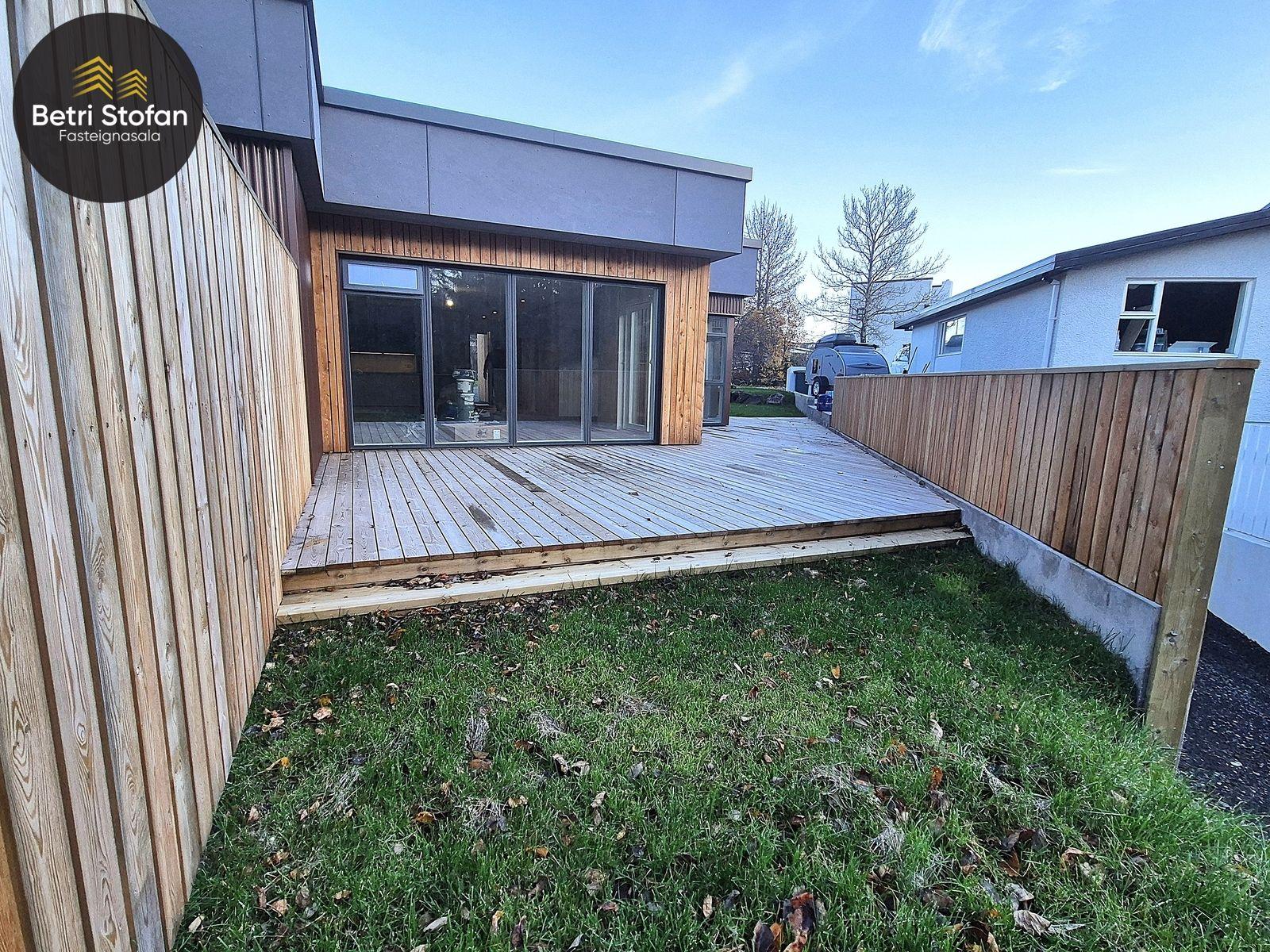 Forstofa: Vínylparket á gólfi og góður fataskápur. Alrými: Opið, stórt og mjög fallegt rými með vínylparketi á gólfi, gólfsíðir gluggar, útgengi á suður verönd / lóð í fallegu grónu umhverfi. Eldhús: Opið við alrými, þar er glæsileg sérsmíðuð innrétting, mikið skápa og vinnupláss. Vönduð tæki, innbyggð uppþvottavél og ísskápur, spanhelluborð með viftu. Sjóvarpshol: Opið við alrými, gott rými sem nýtist vel fyrir gott sjónvarp og sófa. Getur einnig nýst sem þriðja svefnherbergið sbr teikningu. Hjónaherbergi: Stórt og gott herbergi með stórum fataskápum, vínylparket á gólfi. Svefnherbergi: Gott herbergi með fataskáp og vínylparketi á gólfi. Baðherbergi: Fallega innréttað og flísalagt með góðri innréttingu, einhalla sturtu og gleri, handklæðaofni, gluggi er á baðherberginu. Þvottahús: Flísalagt og sér innan íbúðar. Geymsla: Sér geymsla með glugga og flísum á gólfi. Innangengt frá innkeyrslu. Lóð: Mjög falleg og fullfrágengin lóð með hellulögðum stéttum, innkeyrslu með hitalögn og timburveröndum með skjólveggjum. Sjarmerandi gróið umhverfi og lóð til suðurs. Efnisval: Innréttingar sérsmíðaðar frá HTH. Planka vinylparket í eikarlit á gólfum (slitsterkt og fallegt) lagt án gólflista. Gluggar eru ál / tré með þreföldu gleri frá Húsasmiðjunni. Innihurðir eru hvítar innfelldar.