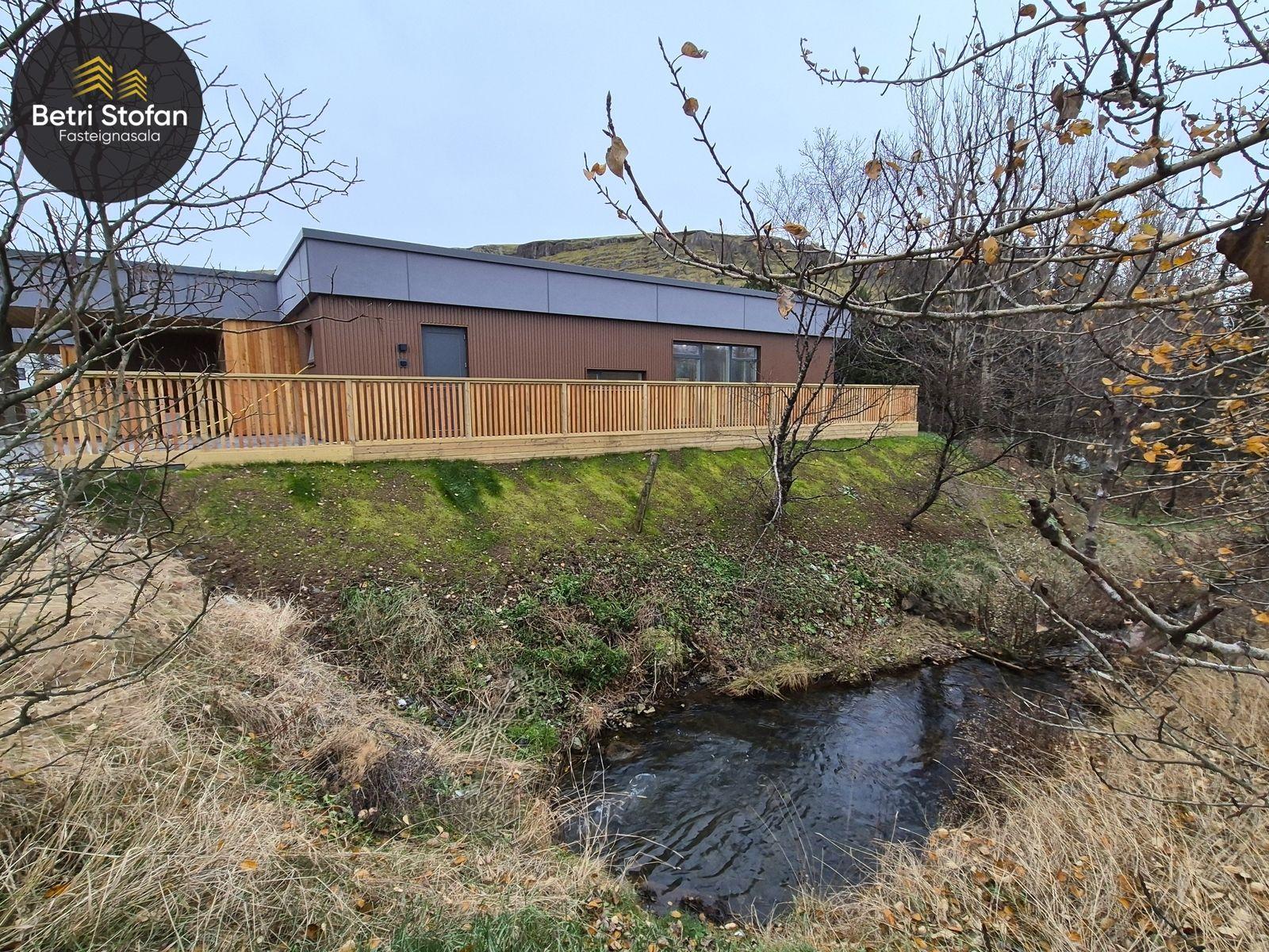 Betri Stofan fasteignasala Borgartúni 30 og Atli S. Sigvarðsson fasteignasali kynna nýtt í sölu. Nýtt, sjarmerandi og einstaklega vel hannað parhús á einni hæð í ótrúlega grónu og fallegu umhverfi við Aðaltún Mosfellsbæ, skógi vaxið umhverfi og lækur sem rennur við lóðarmörkin. Arkitekt er Jakob Emil Líndal FAÍ hjá ALARK arkitektum. Húsið er mjög veglega innréttað og skilast fullbúið með gólfefnum, innréttingar frá HTH og tæki vönduð. 2-3 svefnherbergi, gólfsíðir gluggar í alrýmum sem snúa að fallegu grónu umhverfi. Gólfhiti í öllum gólfum, hljóðdúkur í lofti (góð hljóðvist). Að utan er húsið einangrað og klætt með ál / tré gluggum (þrefalt gler) og er húsið því viðhaldslétt. Lóð er falleg og frágengin, sólpallur til suðurs og stór hellulagt bílaplan með snjóbræðslu. Til afhendingar við kaupsamning.