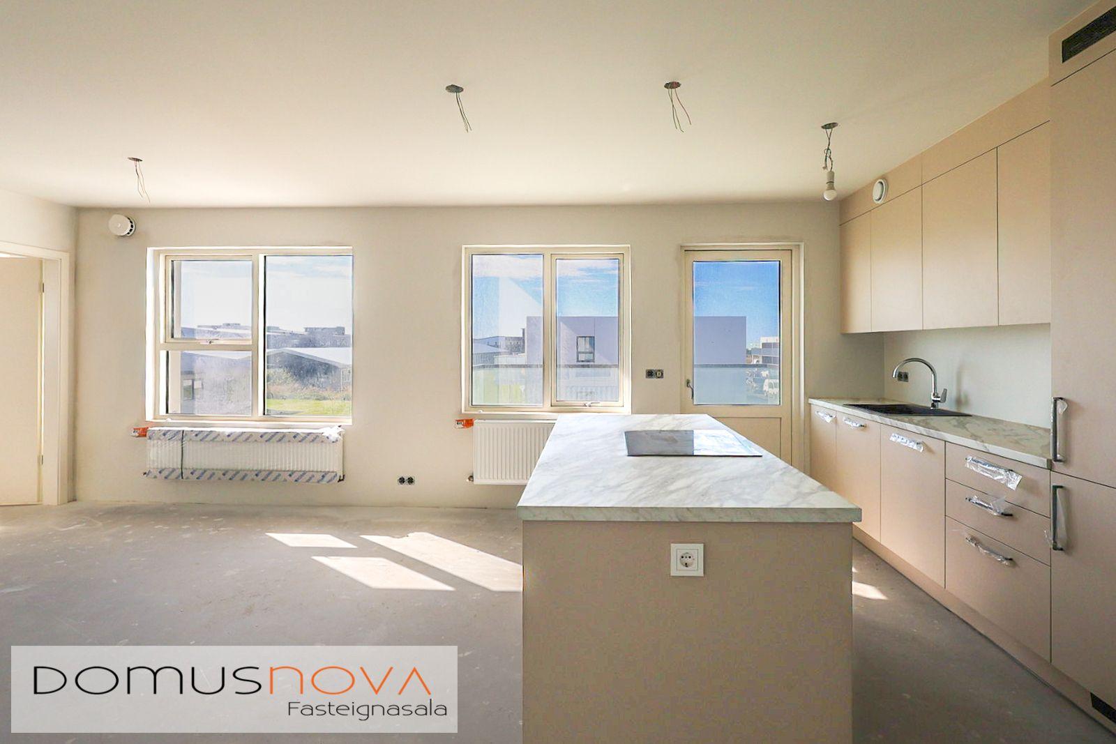 Íbúð 203 er 77,6 fm., þar af sérgeymsla 2,1 fm. Innan eignar er forstofa, stofa og eldhús sem mynda alrými þaðan sem útgengt er út á svalir, tvö svefnherbergi, baðherbergi þar sem einnig er þvottarými og geymsla. Eigninni fylgir sérgeymsla í sameign á 1. hæð. Íbúðin skilast fullbúin án gólfefna utan baðherbergis þar sem eru flísar á gólfi.
