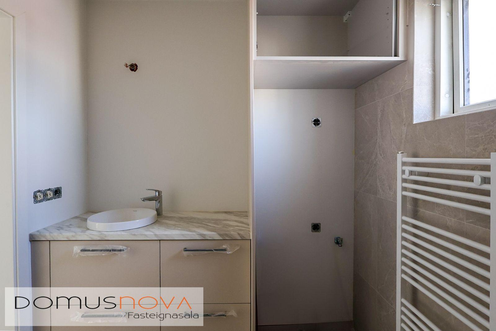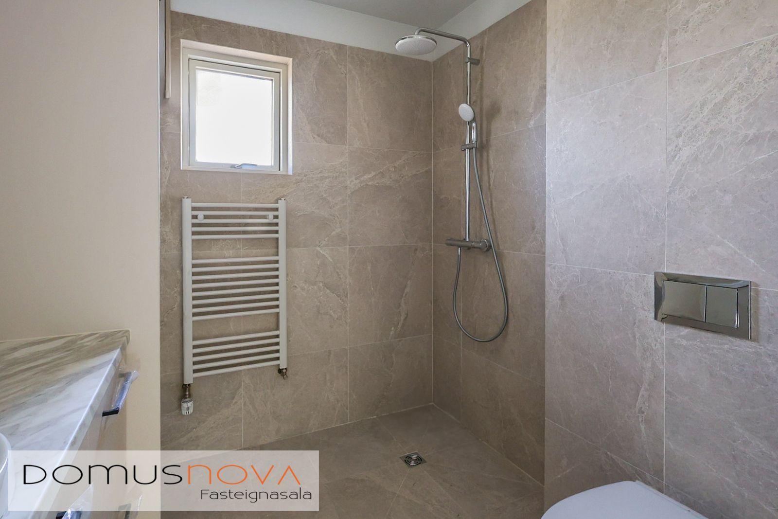 Baðherbergi: Ljós innrétting, borðplata með marmaraáferð og hvítri handlaug. Upphengt salerni með hæglokandi setu, WALK IN sturta með sturtuhengi og handklæðaofn. Aðstaða fyrir þvottavél og þurrkara. Veggflísar og flísar á gólfi. Gluggi með opnanlegu fagi.
