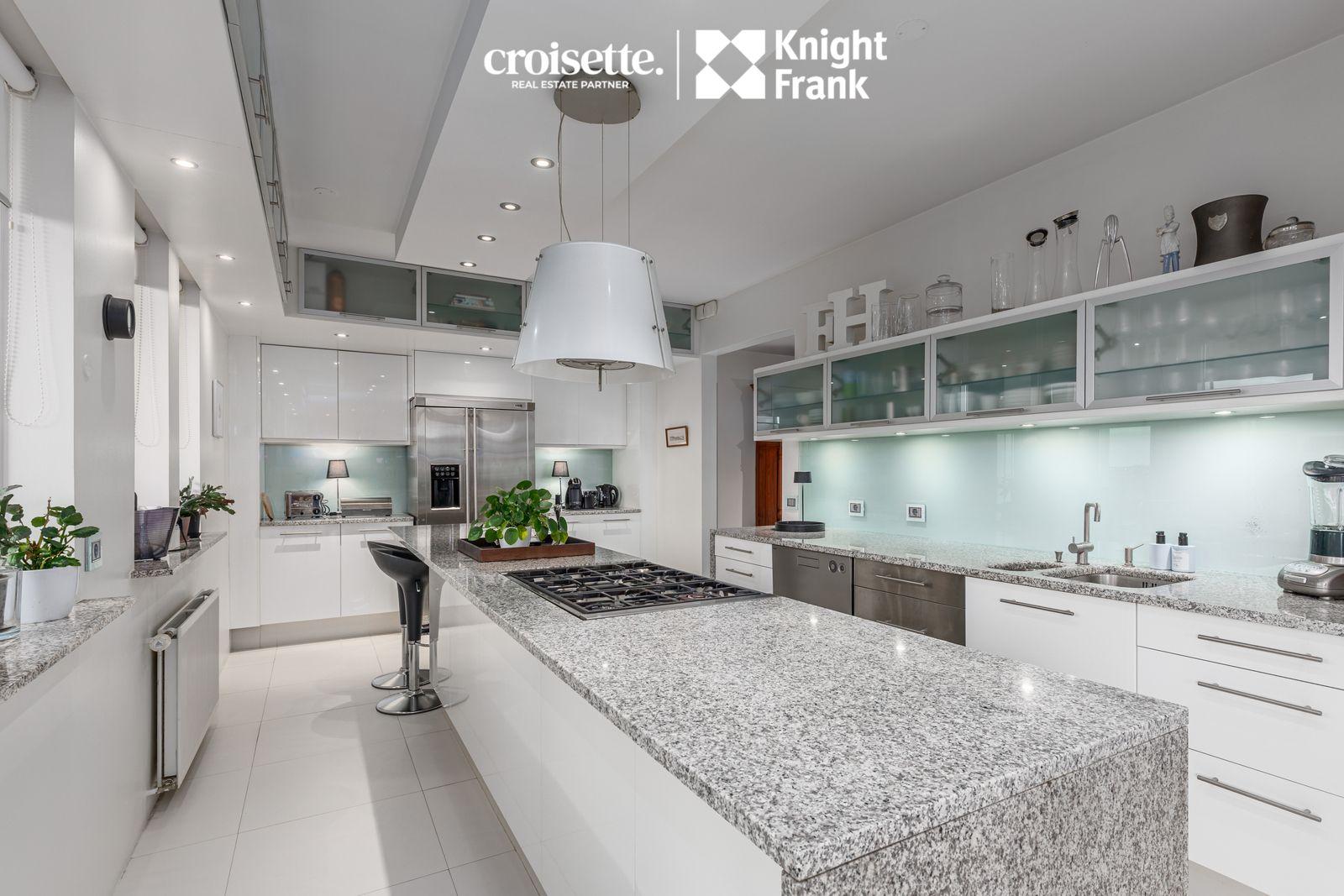 Eldhúsið er með stórri og fallegri innréttingu með góðu skápa og skúffuplássi. Steinn er á borðum og gluggakistum og gler á milli efri og neðri skápa, stór Smeg gaseldavél með ofni og tvöfaldur General Electric ísskápur með klakavél. Stór eyja og mikið borðpláss veita góða vinnuaðstöðu og rými fyrir samveru. Frábært útsýni er út um eldhúsglugga.