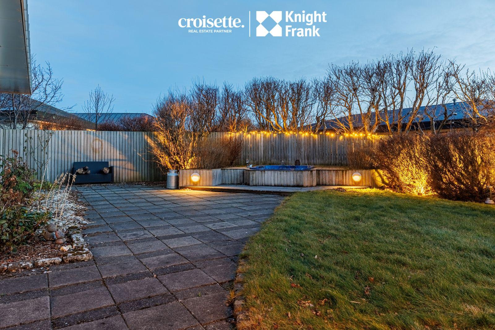 Bakgarðurinn er til suðurs, hann er afgirtur með góðum útisvæðum og heitum potti. Vestan við húsið er garður með palli og stórum grasflöt með fallegri steinhleðslu og óskertu útsýni.