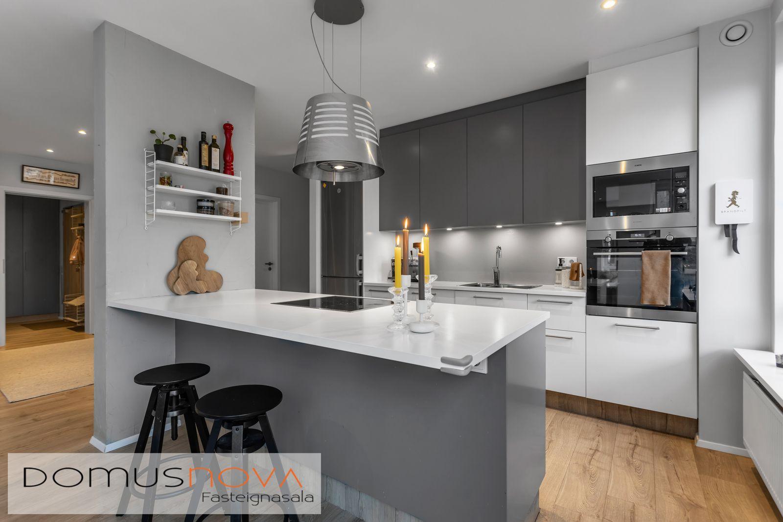 Eldhús: Í opnu rými með borðstofu/ stofu. Falleg rúmgóð innrétting með eyju.
