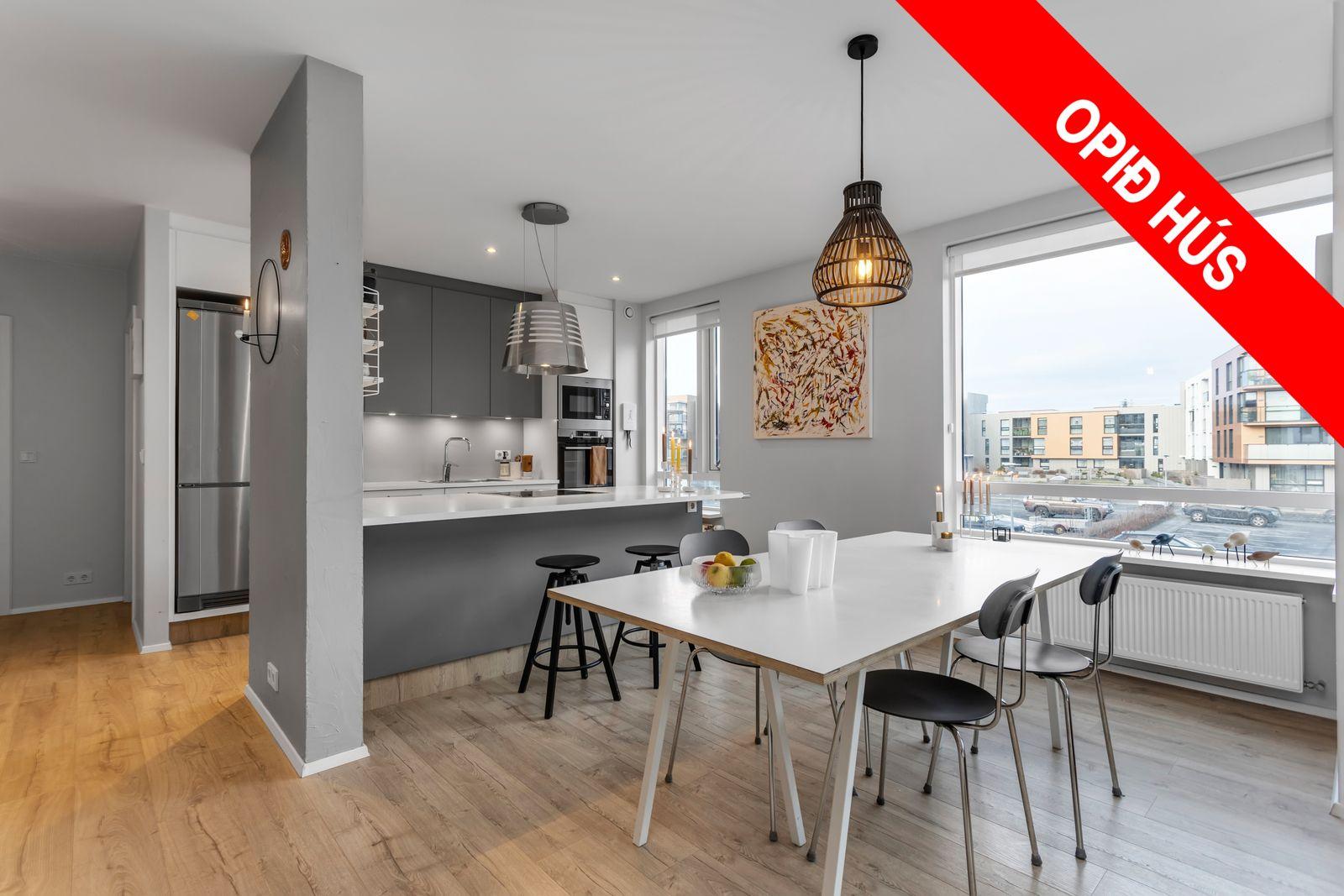 Domusnova, Ingunn Björg og Andri Hrafn löggiltir fasteignasalar kynna: Einstaklega glæsilega og rúmgóða 4ra herbergja íbúð á 2. hæð ásamt rúmgóðum yfirbyggðum svölum í glæsilegu 4ja hæða lyftuhúsi við Naustavör 7 í Kópavogi. Eigninni fylgir rúmgott stæði í bílageymslu ásamt geymslu sem staðsett er inn af bílastæði.