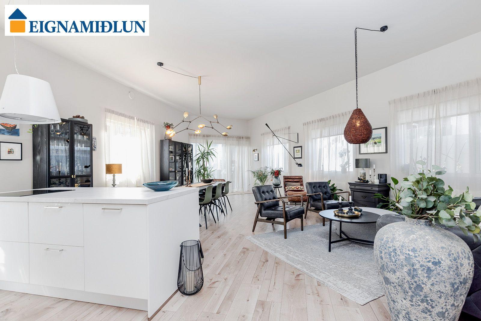 Opið og bjart eldhús með góðu skápa og vinnuplássi í fallegri hvítri innréttingu. Innbyggð tæki í eldhúsi, ísskápur, frystir og uppþvottavél. Ofn í vinnuhæð. Stór eyja með spanhelluborði og góðu skúffuplássi. Innrétting í eldhúsi er frá Nobila í Þýskalandi og tæki frá Electrolux. Stórar stofur og borðstofa með útgengi út á pall. Hjónaherbergi er næst alrými mjög rúmgott með góðu skápaplássi og sér baðherbergi með sturtuklefa.