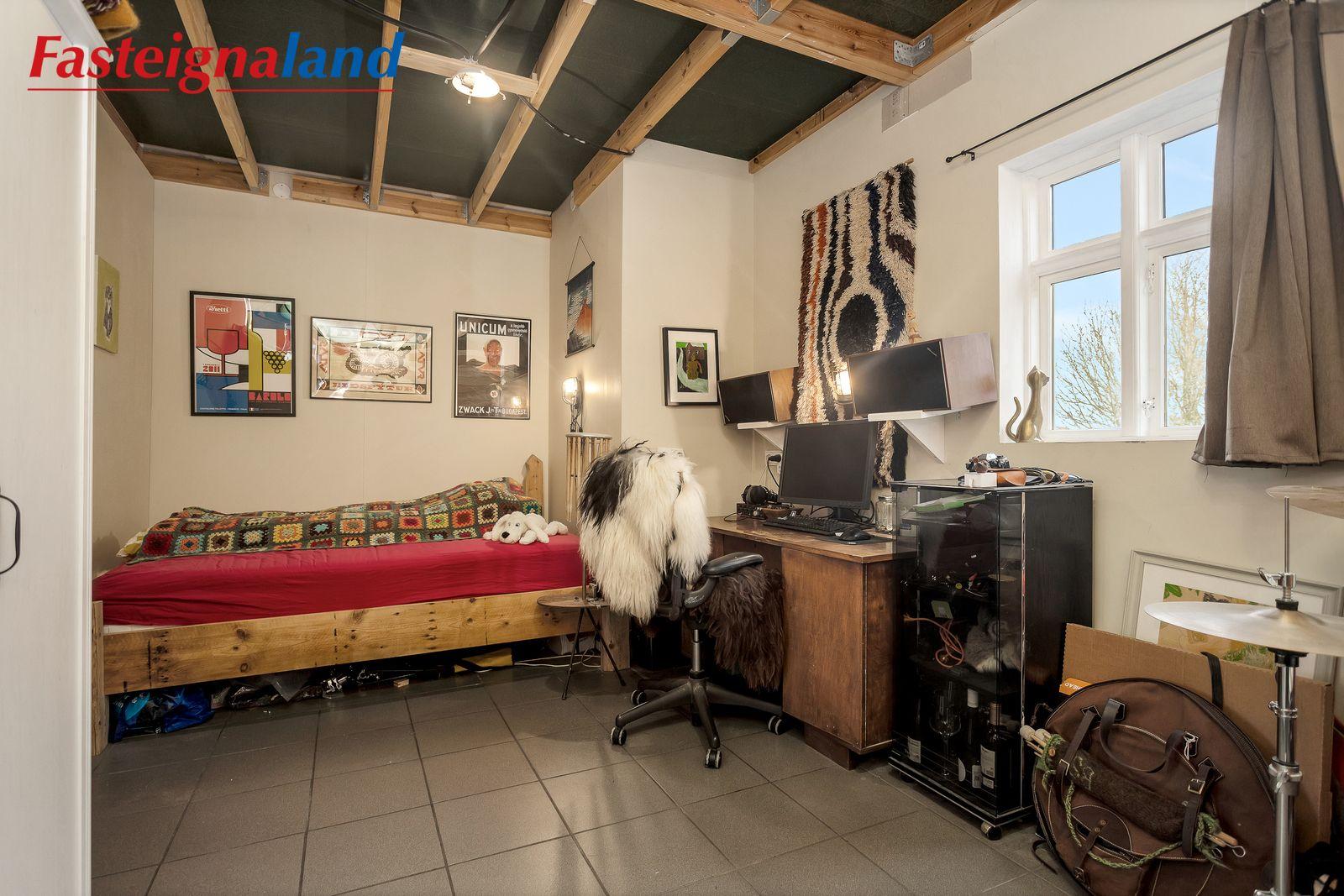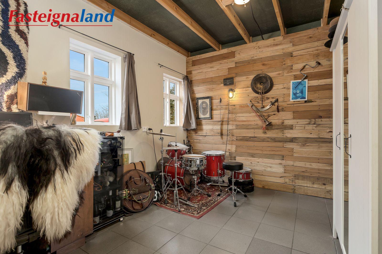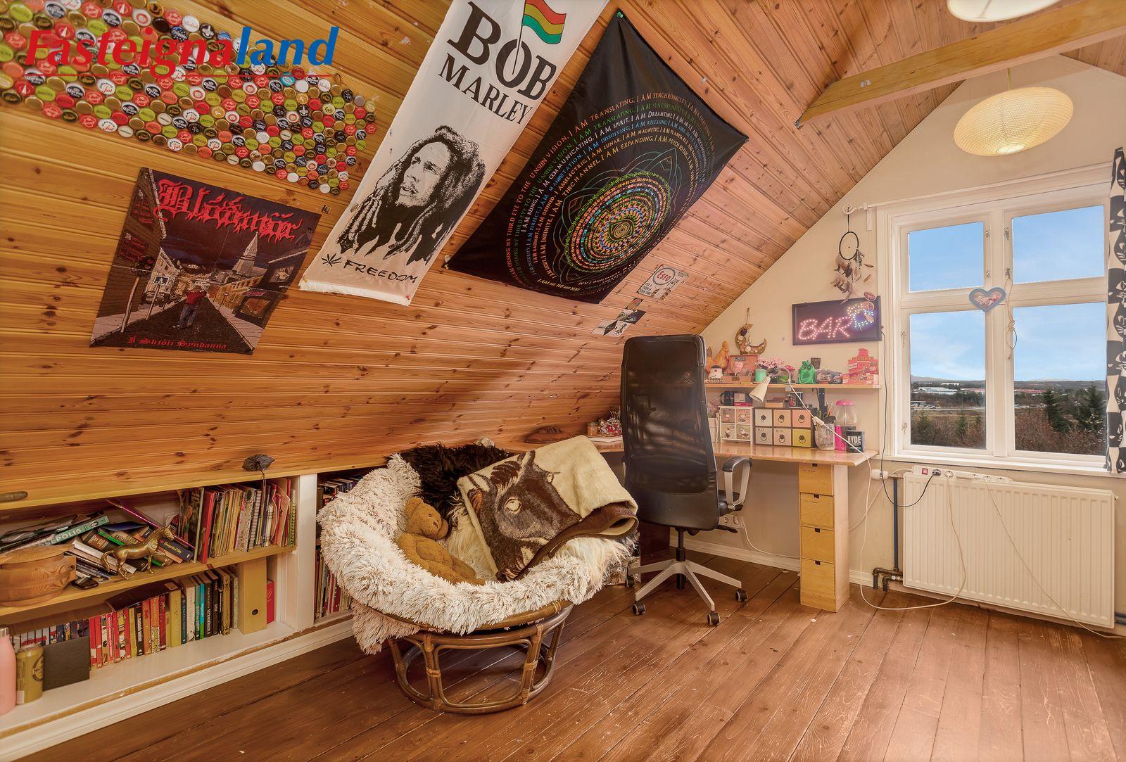 Bílskúr: með flísum á gólfi og hiti í gólfum, þarna er búið að gera milliloft sem er notað sem herbergi, og einnig er búið að útbúa stórt herbergi með léttum veggjum í skúrnum sjálfum, auðvelt er að breyta þessu til baka fyrir þá sem vilja hafa pláss fyrir bílinn, einnig væri hægt að breyta þessu í leigu einingu, þar sem þarna er sér inngangur.