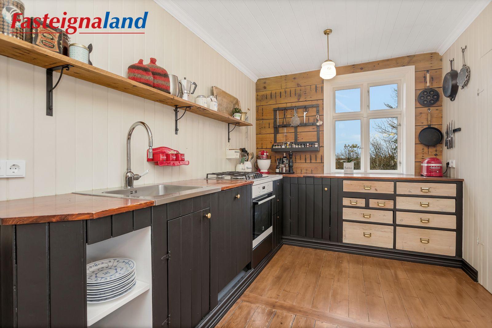 Eldhús: með viðargólfi og smekklegri eldhúsinnréttingu og búr þar sem hægt er að geyma matvæli og annað.