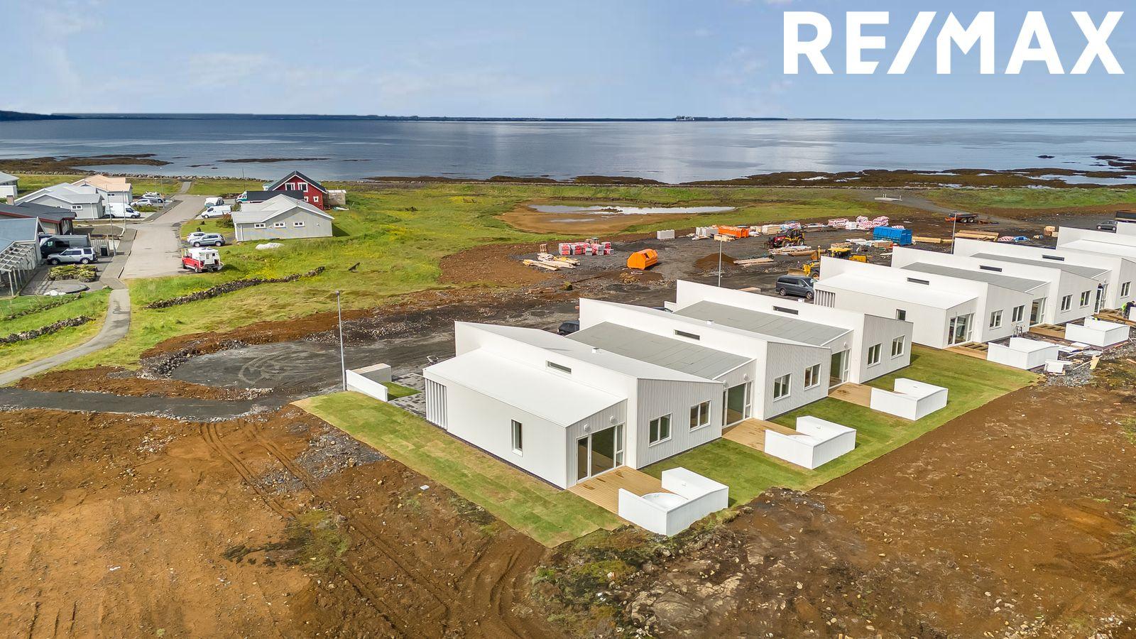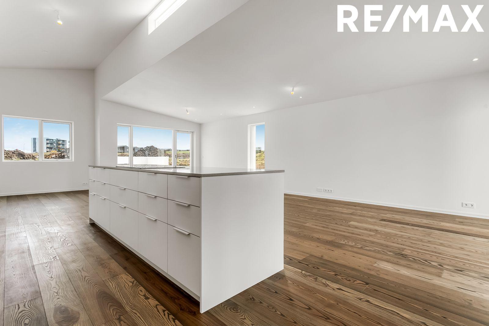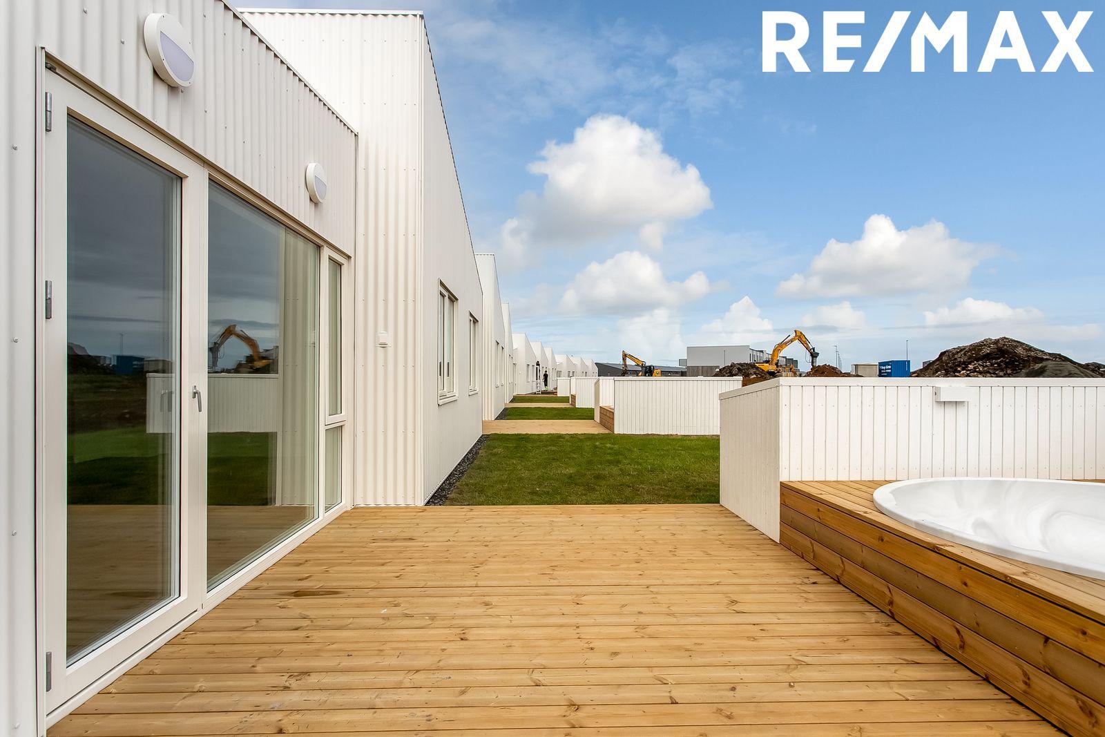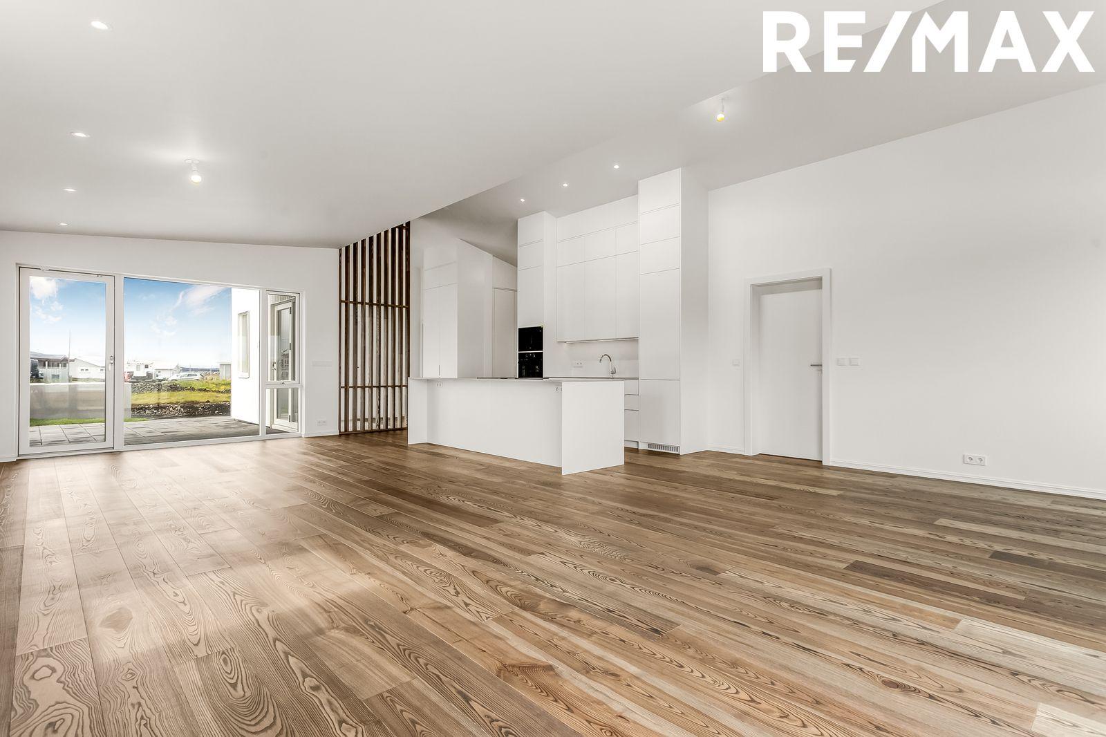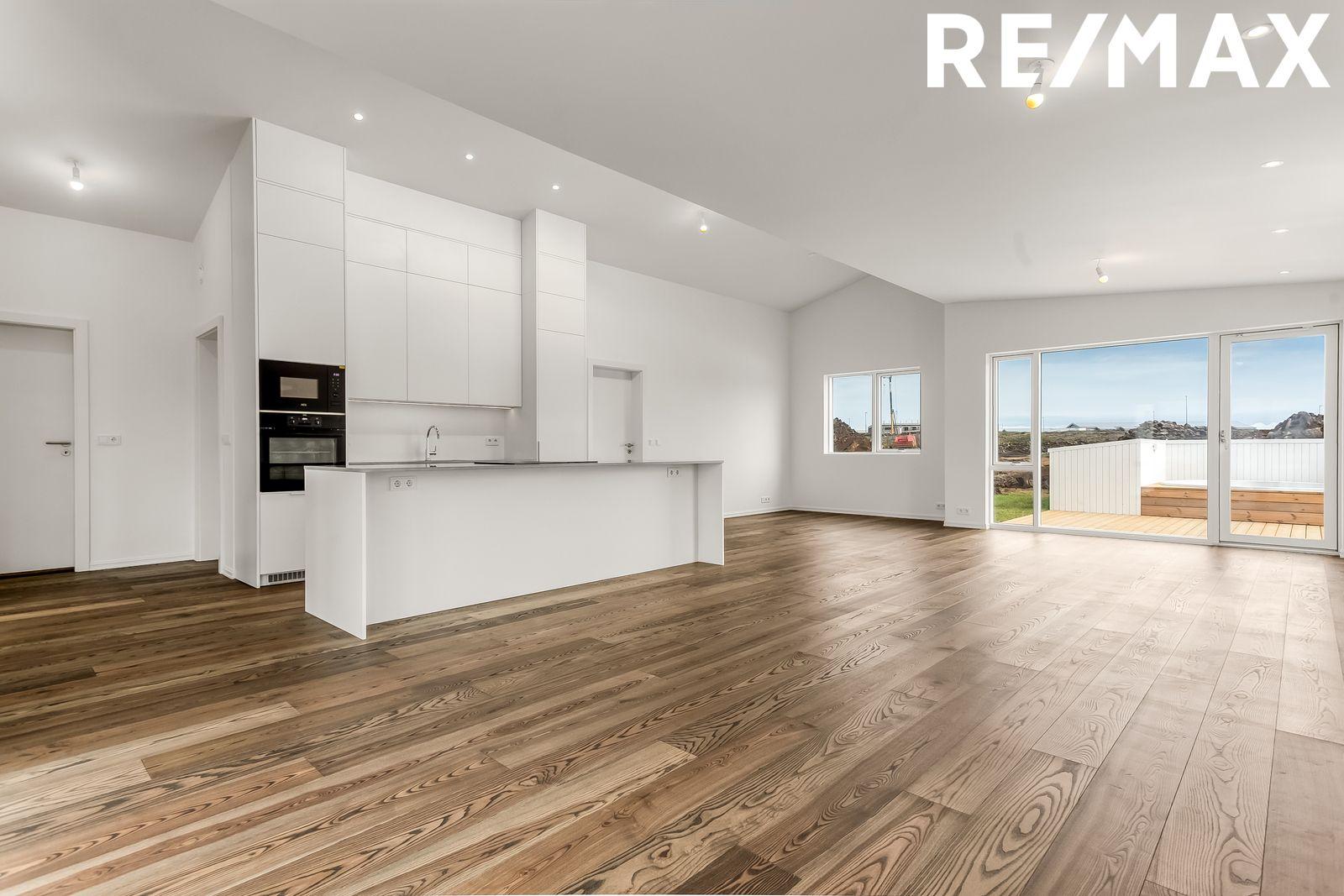 Nánari lýsing eignar: Forstofa: Er með flísum á gólfum og rúmgóðum fataskápum. Stofa og borðstofa er í opnu alrými með eldhúsi, rúmgóð stofa með útgengi á sólpall sem klæddur er með fallegu lerki, búið er að koma fyrir heitum pott, lofthæð innan eignarinnar á hæsta punkt eru um fjórir metrar og setur það mikinn svip á stofuna. Innfelld lýsing þar sem á við. Eldhús: er opið við stofu. Eldhúsinnrétting er hvít melamine með ljósri Quartz borðplötu. Með hverri íbúð fylgir span helluborð með gufugleypi, bakarofn, örbylguofn, innbyggð uppþvottavél og ísskápur með frysti. Svefnherbergi eru fjögur talsins þeim fylgja fataskápar í sama lit og efni og er á eldhúsinnréttingu. Parket á gólfum. Baðherbergi: Er flísalagt í hólf og gólf með 60x60 flísum, upphengt salerni, sturtuklefi og innrétting við vask með ljúflokun á skúffum, tengi fyrir þvottavél og þurrkara. Þvottahús / Geymsla er með flísum á gólfi, innrétting með tengi fyrir þvottavél og þurrkara.