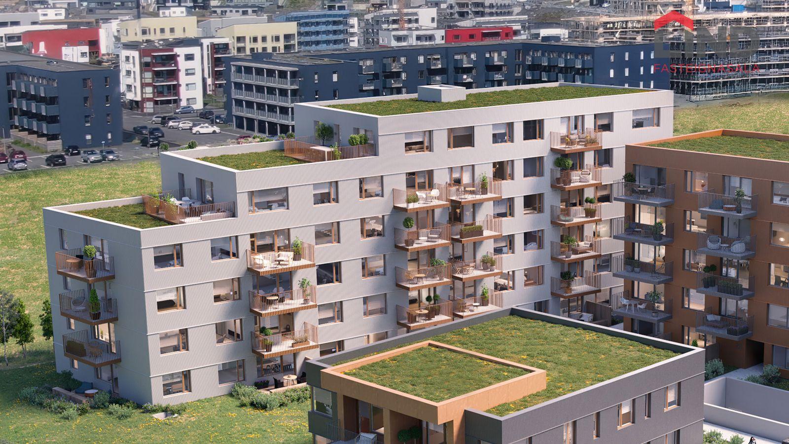Nánari lýsing: Íbúðin skiptist í anddyri/forstofu, eldhús við opið alrými/stofu, hjónaherbergi, tvö svefnherbergi, baðherbergi með tengi fyrir þvottavél og þurrkara. Útgengi á svalir til norðausturs úr stofu.