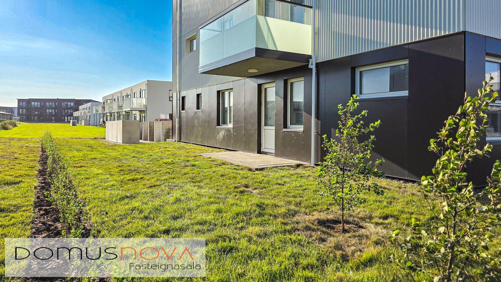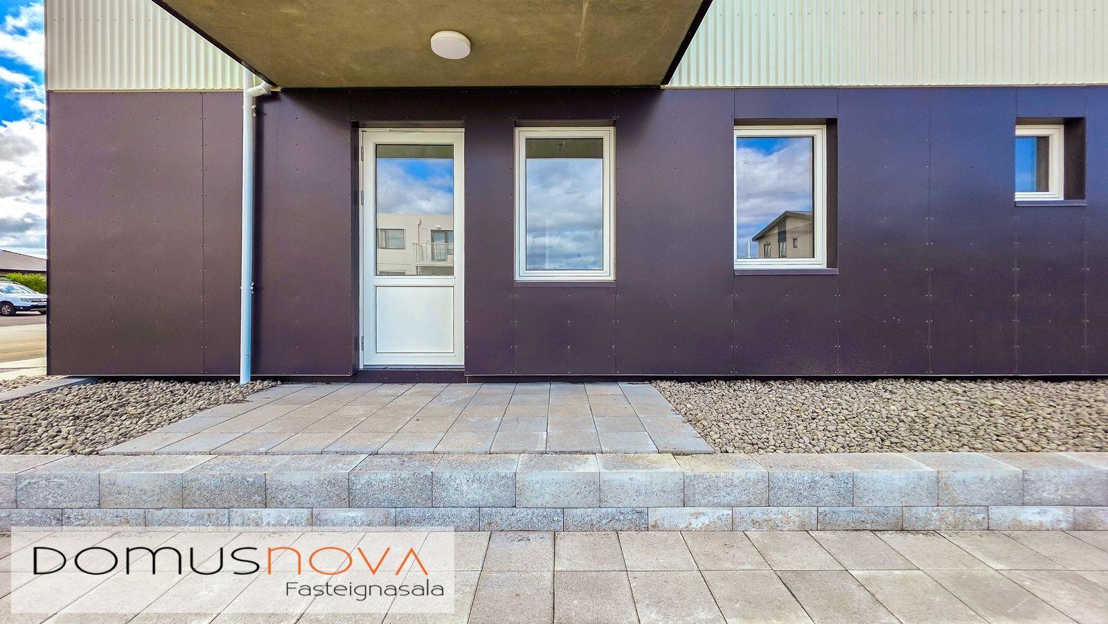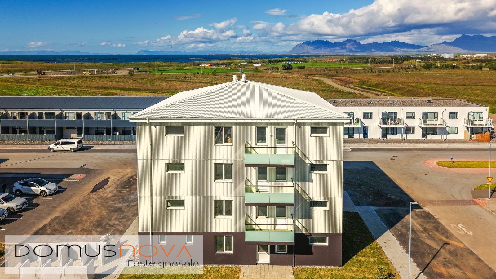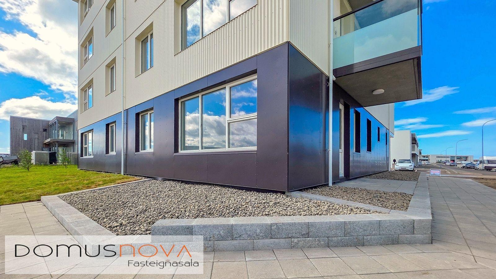 Lóð/bílastæði: Lóðin er 940,3 fm. Aðkoma og að bílastæðum beggja vegna við húsið eru hellulögð stétt með snjóbræðslu. Með húsinu fylgja 19 malbikuð stæði. Sorpgerði fyrir tunnur er á lóð. Að öðru leyti verður lóðin þökulögð eða með náttúrulegum móa. Tengibúnaður (ídráttarrör) vegna hleðslu rafbíla er aðgengilegt við bílastæði (að fimm stæðum næst tengibrunni við hús). Lóðin verður afhent fullbúin í lok byggingartímans.