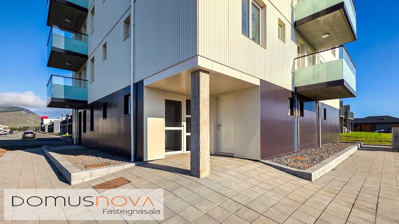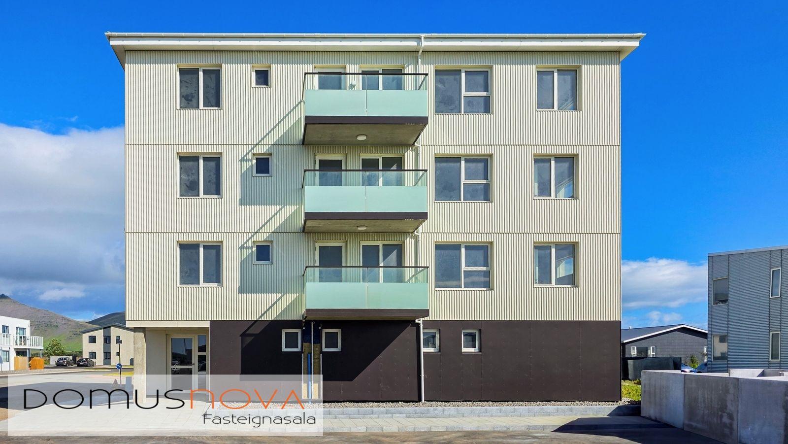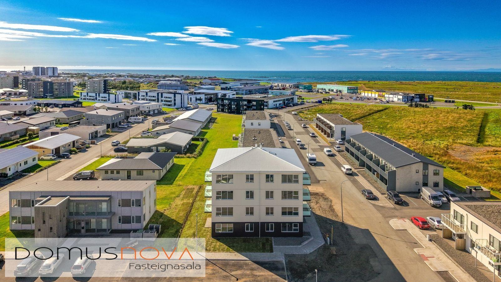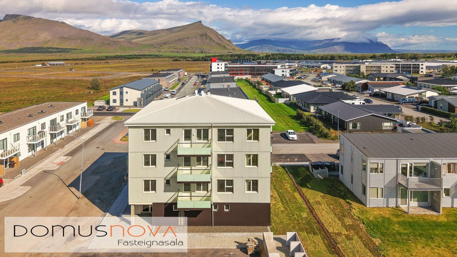 Lóð/bílastæði: Lóðin er 940,3 fm. Aðkoma og að bílastæðum beggja vegna við húsið eru hellulögð stétt með snjóbræðslu. Með húsinu fylgja 19 malbikuð stæði. Sorpgerði fyrir tunnur er á lóð. Að öðru leyti verður lóðin þökulögð eða með náttúrulegum móa. Tengibúnaður (ídráttarrör) vegna hleðslu rafbíla er aðgengilegt við bílastæði (að fimm stæðum næst tengibrunni við hús). Lóðin verður afhent fullbúin í lok byggingartímans.