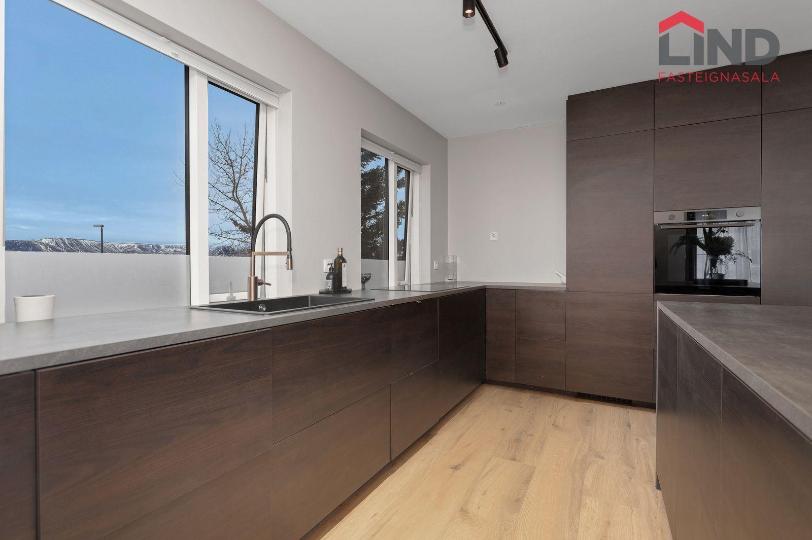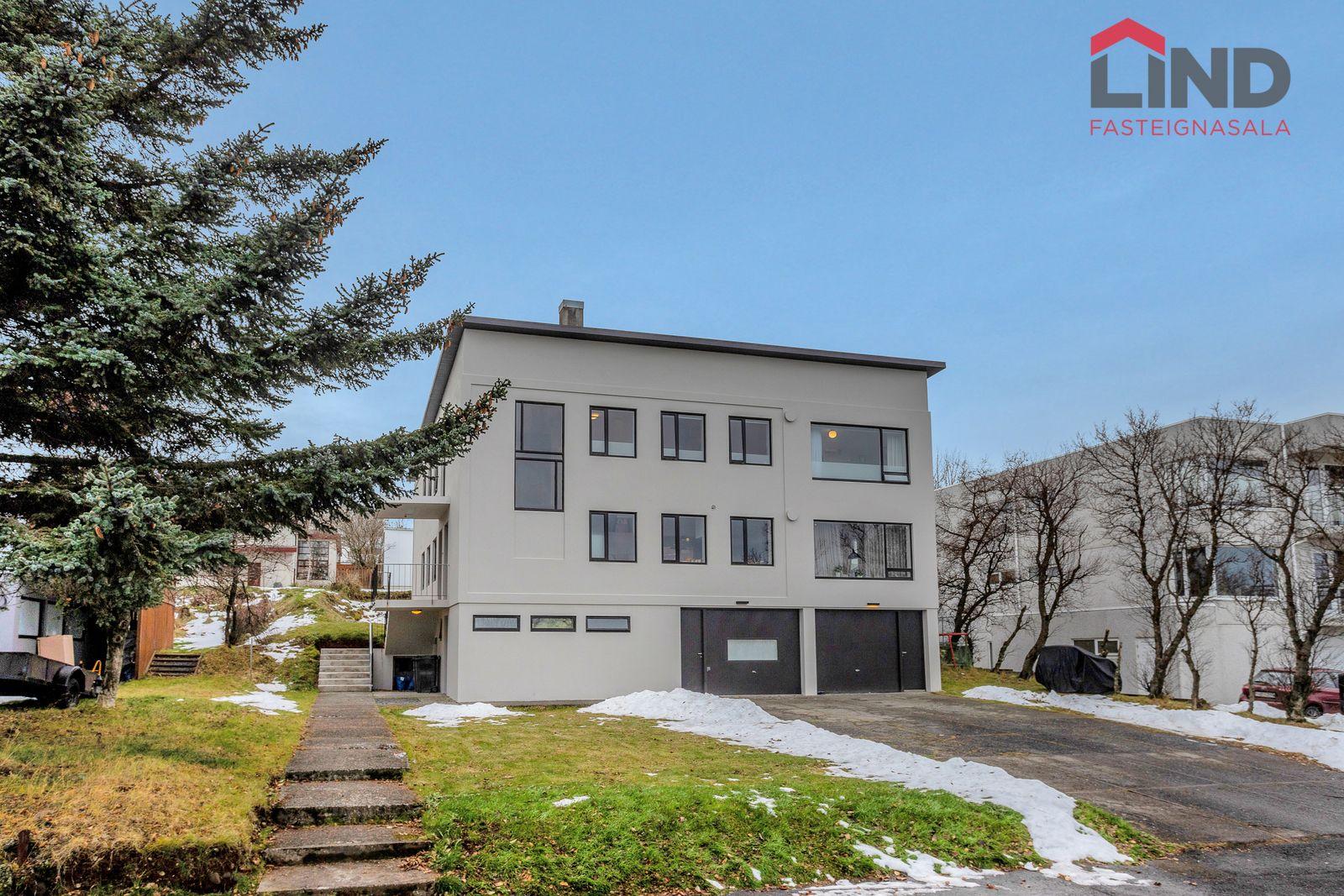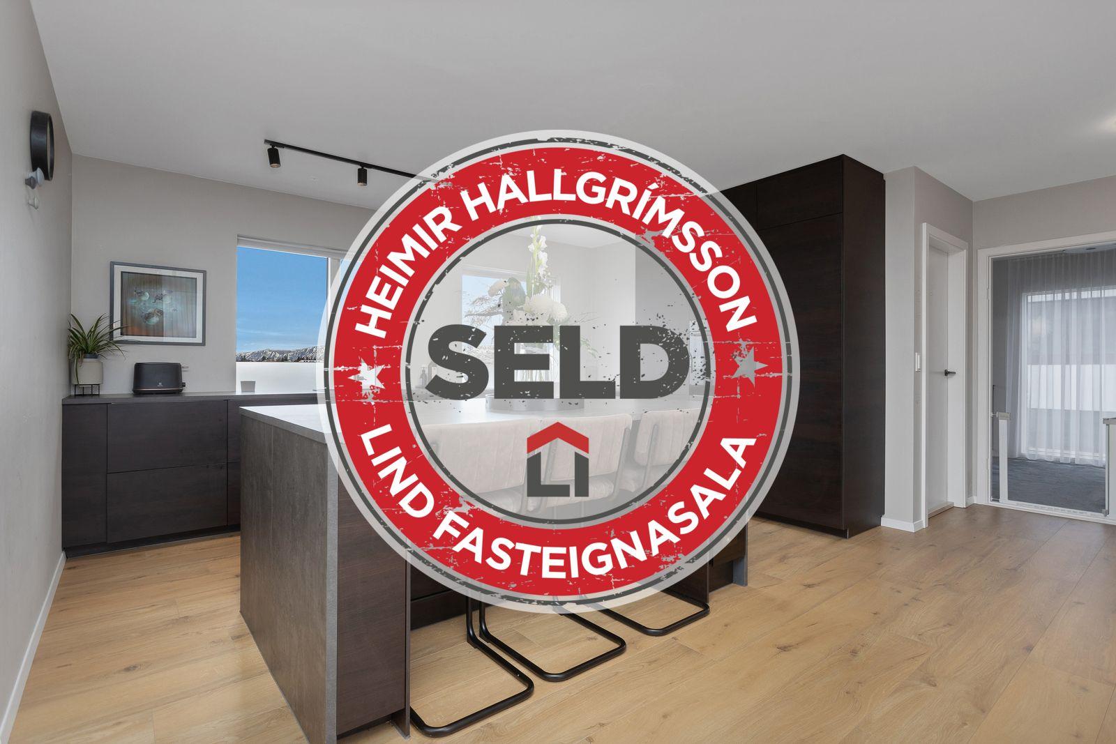 Eignin skiptist í forstofu, stigagang/stigapall, rúmgóða stofu, eldhús, fjögur svefnherbergi, baðherbergi, þvottaherbergi, tvær geymslur. Rúmgóðar suðvestursvalir eru út frá stofu. Mjög gott skipulag, stórir gluggar sem hleypa inn góðri birtu og glæsilegt útsýni. Góður 28,2 fermetra bílskúr.