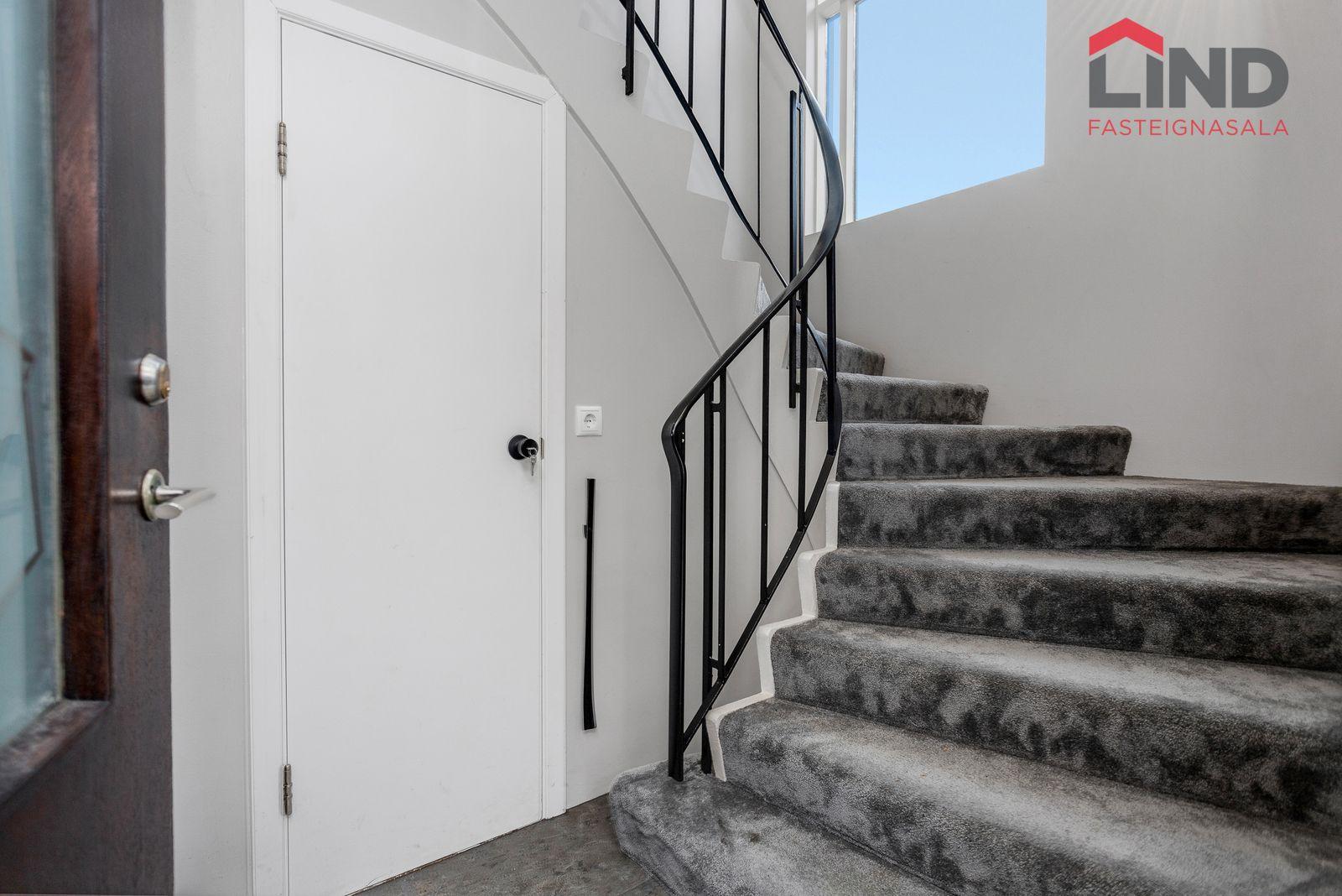 Stigahol: Gengið inn um sérinngang í rúmgott stigahol með flísum á gólfi. Teppi á stiga og stigaholi ásamt skápum. Stórir gluggar til norðurs og austurs í stigaholi.