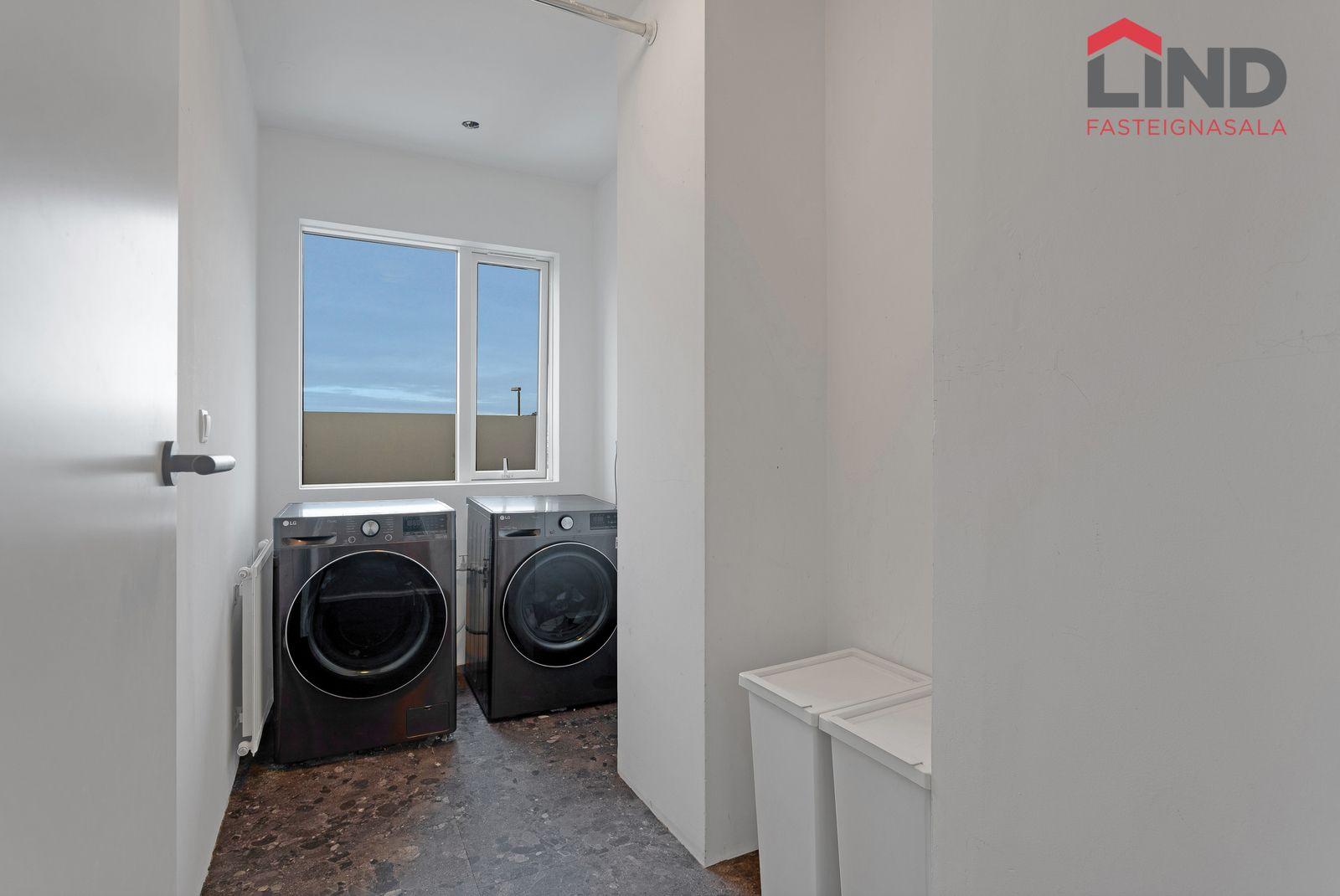 Þvottaherbergi: Með vinylflísum á gólfi, tengi fyrir þvottavél og þurrkara og glugga til norðurs.