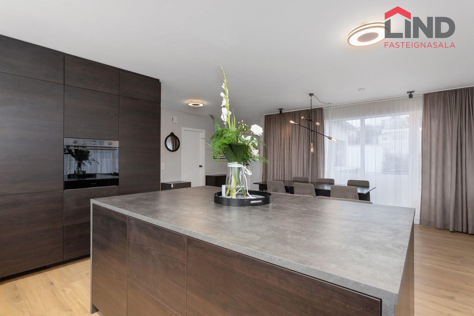 Eldhús: Er nýlega endurnýjað á afar smekklegan máta. Fallegar dökkar eldhúsinnréttingar með stórri eyju og harðparket á gólfi. Innb. kæliskápur með frysti, innb. uppþvottavél, auka kæliskápur í eyju, Samsung bakaraofn, vínkælir og spansuðu helluborð. Gluggi til norðurs með afar fallegu útsýni yfir Fossvogsdalinn og til fjalla.