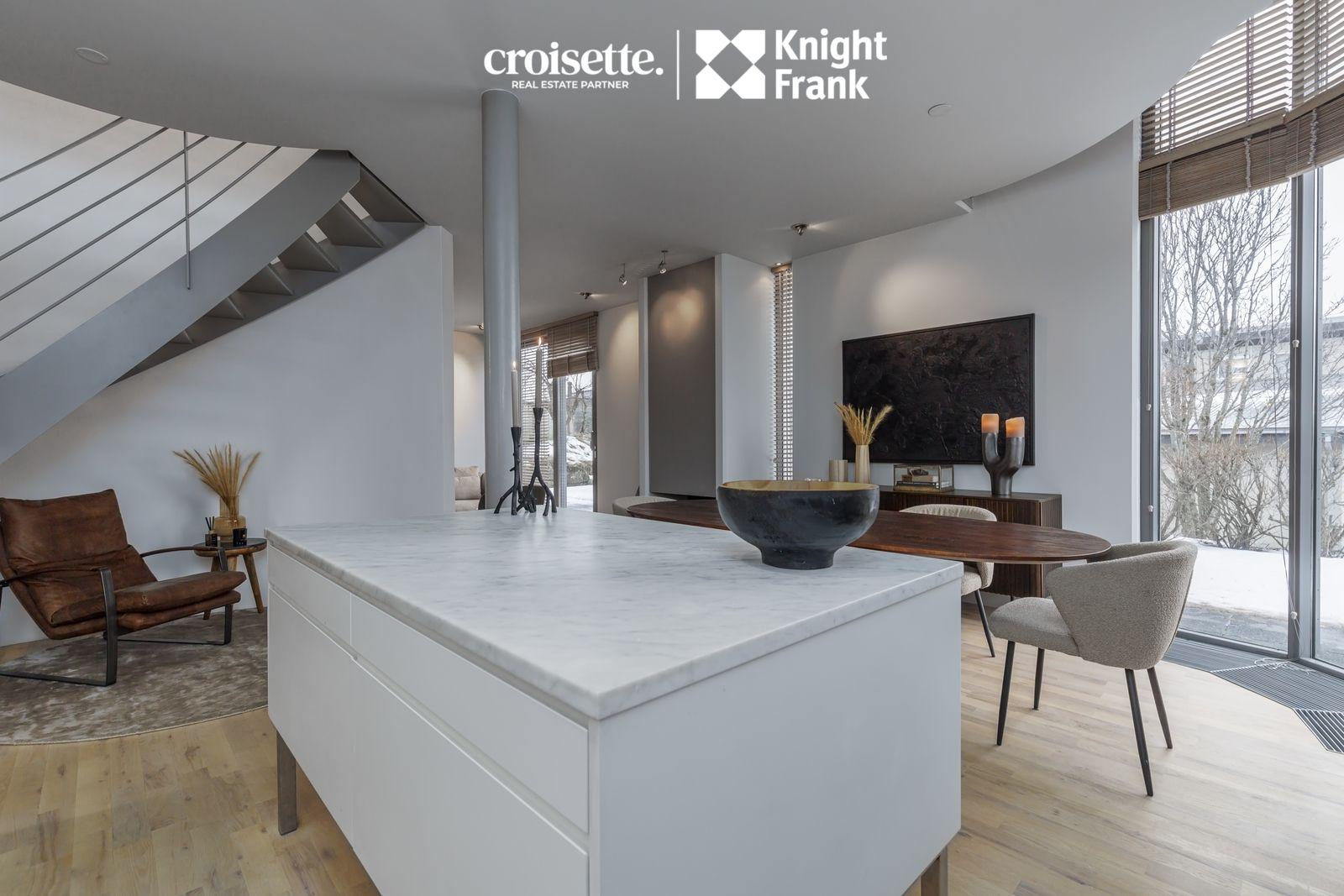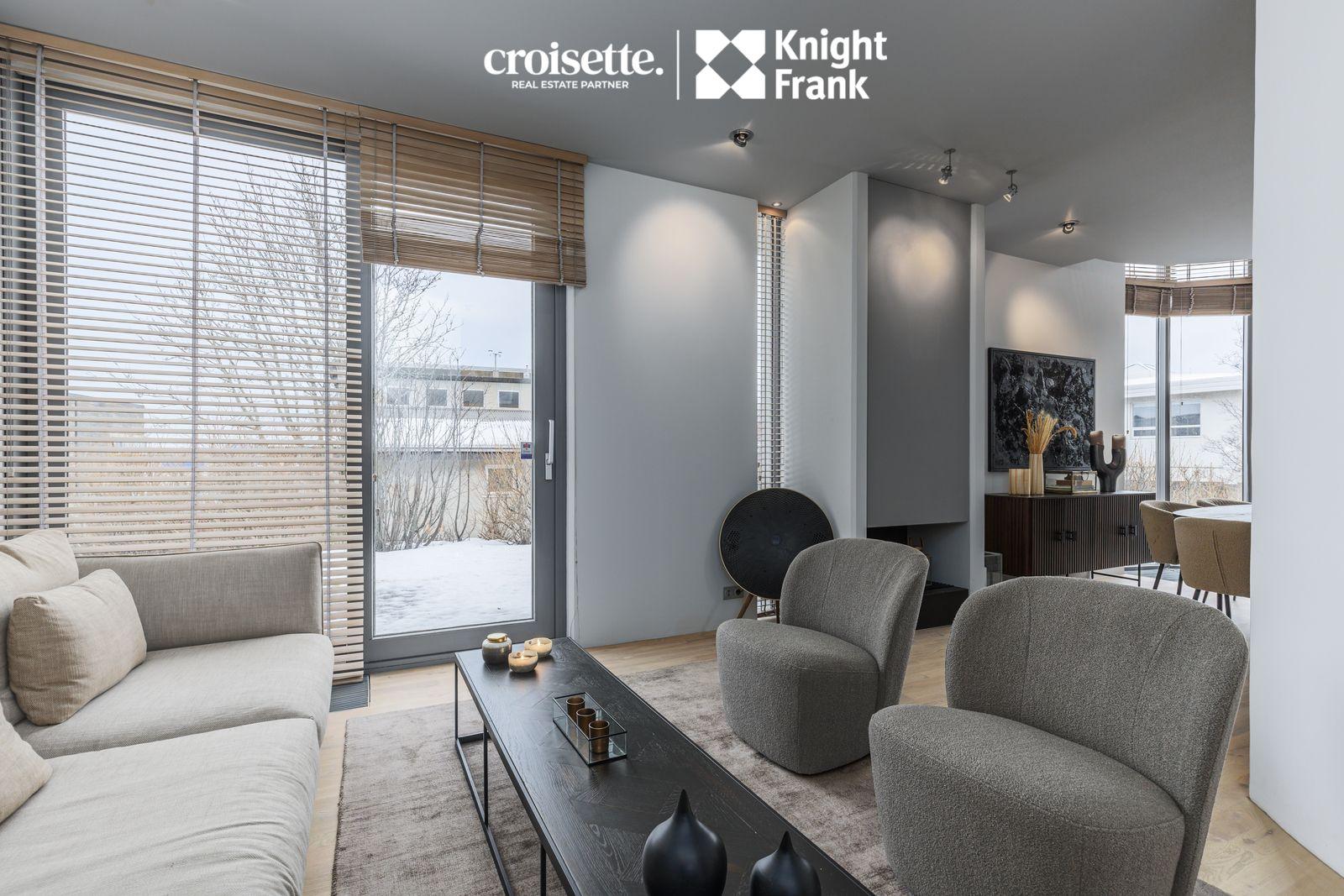 Eldhús, borðstofa og stofa: í þessu rými eru gólfsíðir gluggar, niðurfelldir ofnar og góð lofthæð. Eldhúsinnrétting er hvítlökkuð með marmara á borðum, Simens og Mile eldhústæki. Stór horngluggi er í borðstofu sem nær milli hæða. Útgengt er úr stofu út í garð. Arinn er í rýminu, staðsettur milli stofu og borðstofu.Gegnheilt niðurlímt og olíuborið eikarparket á gólfi.