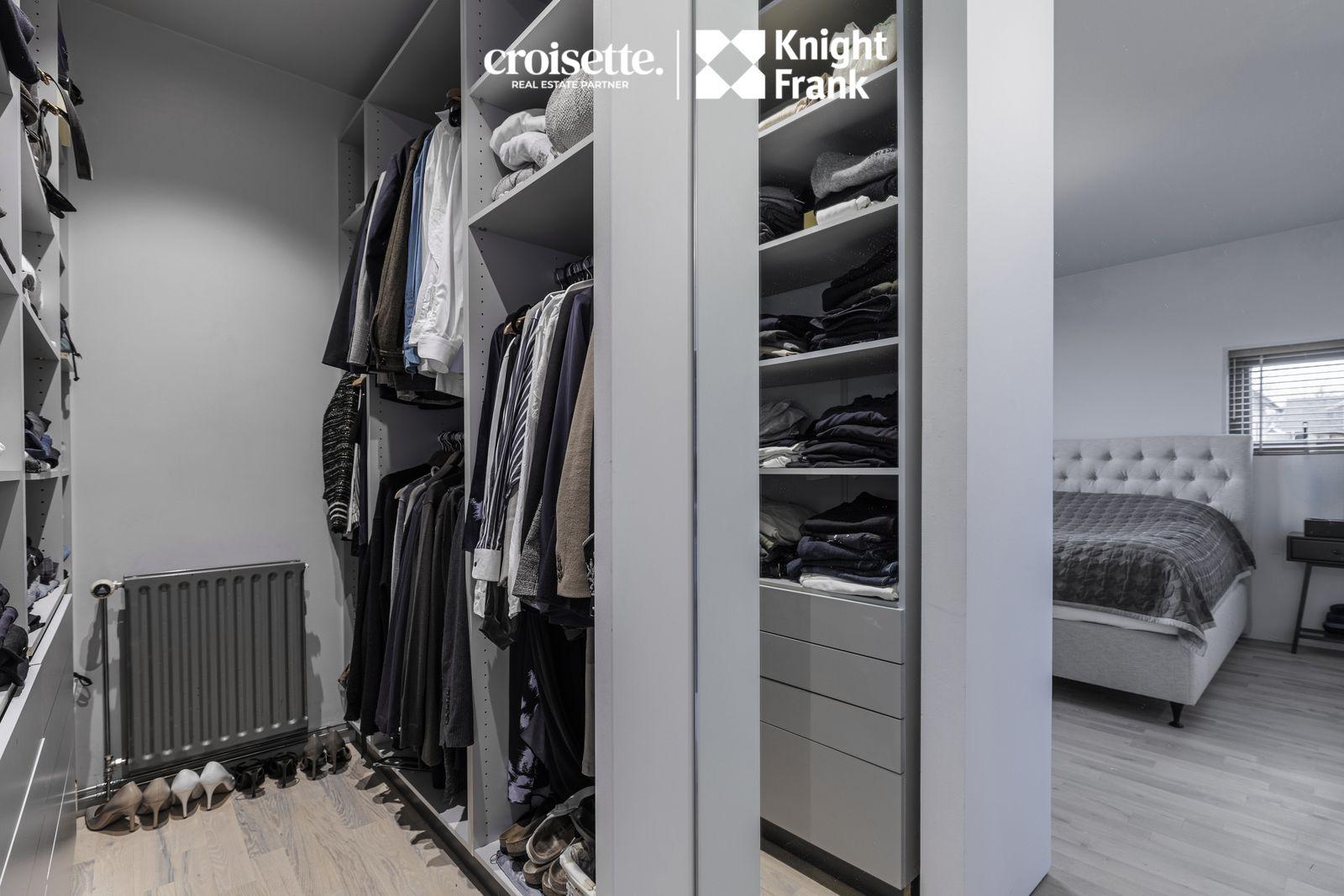 Hjónaherbergi: Herbergi með fataherbergi, útgengt út á svalir til suðurs ofan á bílskúr og þaðan eru tröppur niður í garð. Gegnheilt niðurlímt og olíuborið eikarparket á gólfi.