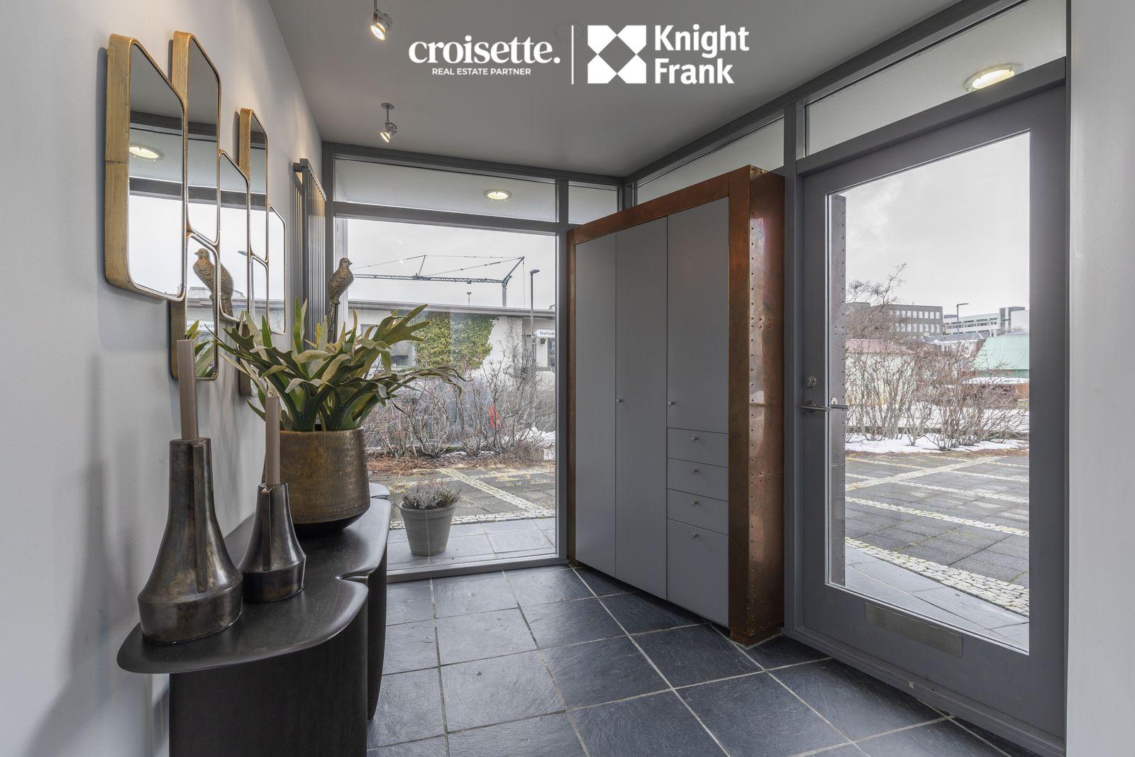 Forstofa: Björt og opin forstofa með gólfsíðum gluggum og skápum. Hiti í gólfi. Flísar úr náttúrusteini á gólfi. Gengið er niður tvö þrep úr forstofu/holi í alrými/eldhús, borðstofu og stofu.