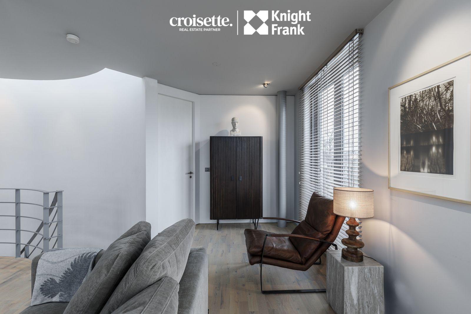 Nánari lýsing á efri hæð: Gengið er á efri hæð um bogadreginn járnstiga með viðarþrepum. Ofanbirta er yfir stiga.