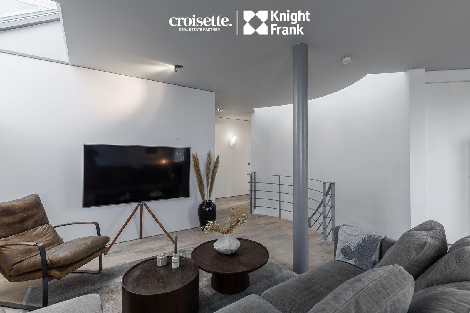 Fjölskyldurými/Sjónvarpshol: Opið og bjart rými með tveimur þakgluggum og hornglugga sem nær milli hæða, útgengt er út á litlar svalir til norðvesturs.