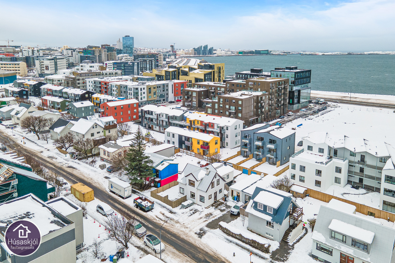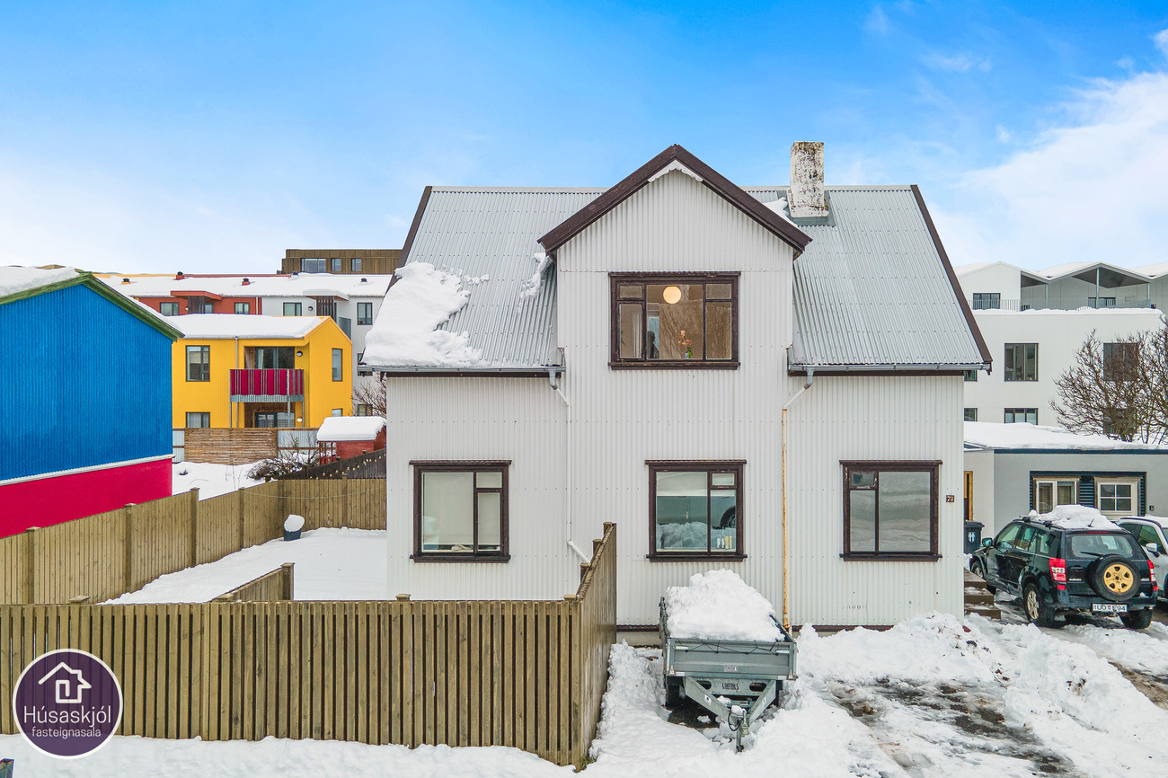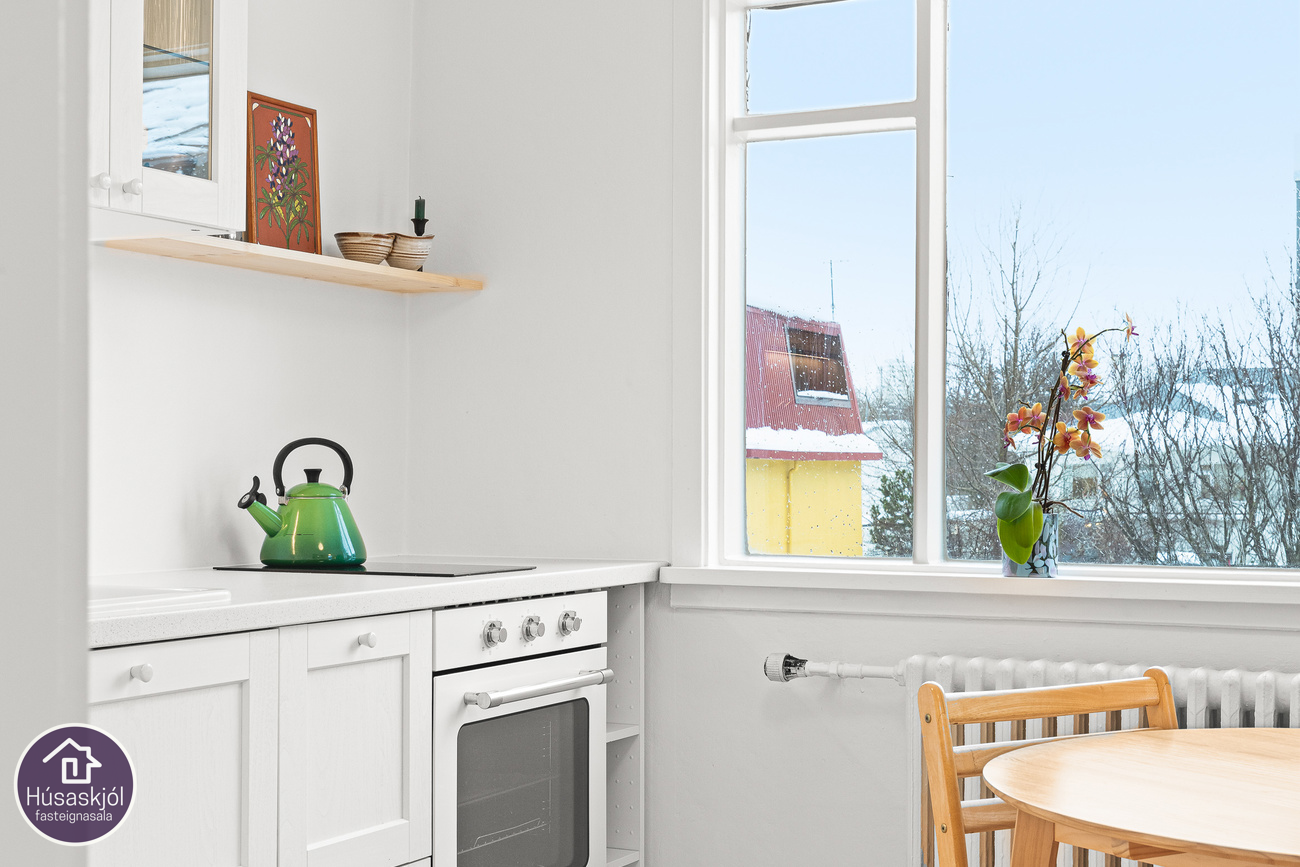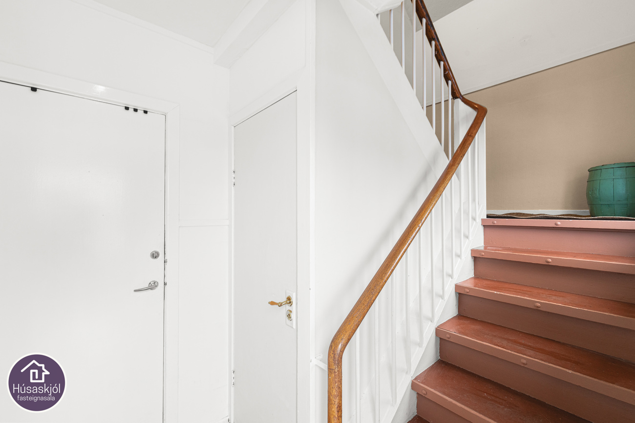 Gengið er inn um sameiginlegan inngang á miðhæð með íbúð neðri hæðar. Dúklagður stigi er upp í risíbúðina. Baðherbergið er rúmgott með sjarmerandi frístandandi baðkari, hvít innrétting með skúffum og innbyggðum vask, upphengt klósett, tengi fyrir þvottavél og opnanlegur gluggi. Eldhús og stofa er eitt opið og bjart alrými með gluggum á tvo vegu. Eldhúsinnréttingin er hvít með efri-og neðri skápum, innbyggður ísskápur, span helluborð með tveimur hellum og hvítur bakaraofn. Svefnherbergin eru tvö og eru þau bæði með góðum gluggum og úr hjónaherberginu er útsýni út á sjó milli húsa. Geymsla er undir stiga á fyrstu hæð hússins.