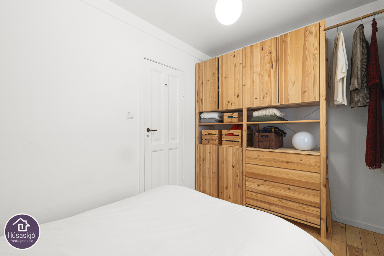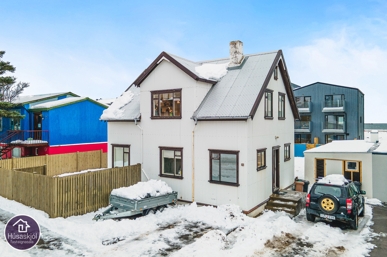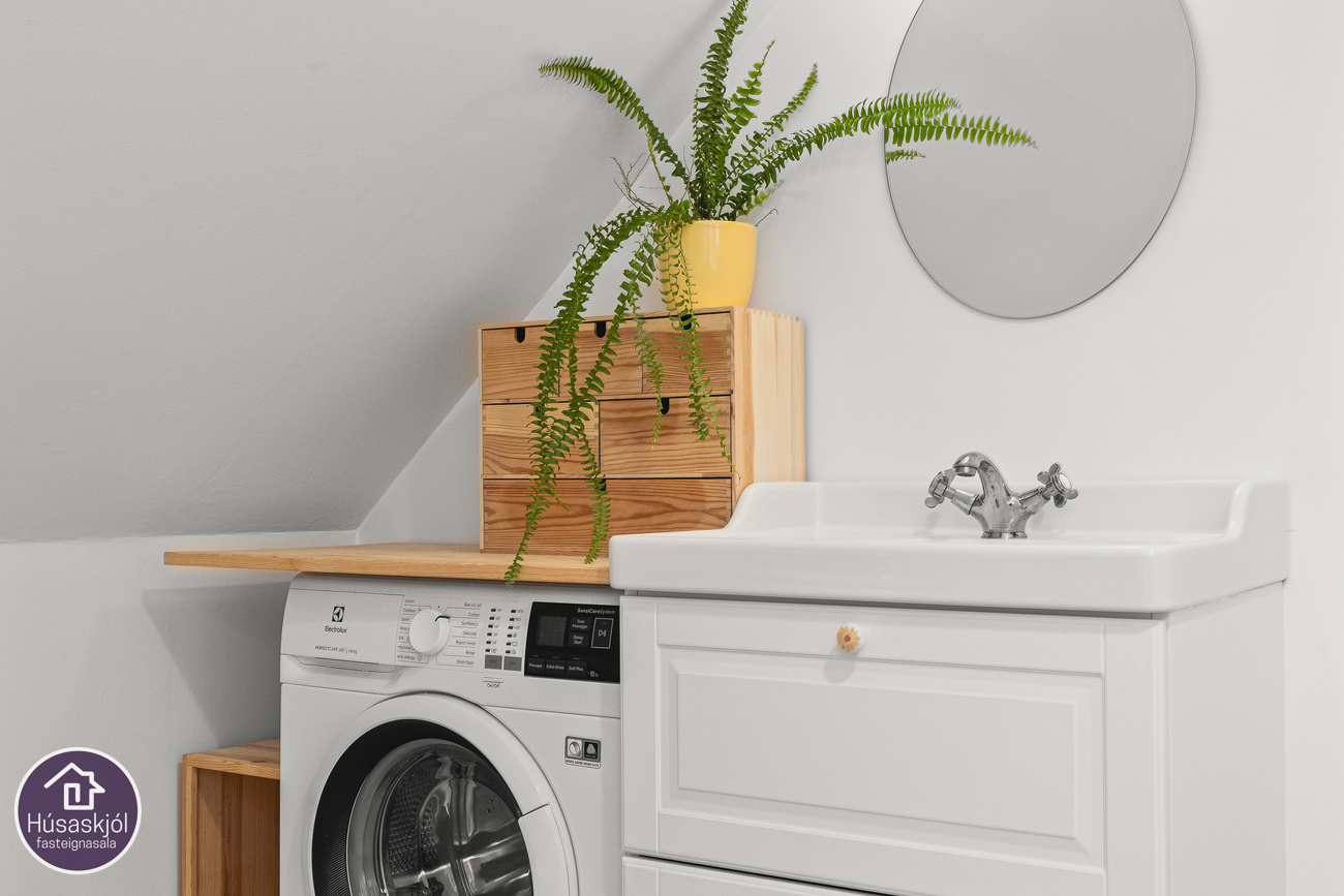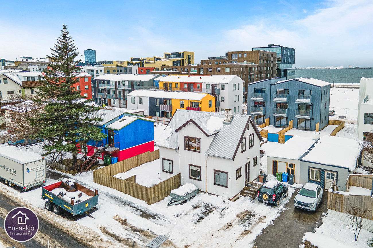 Gengið er inn um sameiginlegan inngang á miðhæð með íbúð neðri hæðar. Dúklagður stigi er upp í risíbúðina. Baðherbergið er rúmgott með sjarmerandi frístandandi baðkari, hvít innrétting með skúffum og innbyggðum vask, upphengt klósett, tengi fyrir þvottavél og opnanlegur gluggi. Eldhús og stofa er eitt opið og bjart alrými með gluggum á tvo vegu. Eldhúsinnréttingin er hvít með efri-og neðri skápum, innbyggður ísskápur, span helluborð með tveimur hellum og hvítur bakaraofn. Svefnherbergin eru tvö og eru þau bæði með góðum gluggum og úr hjónaherberginu er útsýni út á sjó milli húsa. Geymsla er undir stiga á fyrstu hæð hússins.