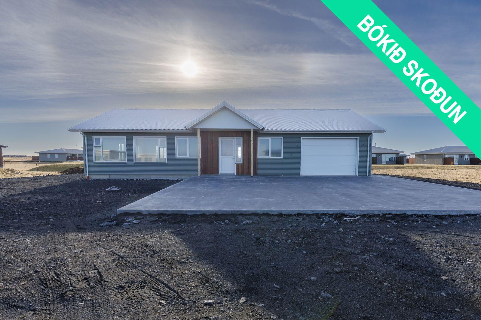 Gólfefni og innréttingar: Kaupendur hafa möguleika á að velja harðparket frá Birgisson í samráði við verktaka sem sér einnig um lögn parketsins. Hvítar innihurðir og hvítir gólflistar verða settir upp.Byggingarlýsing:Gluggar og hurðarkarmar eru hvítir tré/ál gluggar með tvöföldu gleri. Bílskúrshurð er úr lituðu stáli með rafmagnsopnun. Þakið er byggt upp með kraftsperrum og klætt með báruklæðningu. Þakkantur er úr timbri og útveggir eru klæddir báruáli. Gert er ráð fyrir tengingu hleðslustöðvar fyrir rafbíla í rafmagnstöflu hússins.