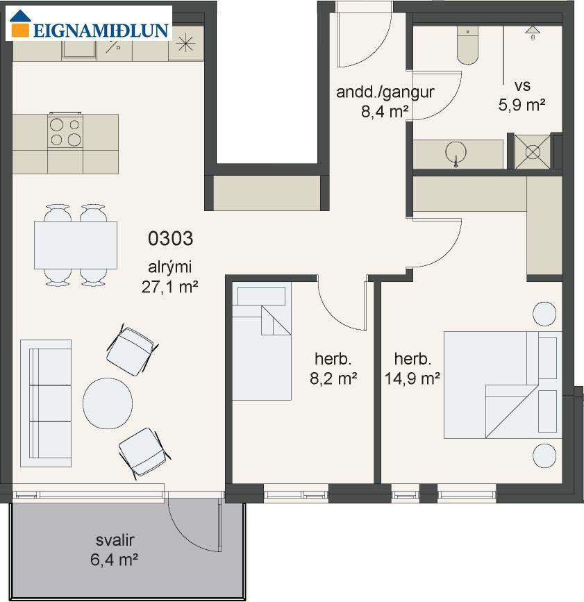Nánar: Íbúð merkt 03-03 er með 2 svefnherbergjum,eldhúsi, stofu og baðherbergi. Tengi fyrir þvottavél og þurkara er á baði. Geymsla í sameign fylgir. Íbúðinni fylgir stæði í bílakjallara merkt B-119.