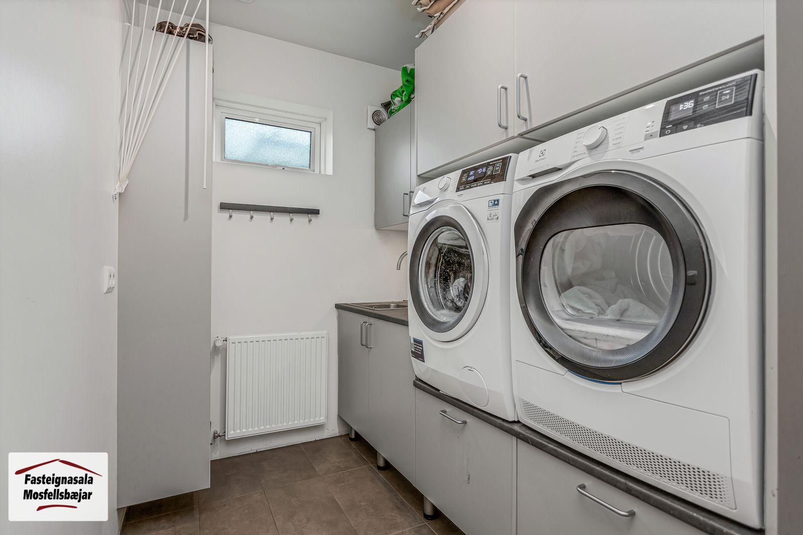 Þvottahús er með innréttingu og flísum á gólfi. Í innréttingu er gert ráð fyrir þvottavél og þurrkara í vinnuhæð. Gluggi er á þvottahúsi.