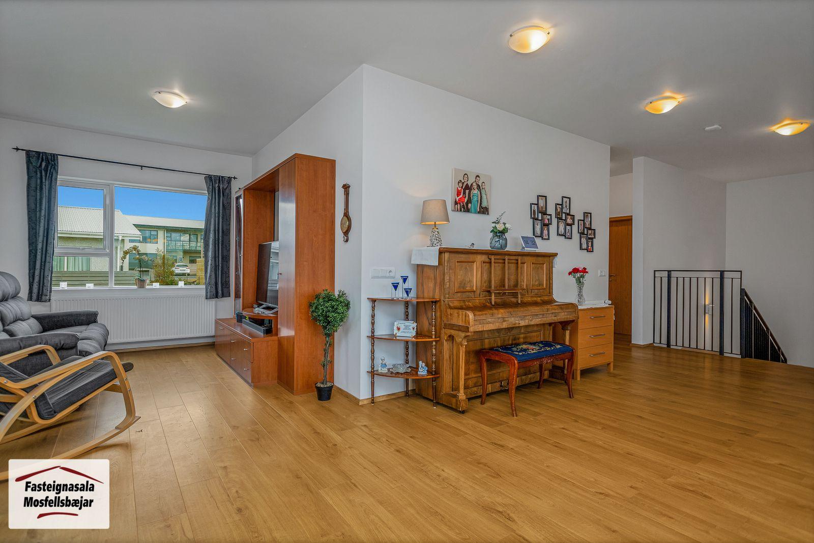Sjónvarpshol er inn af stofu og með parketi á gólfi. Hægt að loka og breyta í fimmta svefnherbergið.