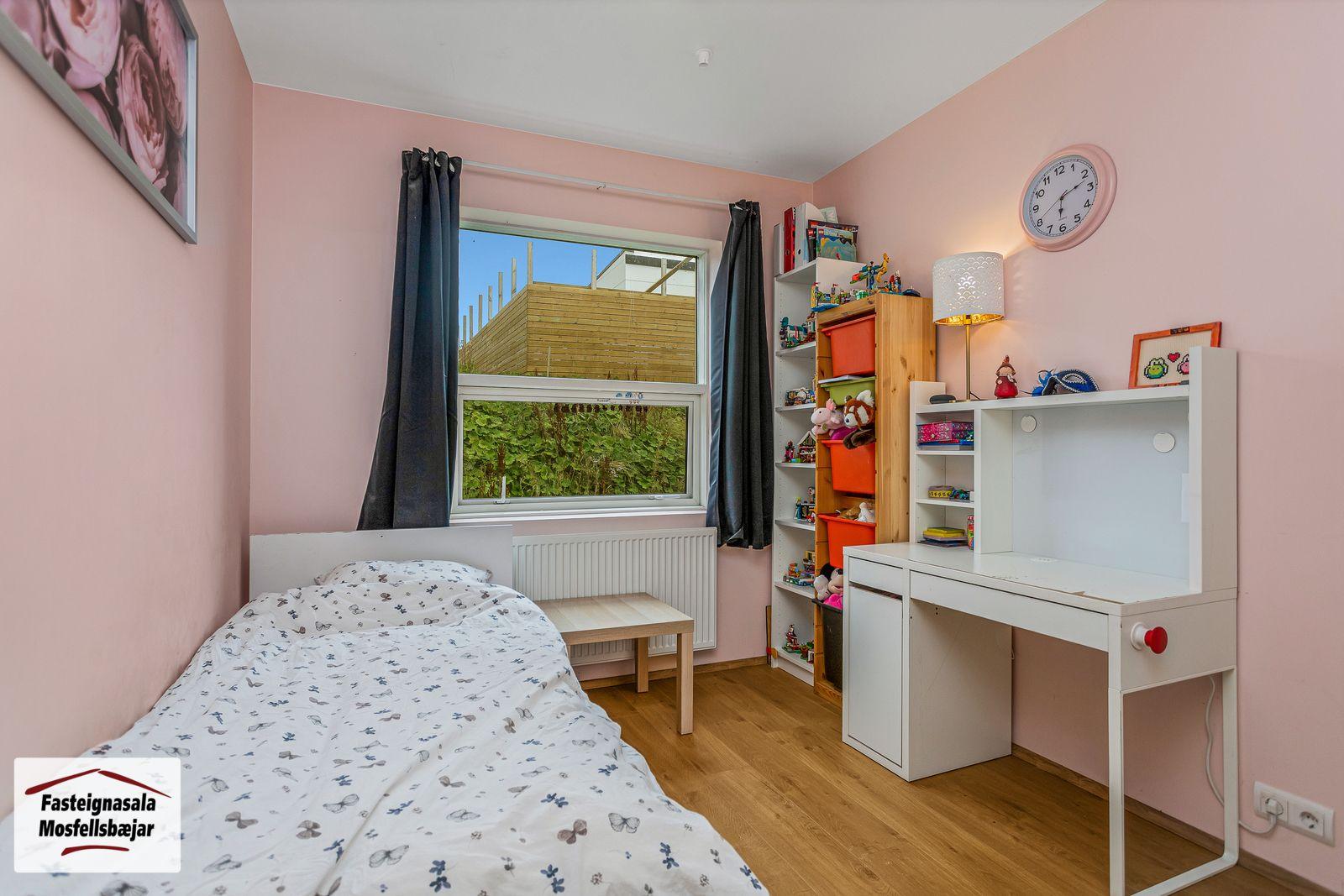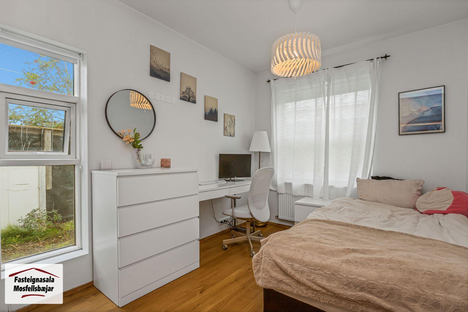 Svefnherbergi 1 (hjónaherbergi) er með parketi á gólfi og fataskápum. Inn af hjónaherbergi er