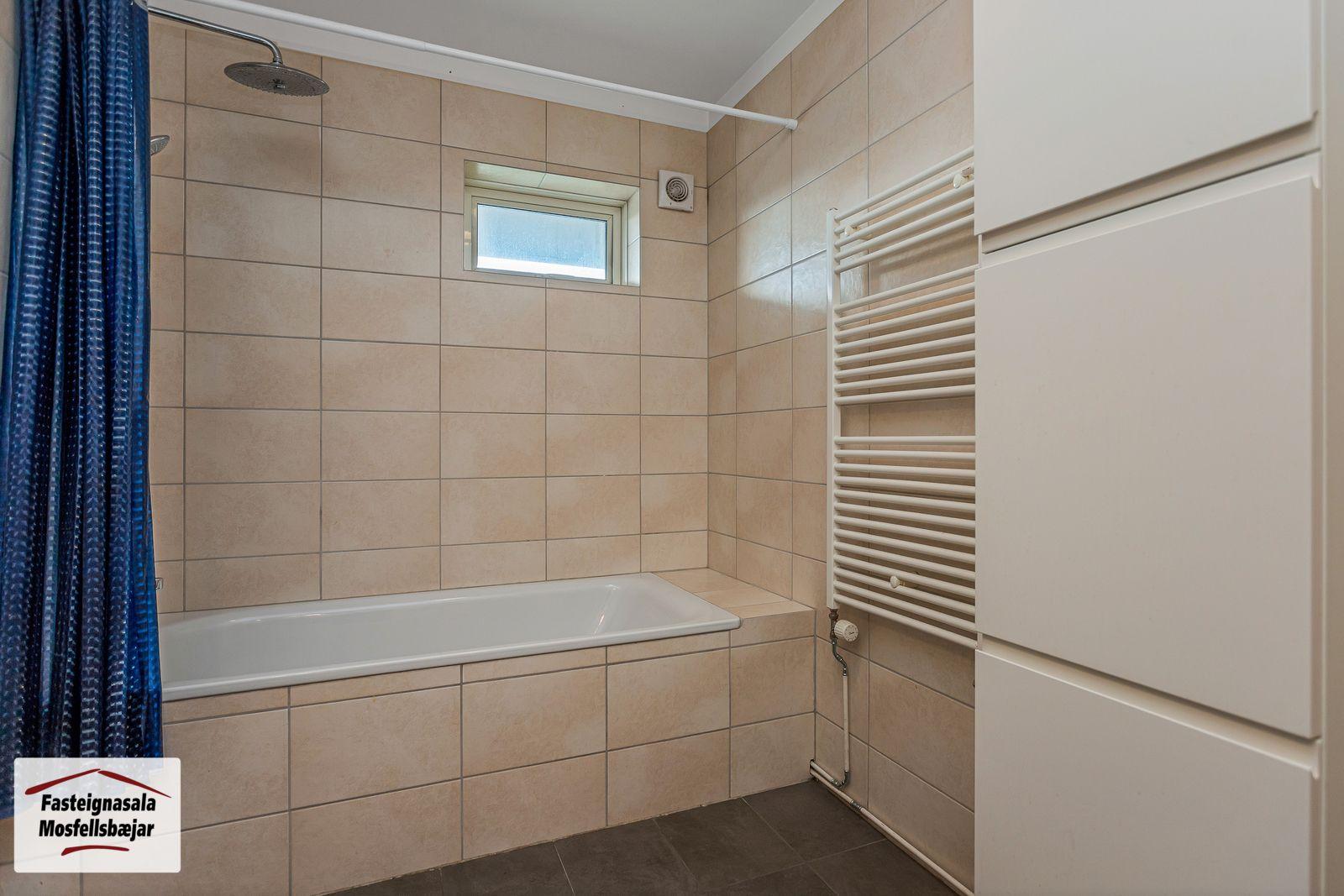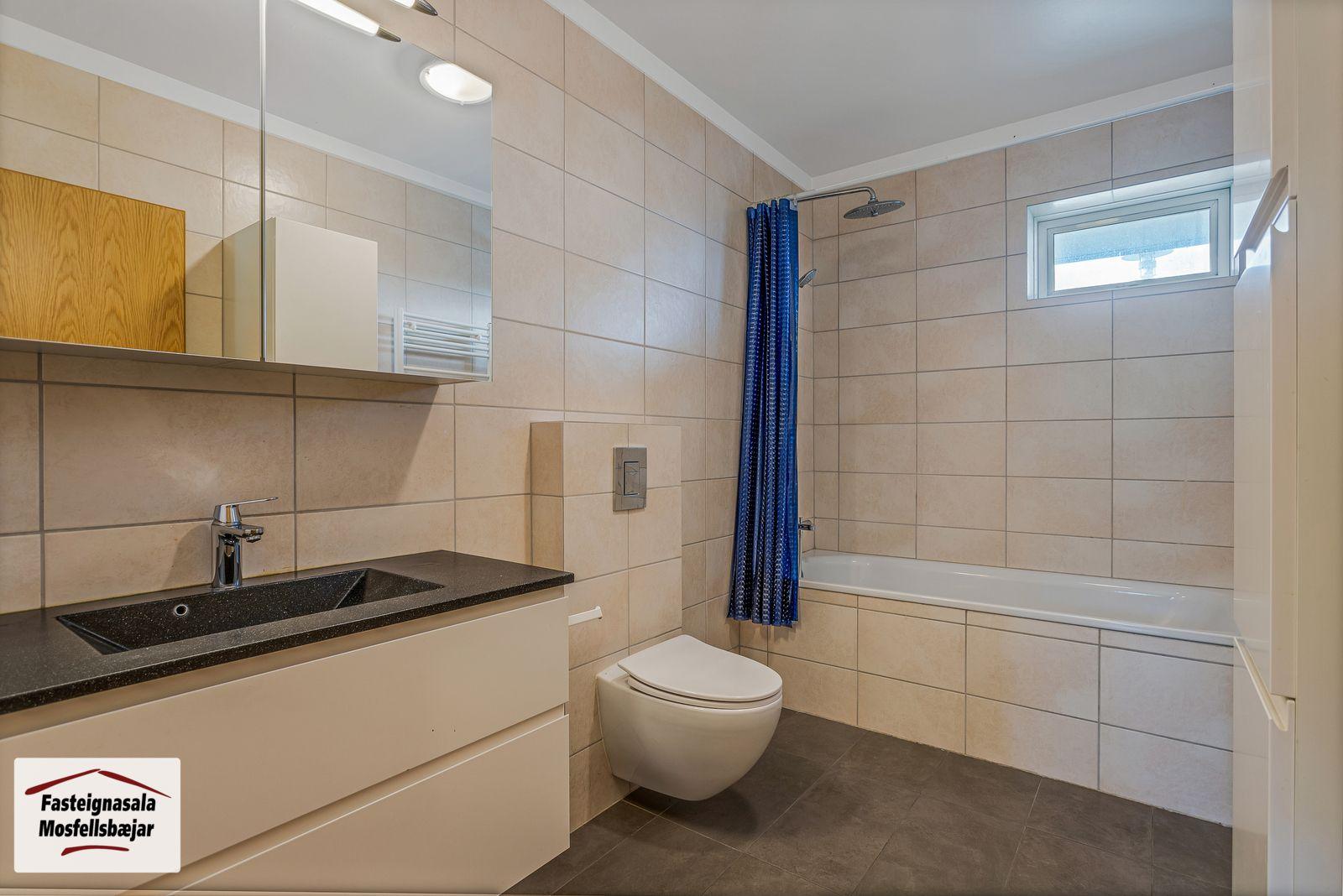 Baðherbergi 2 er með flísum á gólfi og veggjum, innréttingu, handlaug, vegghengdu salerni, handklæðaofni og baðkari með sturtuaðstöðu. Gluggi er á baðherbergi.