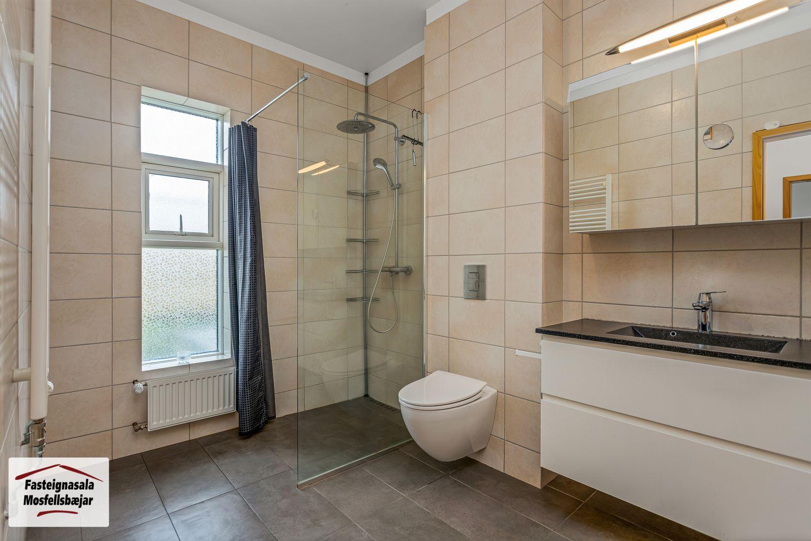 Baðherbergi 1 er með flísum á gólfi og veggjum, innréttingu, handlaug, vegghengdu salerni, handklæðaofni og 'walk in' sturtu. Gluggi er á baðherbergi.