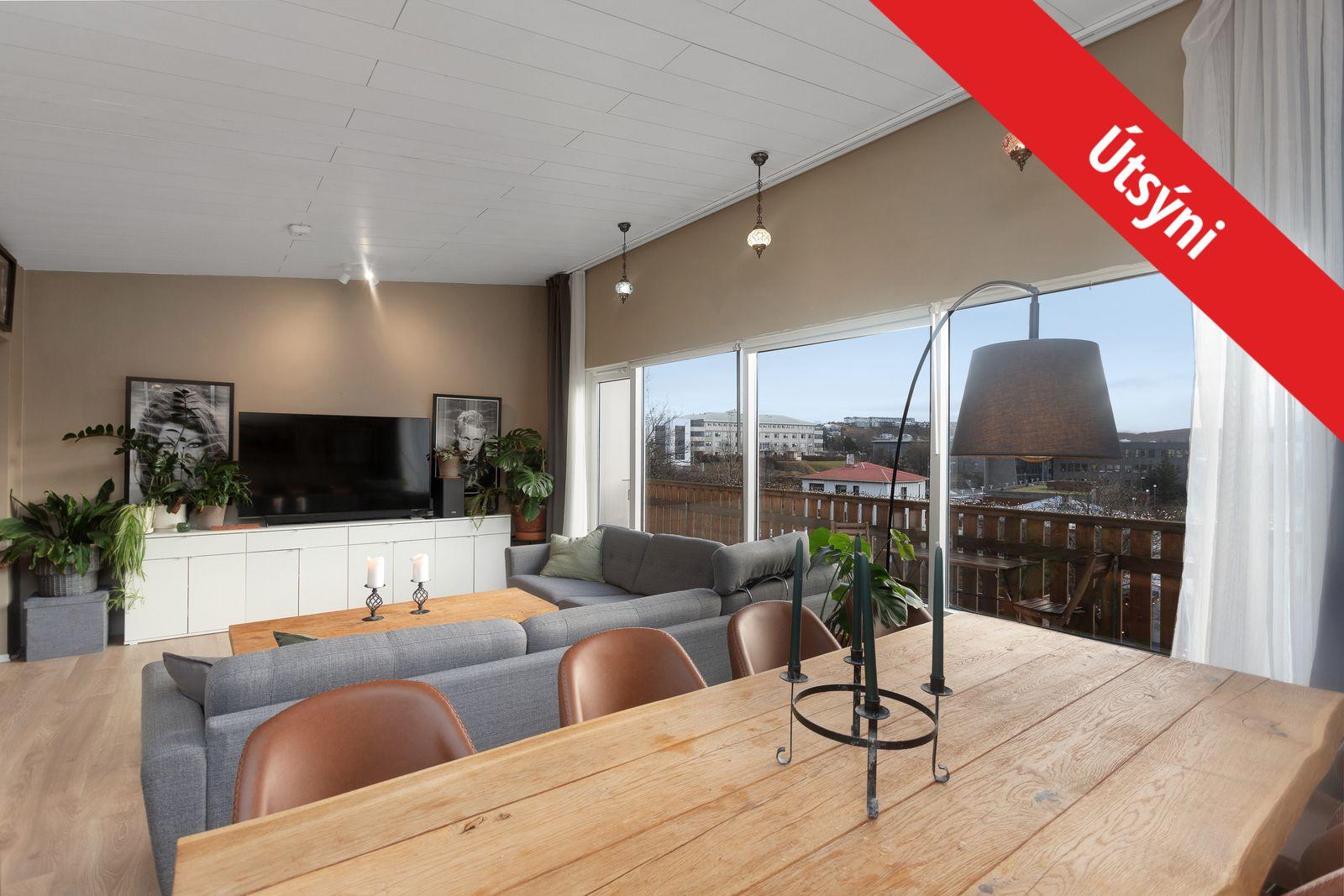 Stofa / borðstofa: Björt og falleg stofa með aukinni lofthæð og útgengi á 15 fm suðursvalir. Glæsilegt útsýni yfir lækinn og til fjalla.