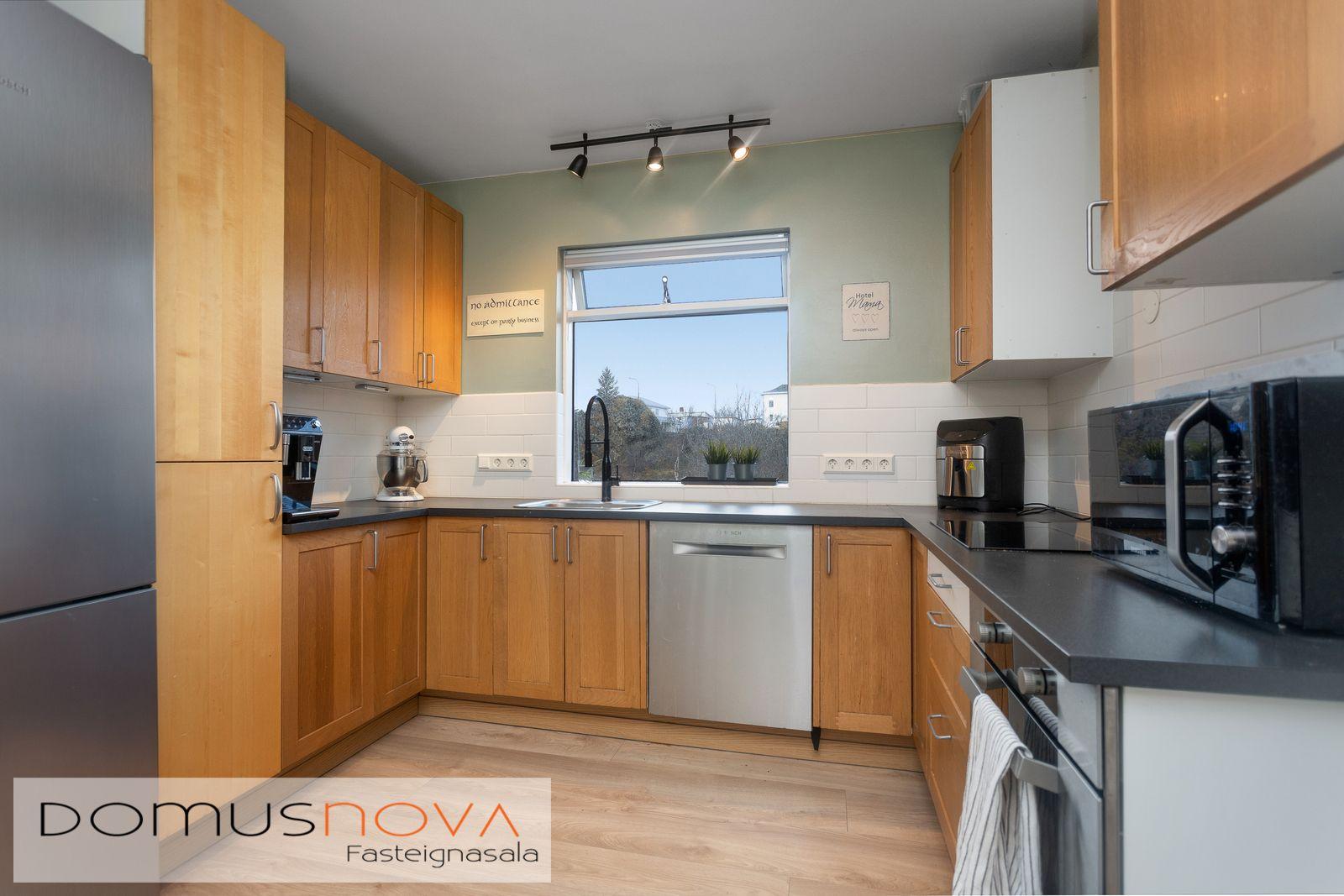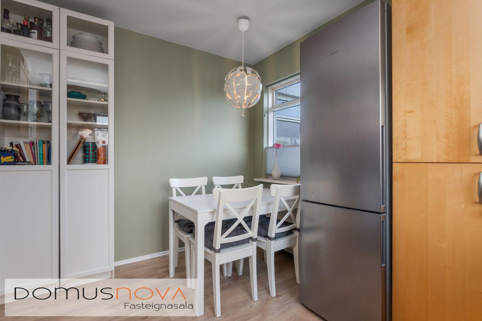 Eldhús: Rúmgott og bjart með gluggum á tvo vegu, innrétting með miklu skápaplássi, tengi fyrir uppþvottavél, span helluborð, ofn undir borði. Flísar á veggjum að hluta. Harðparket á gólfi.