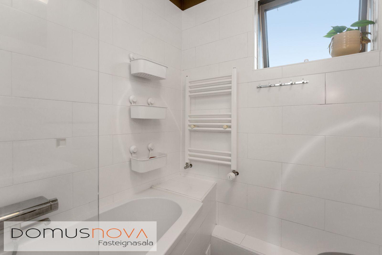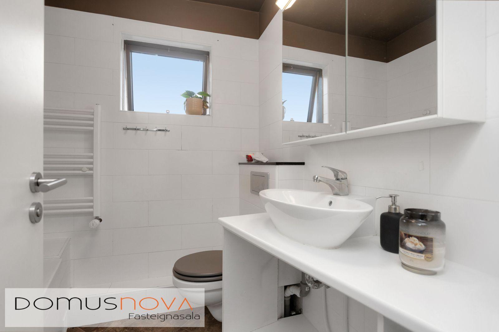 Baðherbergi 1: Flísalagt í hólf og gólf. Baðkar með sturtu og sturtugleri, opin innrétting undir vaski, handklæðaofn, upphengt salerni.