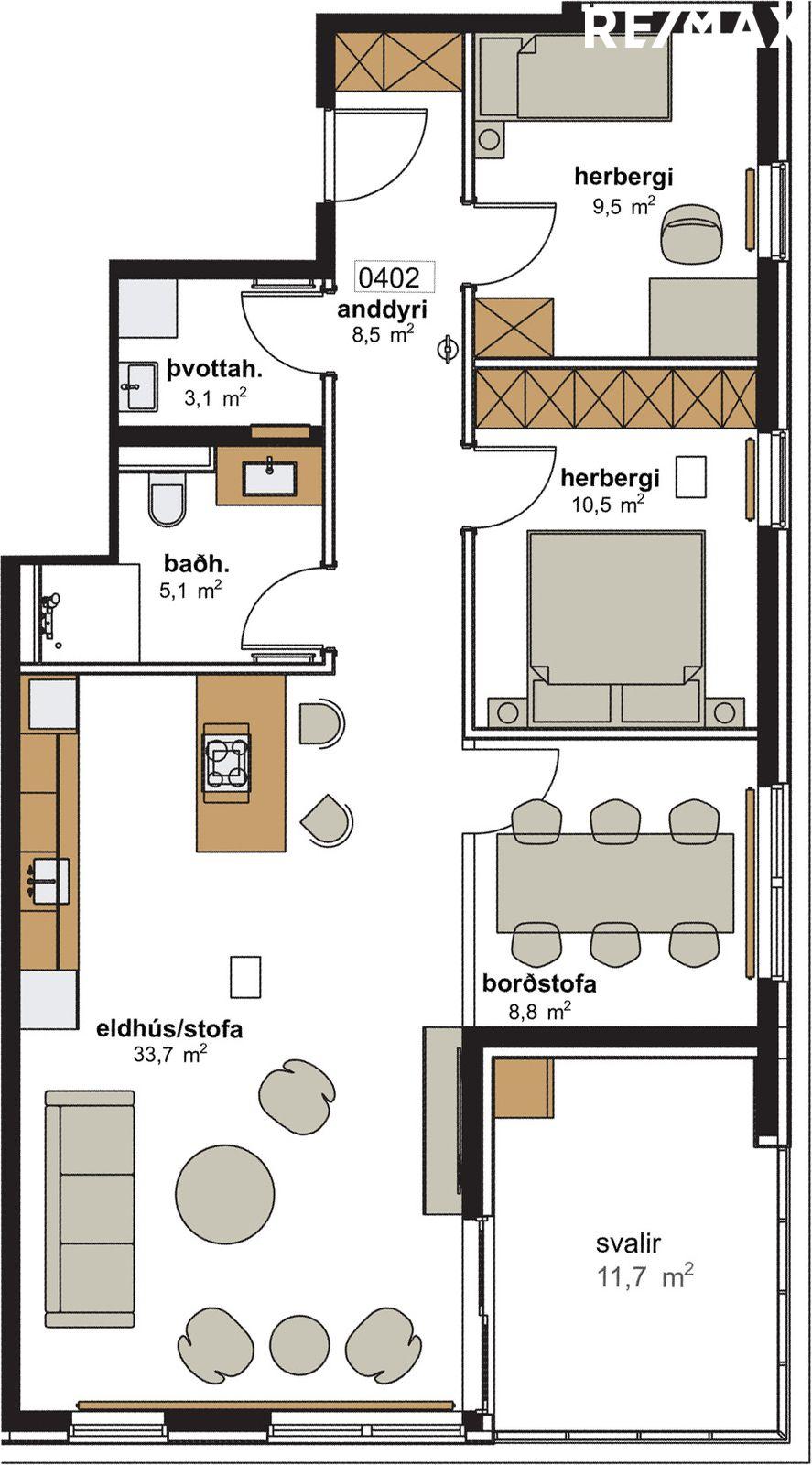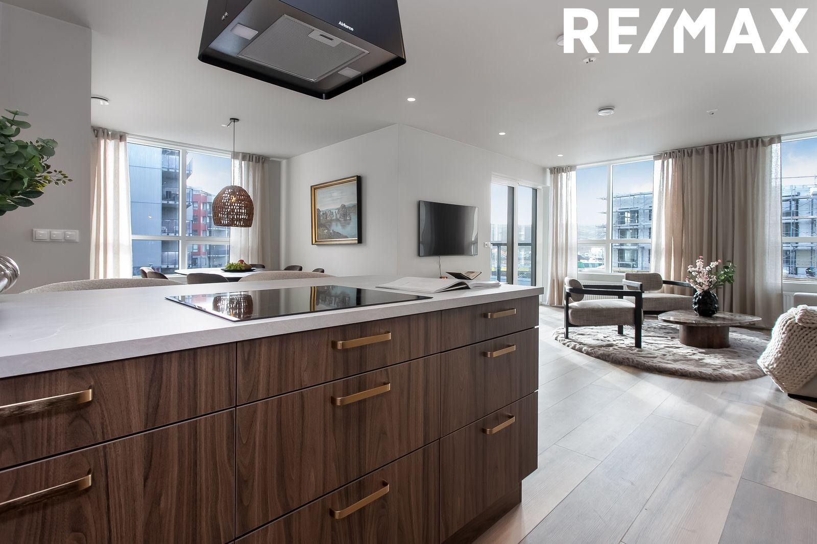 Íbúð 402: Falleg 96,6 fm 3ja-4ra herbergja íbúð á 4 hæð, ásamt stæði í bílakjallara. Íbúðin er 91,6 fm ásamt 5 fm geymslu á jarðhæð, þvottahús er innan íbúðar. Hægt er að bæta við einu herbergi á kostnað stofunnar.