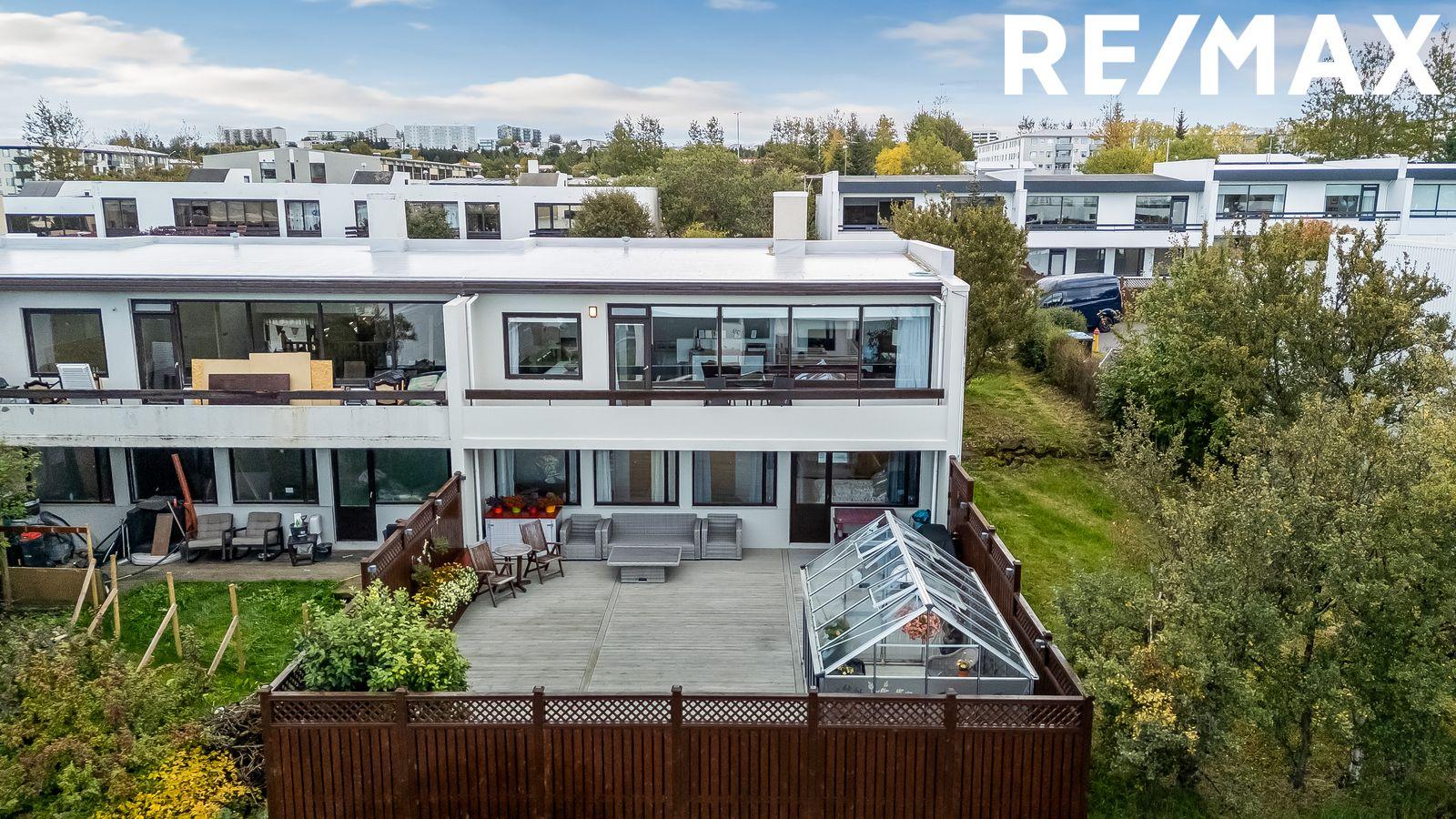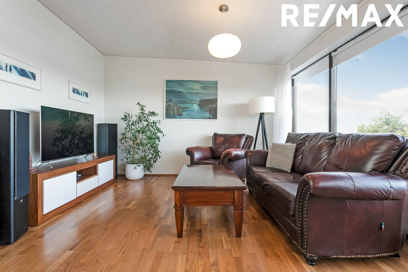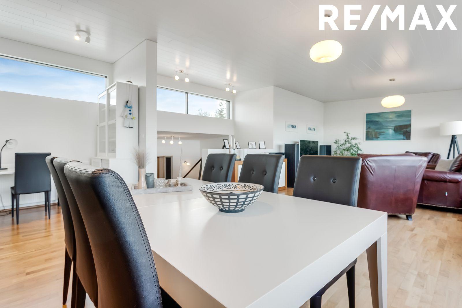 Nánari lýsing: Forstofa er með fataskáp og flísum á gólfi. Gestasalerni er inn af forstofu með upphengdu salerni, hvít innrétting með handlaug. Flísar á gólfi. Eldhús er með endurnýjaðri innréttingu með góðu skápaplássi. Innbyggð uppþvottavél. Gott pláss fyrir eldhúsborð. Flísar á gólfi. Borðstofa/Stofa er samliggjandi opið rúmgott rými á efri palli. Parket á gólfi. Efri gluggar eru í stofunni svo það eru gluggar á tvo vegu sem gerir rýmið einstaklega bjart. Úr stofunni er útgengt á stórar vestursvalir með fallegu útsýni. Hjónaherbergi er á neðri hæð með upprunalegum skápum. Parket á gólfi og er útgengi á lóð. Svefnherbergi II er með parketi á gólfi. Svefnherbergi III er með parketi á gólfi. Svefnherbergi IV er með máluðu gólfi. Baðherbergi er rúmgott. Upphengdu salerni, sturtu og baðkari. Flísar á gólfi og veggjum. Hol er milli eins herbergis og þvottahús, það nýtist vel sem sjónvarpsherbergi. Útgengi er úr holi. Þvottaherbergi er mjög rúmgott með tengi fyrir þvottavél og þurrkara. Undir stiga eru tvær litlar geymslur önnur með skolvask. Bílskúr er 20 fm. Lóðin baka við hús er með stórum palli og glerskála sem nýtist sem setustofa.