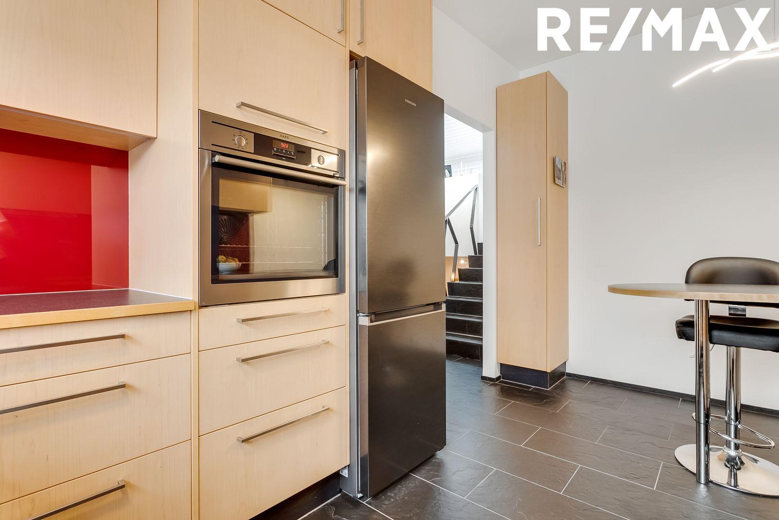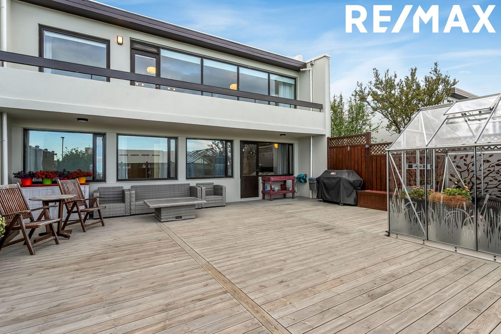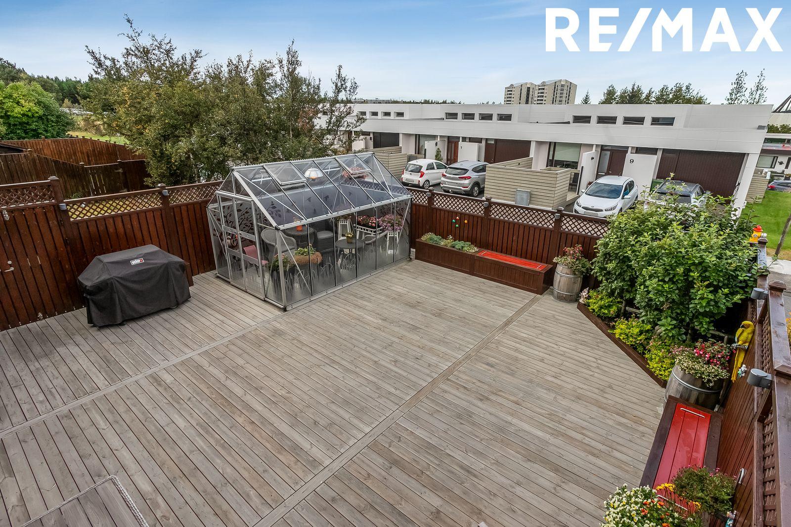 Nánari lýsing: Forstofa er með fataskáp og flísum á gólfi. Gestasalerni er inn af forstofu með upphengdu salerni, hvít innrétting með handlaug. Flísar á gólfi. Eldhús er með endurnýjaðri innréttingu með góðu skápaplássi. Innbyggð uppþvottavél. Gott pláss fyrir eldhúsborð. Flísar á gólfi. Borðstofa/Stofa er samliggjandi opið rúmgott rými á efri palli. Parket á gólfi. Efri gluggar eru í stofunni svo það eru gluggar á tvo vegu sem gerir rýmið einstaklega bjart. Úr stofunni er útgengt á stórar vestursvalir með fallegu útsýni. Hjónaherbergi er á neðri hæð með upprunalegum skápum. Parket á gólfi og er útgengi á lóð. Svefnherbergi II er með parketi á gólfi. Svefnherbergi III er með parketi á gólfi. Svefnherbergi IV er með máluðu gólfi. Baðherbergi er rúmgott. Upphengdu salerni, sturtu og baðkari. Flísar á gólfi og veggjum. Hol er milli eins herbergis og þvottahús, það nýtist vel sem sjónvarpsherbergi. Útgengi er úr holi. Þvottaherbergi er mjög rúmgott með tengi fyrir þvottavél og þurrkara. Undir stiga eru tvær litlar geymslur önnur með skolvask. Bílskúr er 20 fm. Lóðin baka við hús er með stórum palli og glerskála sem nýtist sem setustofa.
