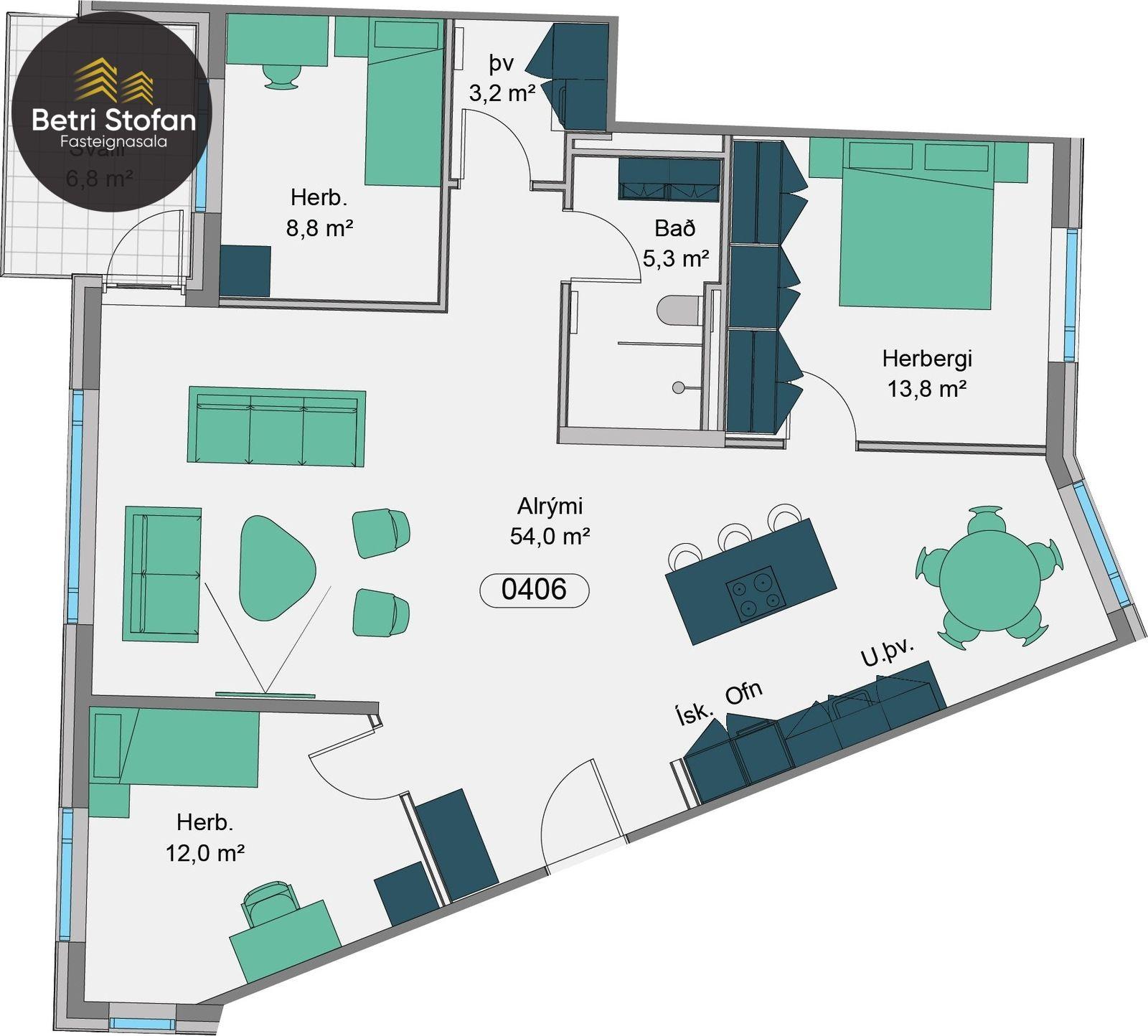 Íbúð 406 er 128,6 fermetra íbúð á fjórðu hæð, efstu. Steinn á borðplötum og loftskiptikerfi, hiti í gólfum. Eigninni fylgir 16,3fm. frístundaskúr ásamt tveimur bílastæðum í lokaðri bílageymslu (merkt B54 og B10). Lofthæðin er góð í íbúðinni. Fallegt útsýni. Svalir til vesturs.