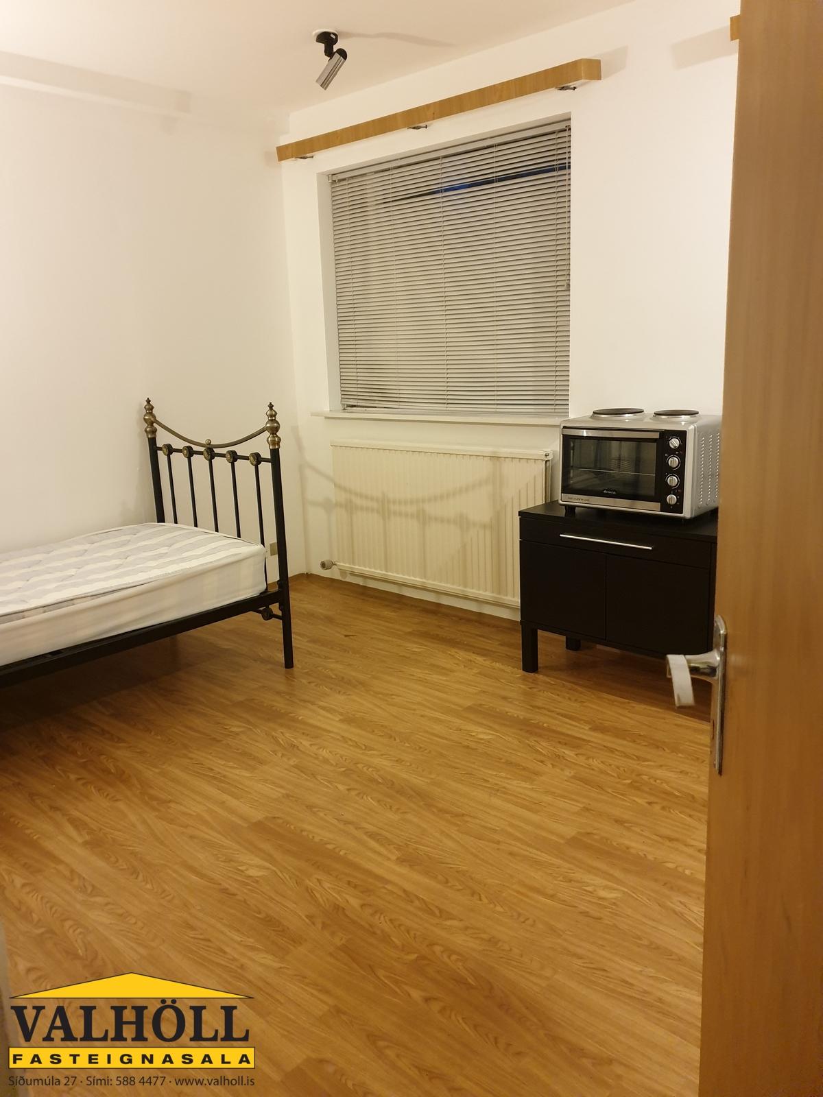 Nánari lýsing: Hol/anddyri: með fataskápum og parketi á gólfi. Borðstofa og stofa: eru samliggjandi en þó er hvort rýmið út af fyrir sig með parket á gólfi og útgengi á suðursvalir. Eldhús: með hvítri u-laga innréttingu, borðkrók og með dúk á gólfi. Hol: sem er fyrir framan herbergin með skáp og parketi á gólfi. Baðherbergi: með innréttingu, baðkari og flísum á gólfi og veggjum. Svefnherbergi I: með fataskápum og parketi á gólfi. Svefnherbergi II: lítið barnherbergi með parketi á gólfi. Svefnherbergi III: með fataskáp og parketi á gólfi. Herbergi í kjallara: 14,2 fm með tveimur gluggum og dúk á gólfi. Er núna útleigu. Aðgangur að sameiginlegu klósetti. Þvottahús: sameiginlegt kjallara þar sem hver er með sína þvottavél og þurrkara. Geymsla: góð sérgeymsla í kjallara með hillum. Geymslan er u.þ.b. 5 fm og virðist ekki skráð inn í birta stærð eignar.