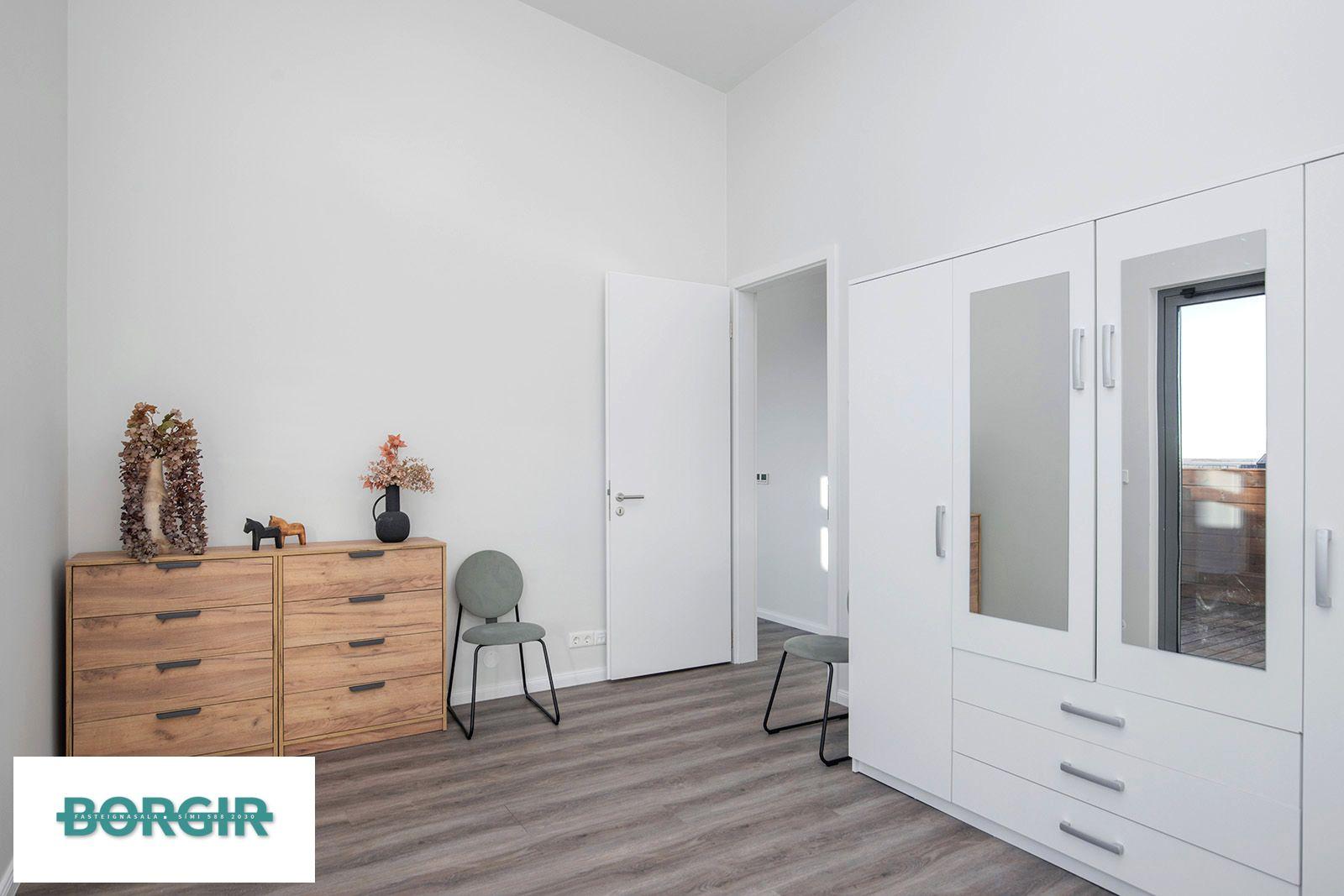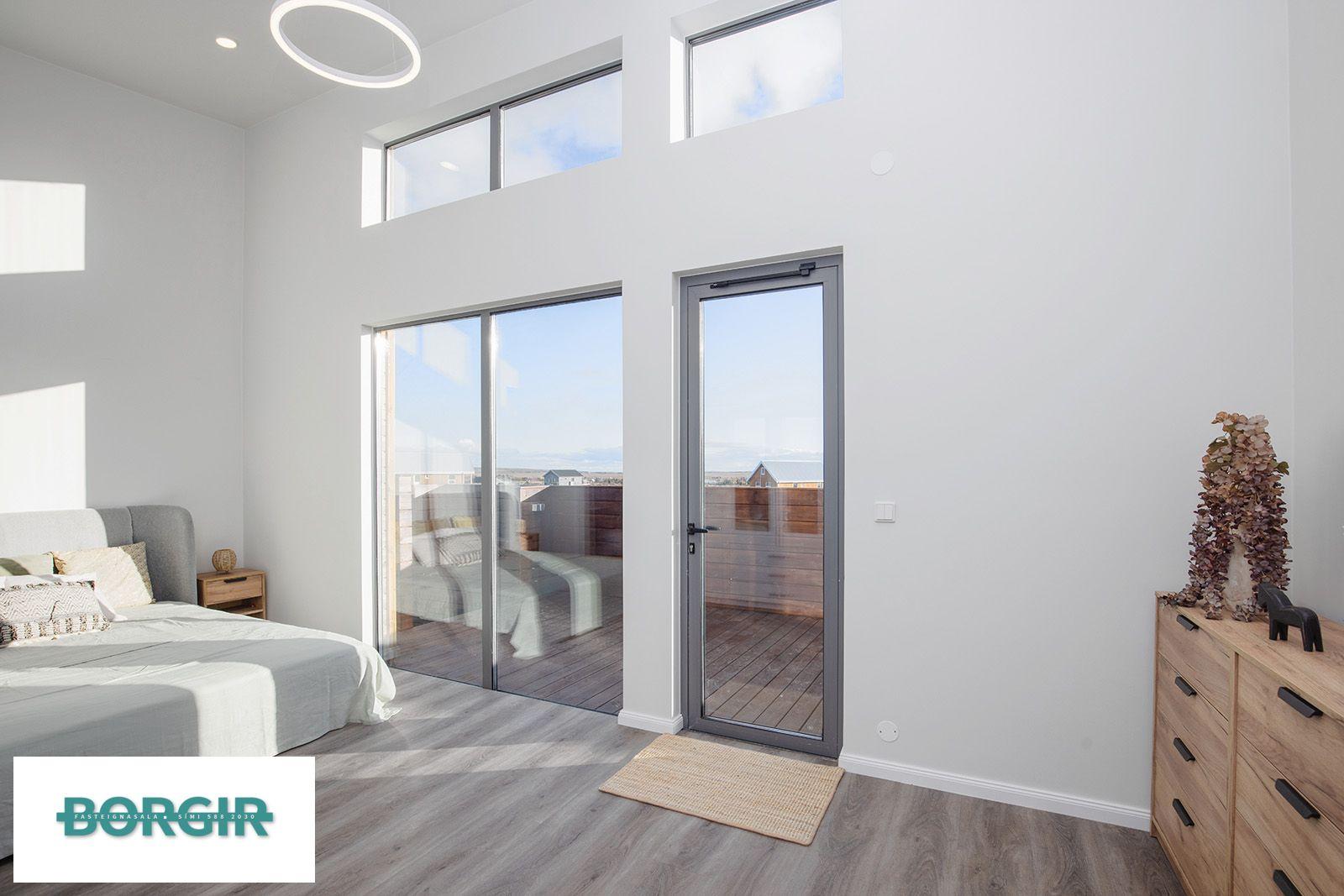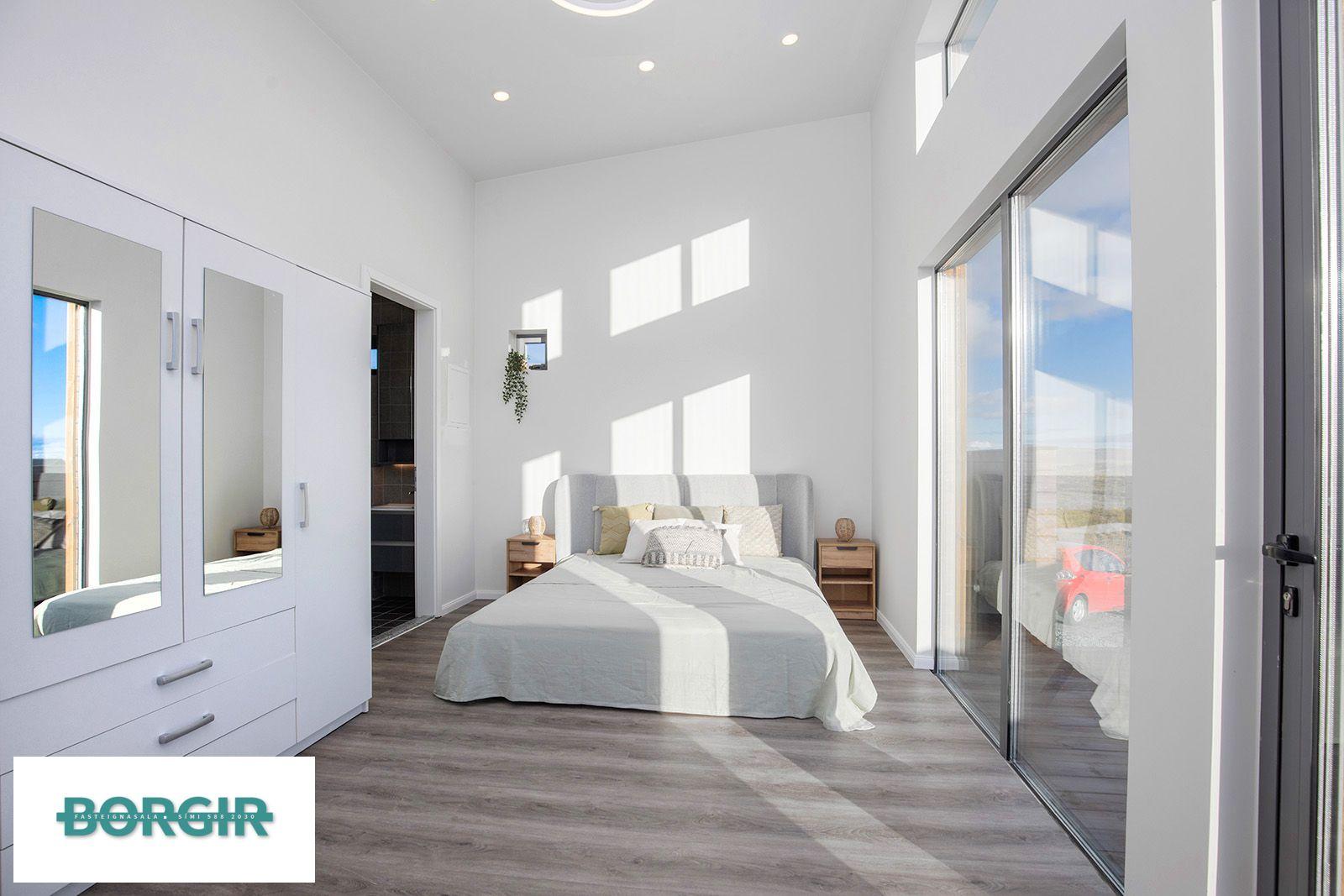 Hjónaherbergi: Með plastparketi, fataskáp, gólfsíðum gluggum og hurð út á pall, innaf herbergi er baðherbergi með sturtuklefa, baðinnréttingu með vask og upphengt salerni. Físar á gólfi og veggjum.