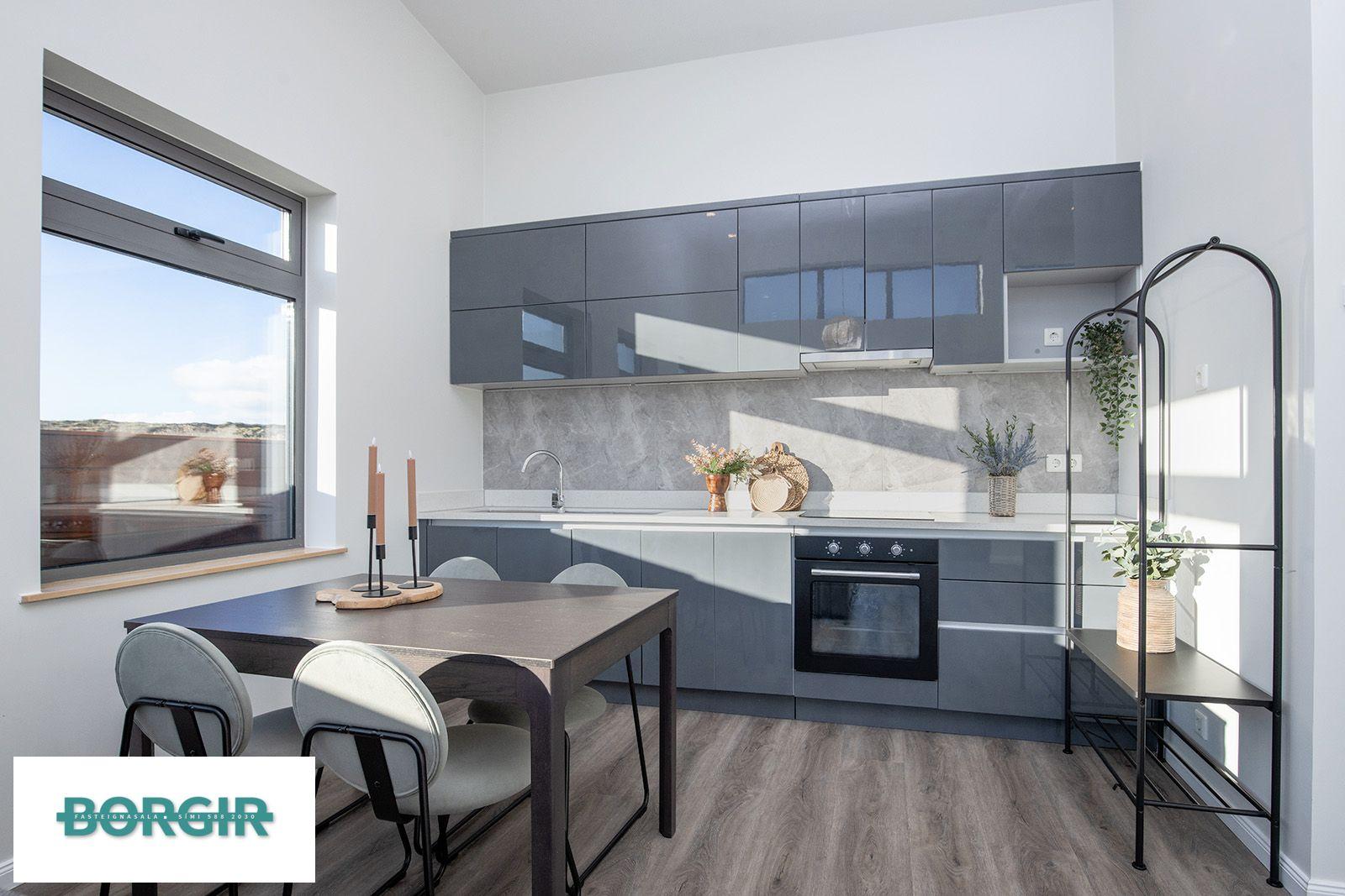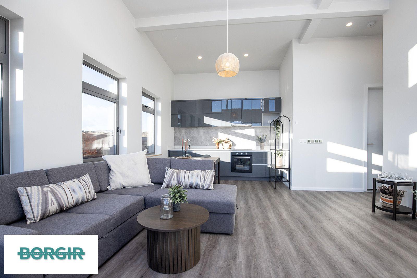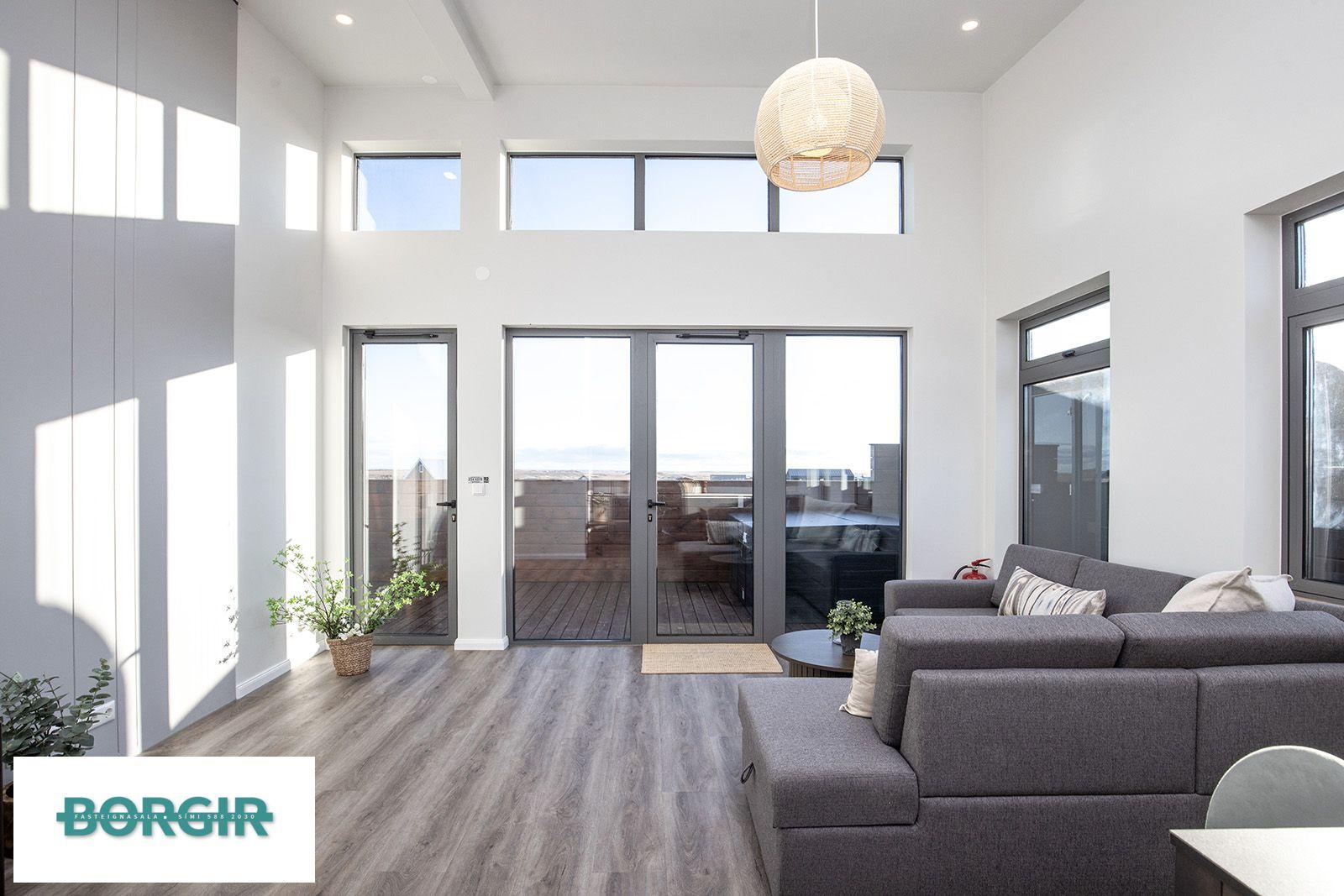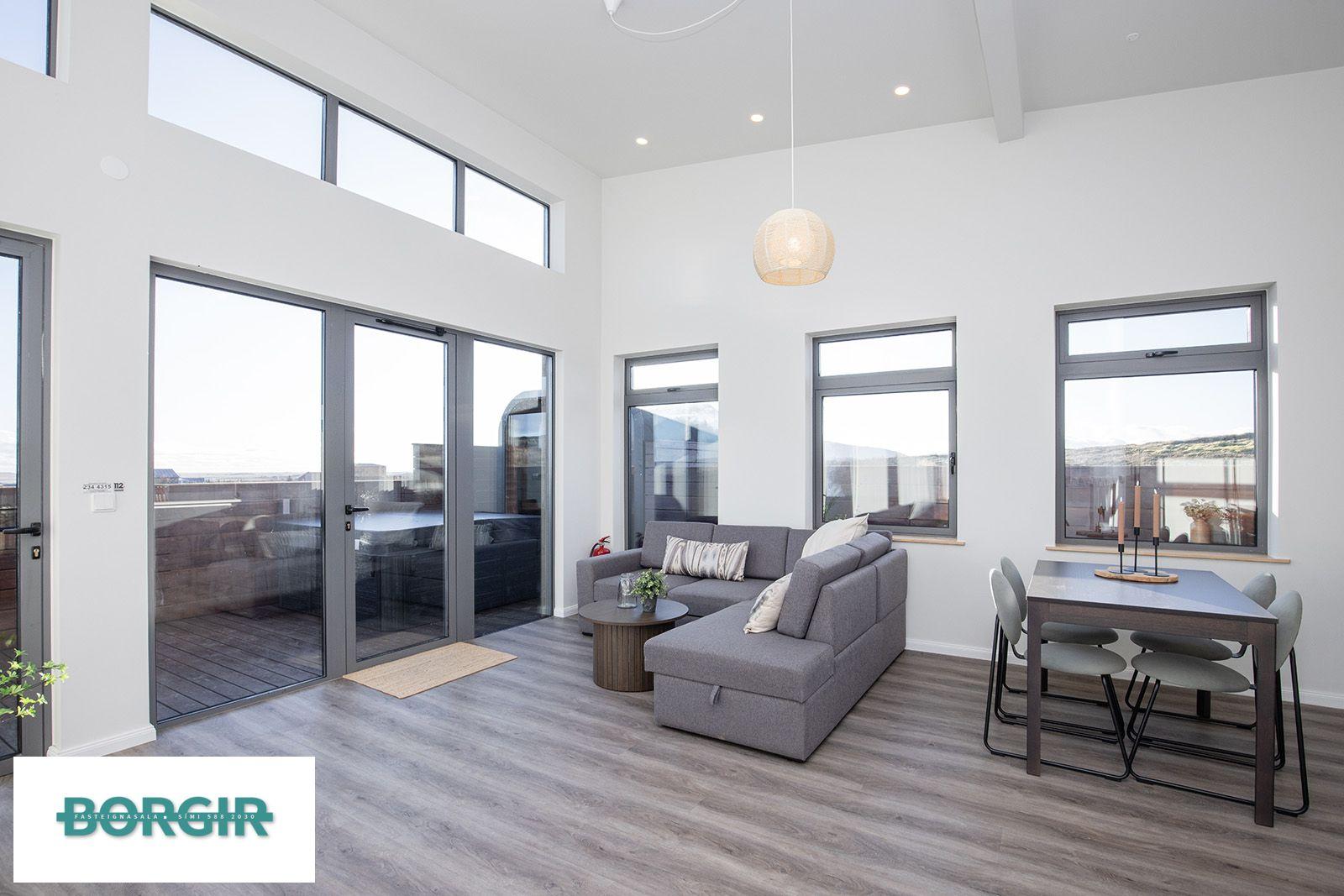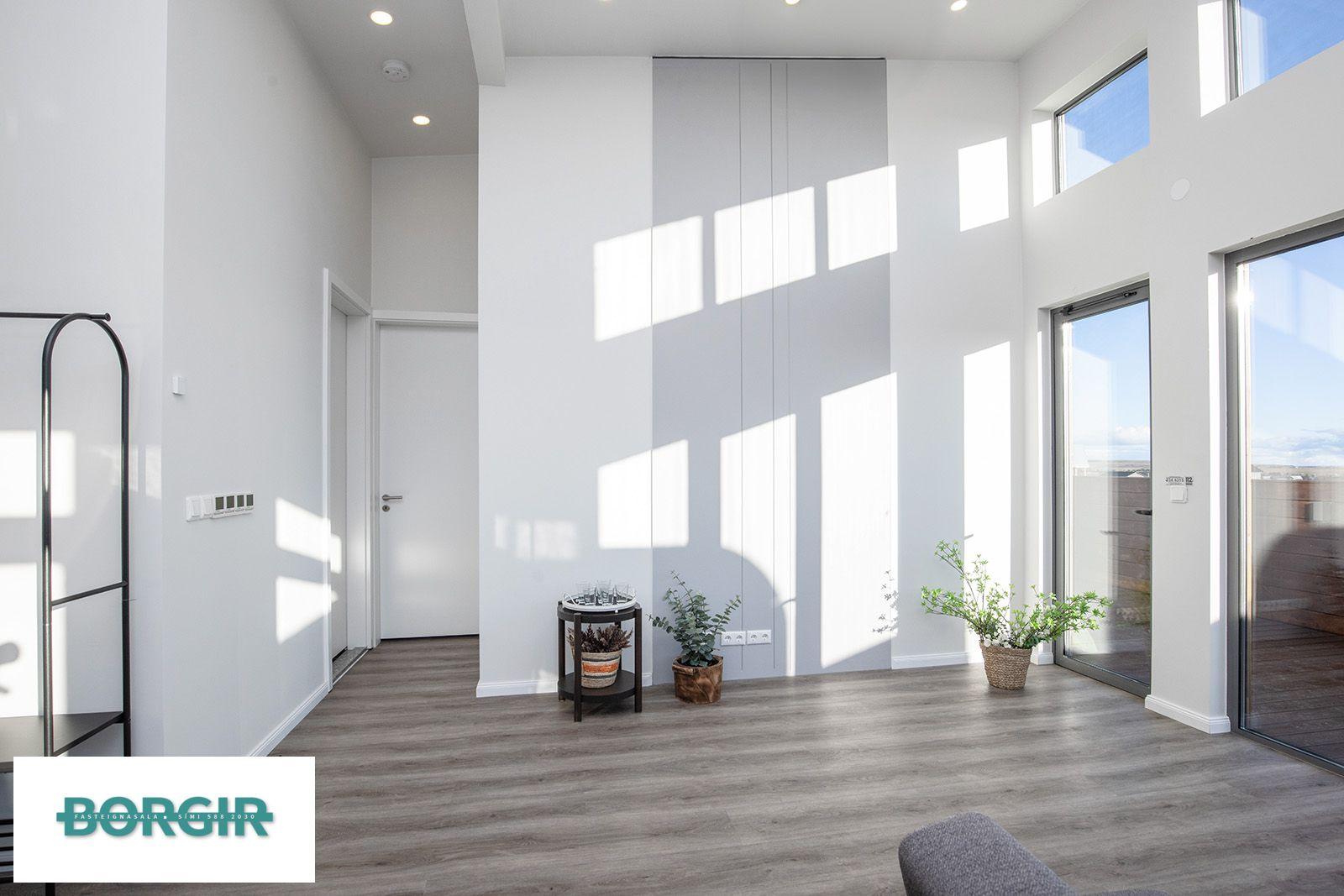 Inngangur: Gengið beint inní stofu/borðstofu með plast parketi á gólfi með gólfsíðum gluggum sem snúa til suðurs, mikilli lofthæð og fallegu útsýni.