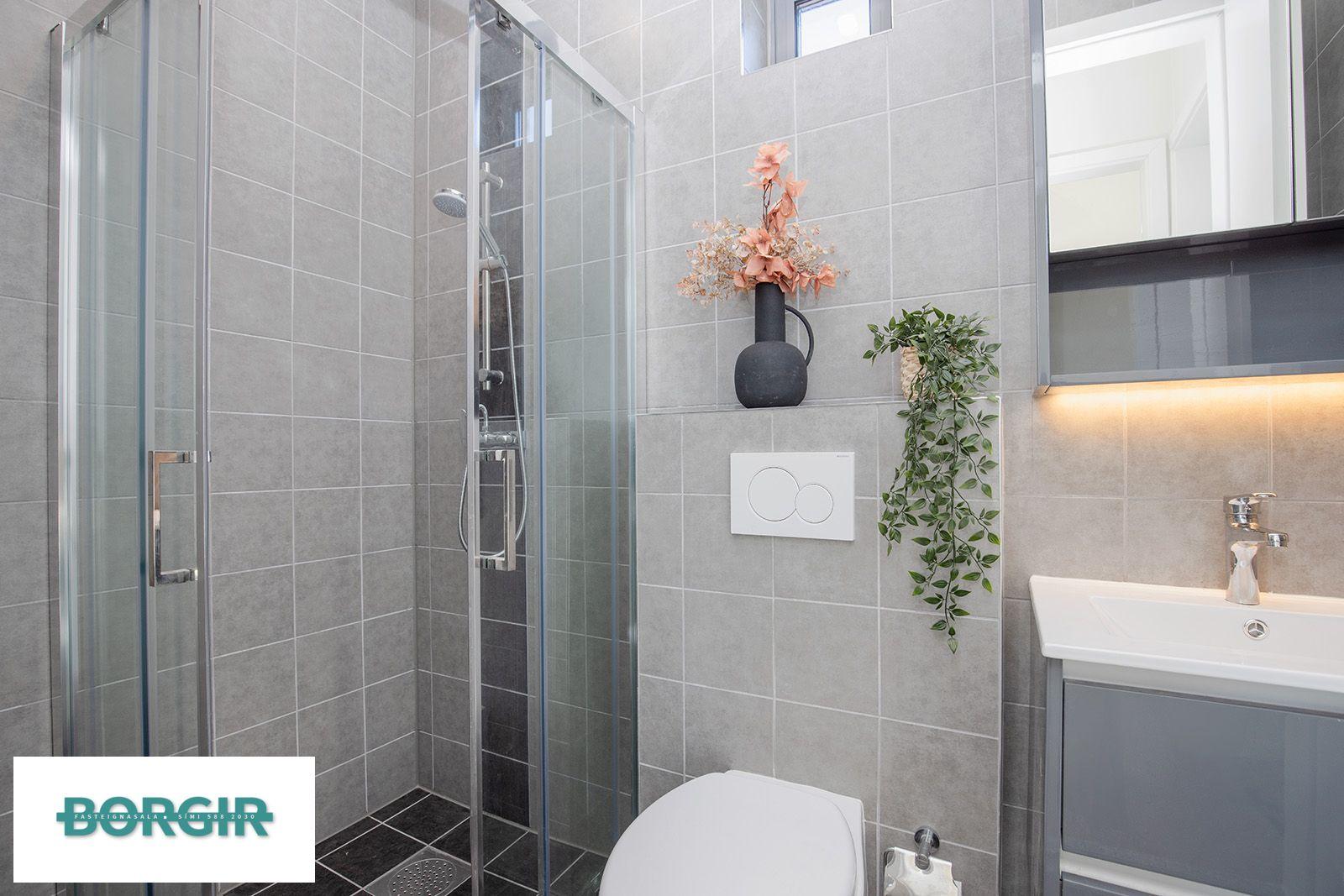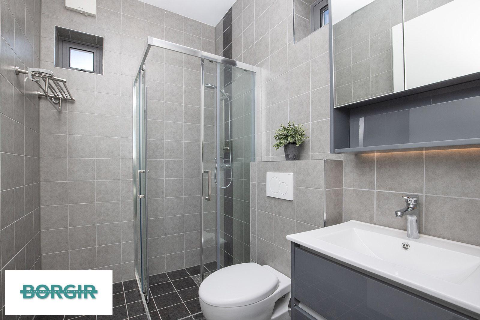 Baðherbergi: Baðinnrétting, Salernið er upphengt. Gólfið er flísalagt og veggir upp í loft, sturtuklefi.