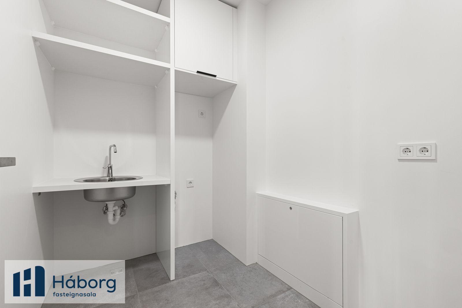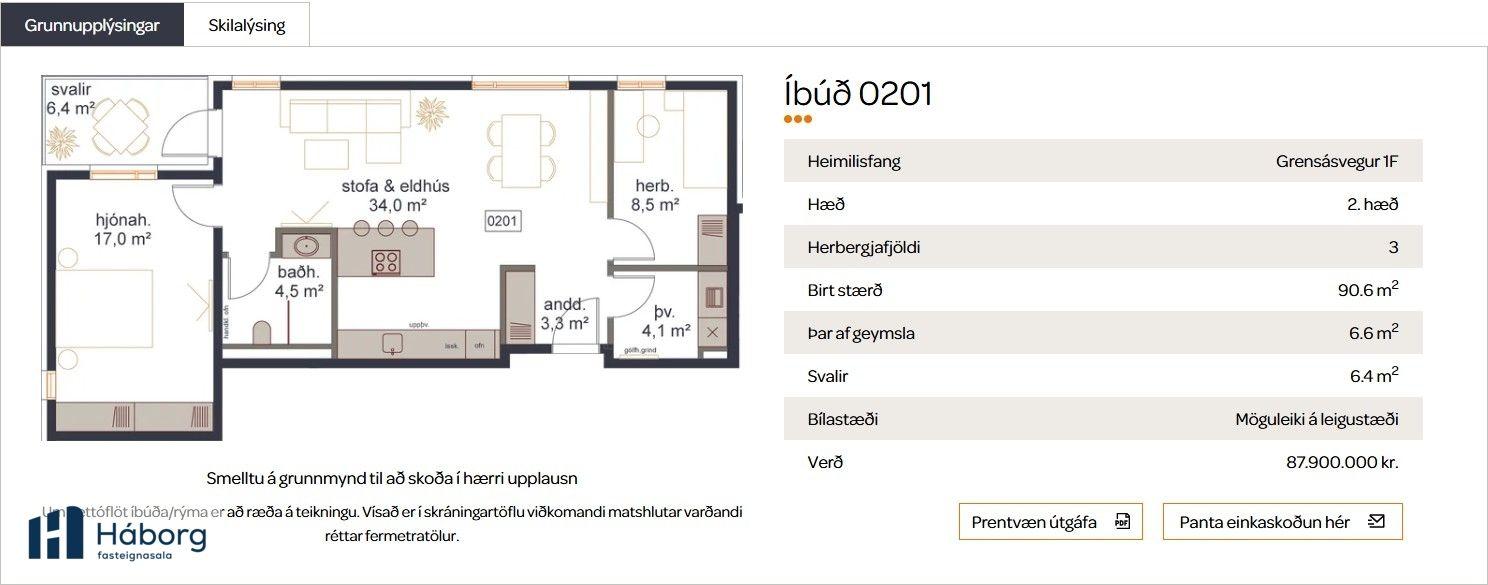 Háborg fasteignasala ehf, Jórunn lögg. fasteignasali og Kristín Rós Magnadóttir lögg. fasteignasali kynna Grensásvegur 1F, nýbygging. Eign á 3.hæð, stærð 90,6 fm, í 108 Reykjavík. Glæsileg 3ja herbergja með fallega innréttuðu alrými, eldhús með eyju sem hægt er að sitja og gengið út á suð-vestur svalir úr stofu, snýr að inngarði. Stofa er rúmgóð og björt með gólfsíðum gluggum. Hjónaherbergið er einnig með gólfsíðum gluggum, það er mjög rúmgott og með góðum skápum. Barnaherbergið er einnig með gólfsíðum gluggum og góðum fataskápum. Baðherbergið er flísalagt að hluta, með sturtu sem gengið er beint inní, óbein lýsing fyrir ofan sturtu, skúffu innrétting undir handlaug og spegill fyrir ofan handlaug einnig með óbeinni lýsingu. Sér þvottahús innan íbúðar með góðri vinnuaðstöðu með skolvaski. Eigninni fylgir geymsla í kjallara að stærð 6,2 fm. Aðgengi að bílakjallara á 3.hæðum. Íbúðin er sýningaríbúð.
