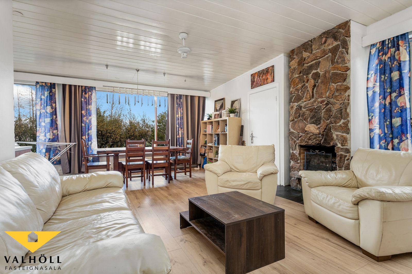 Stofa: Arinn, harðparket á gólfi, hurð út á suðurverönd.